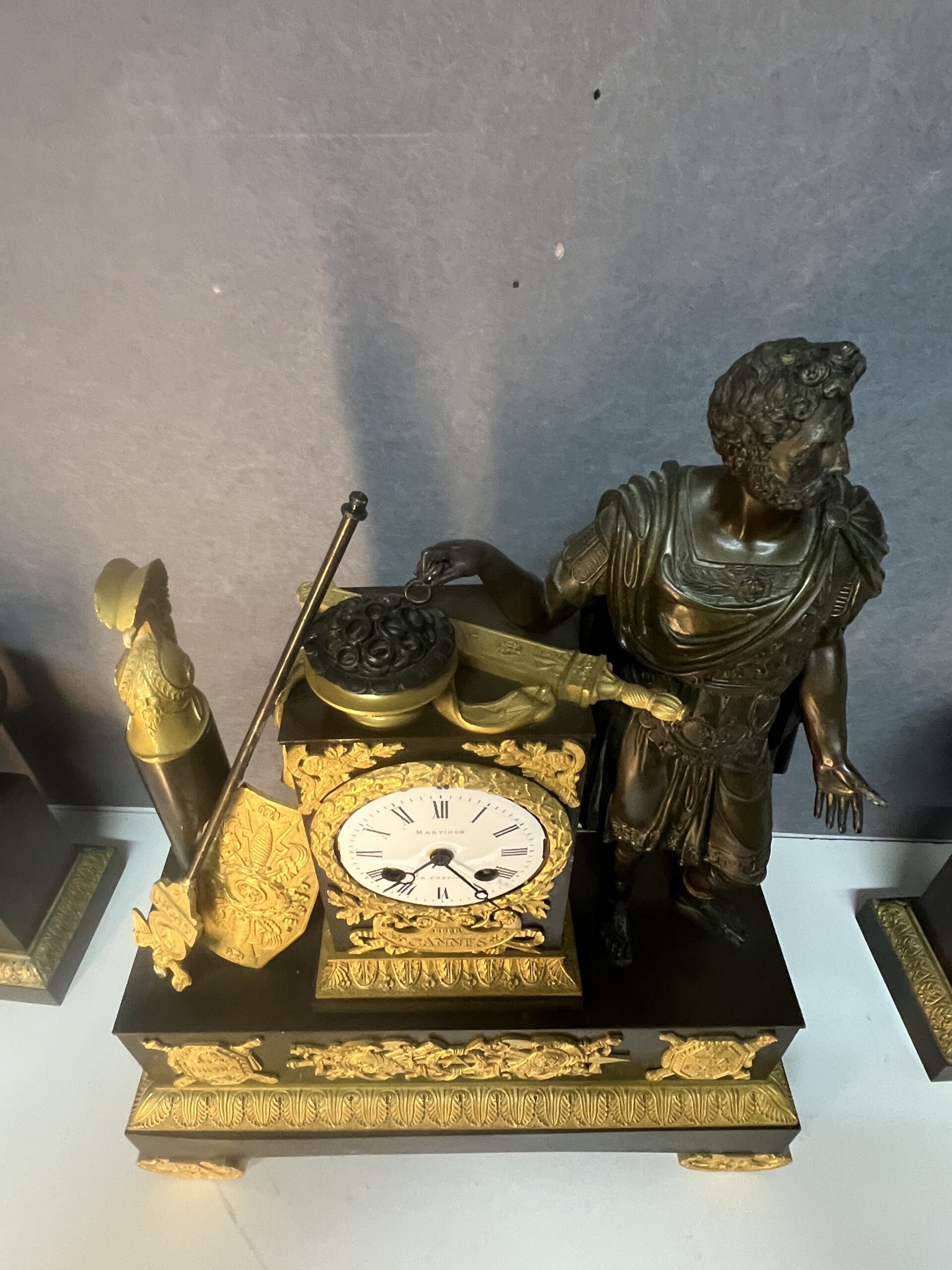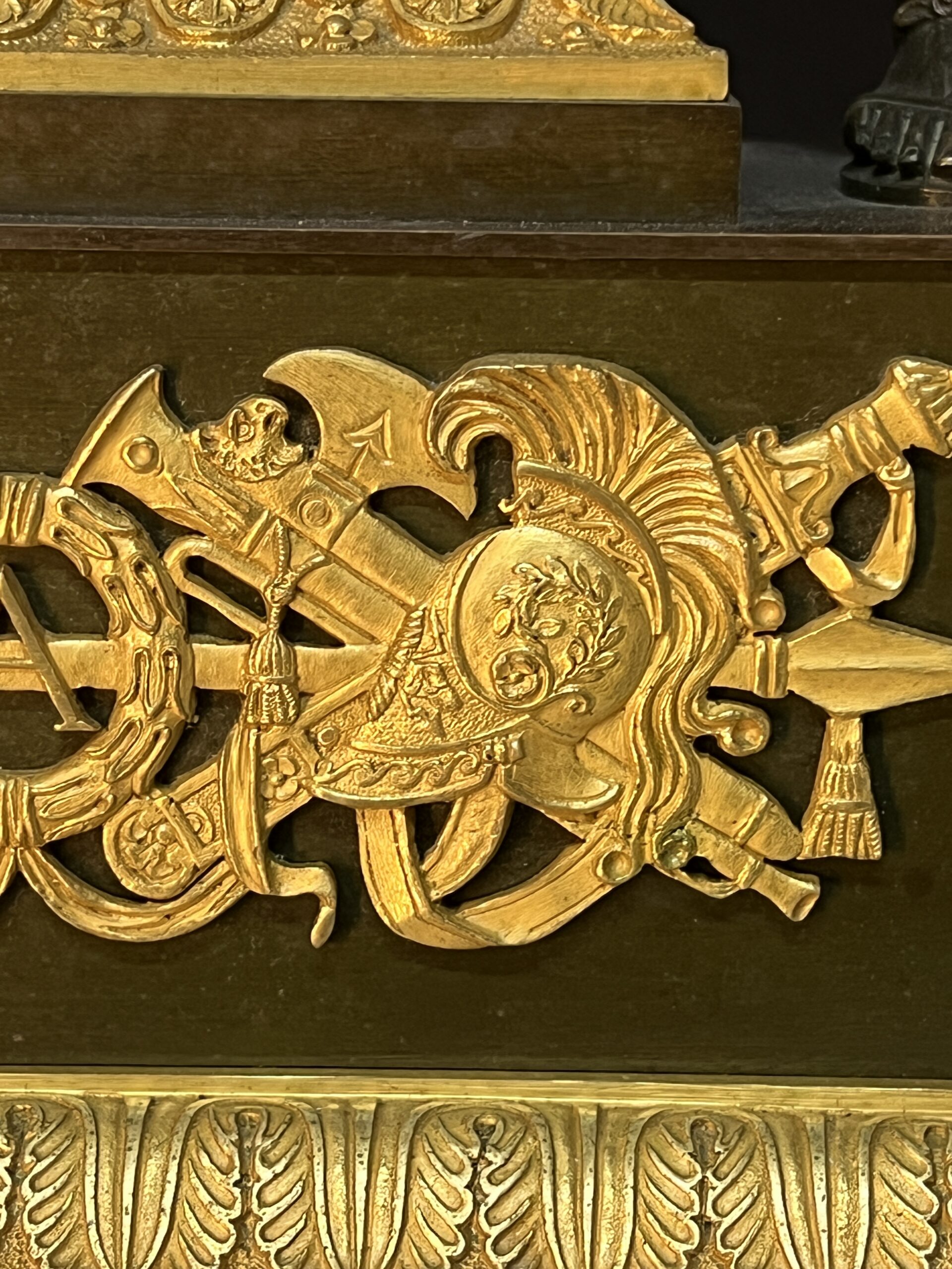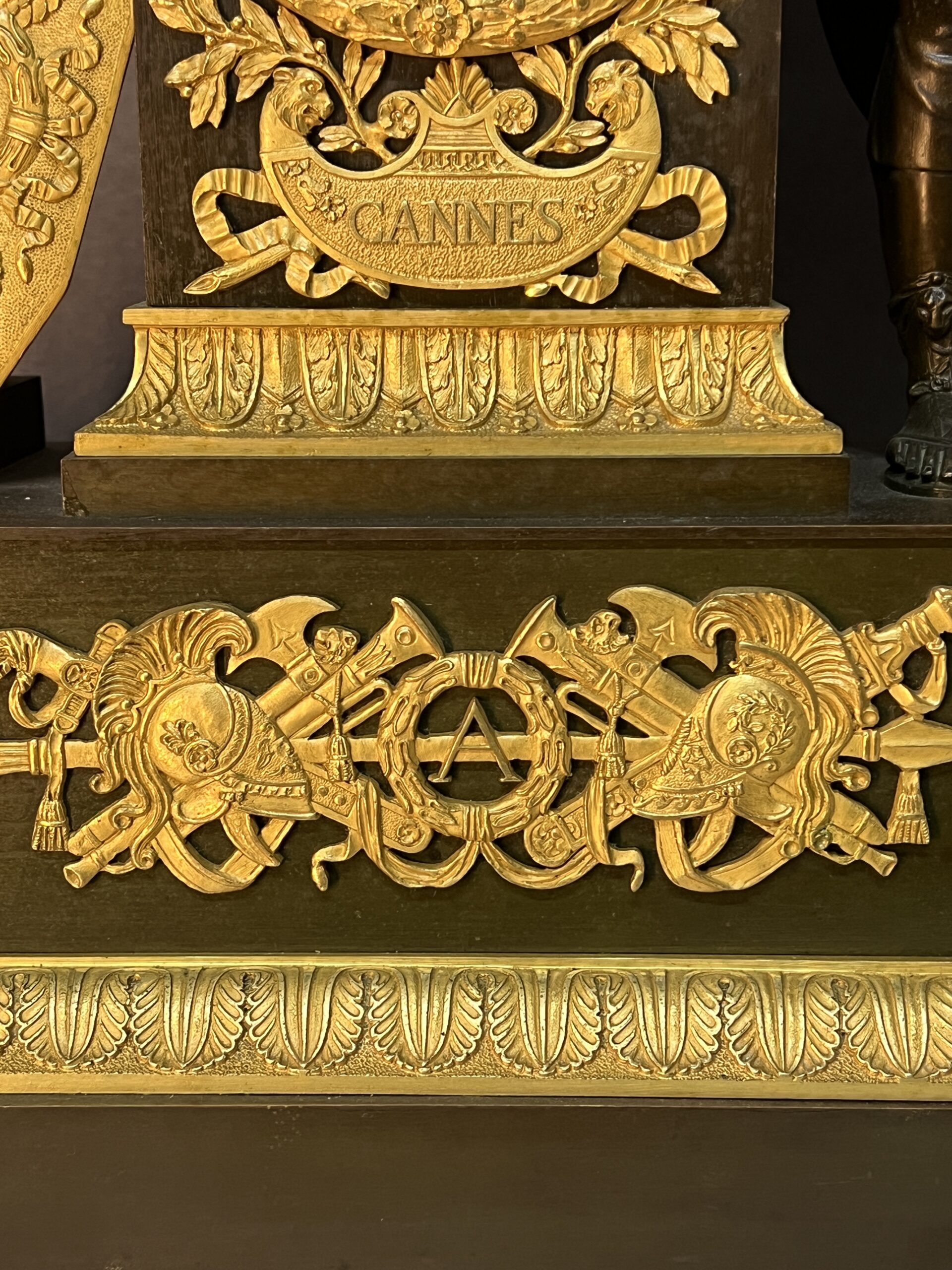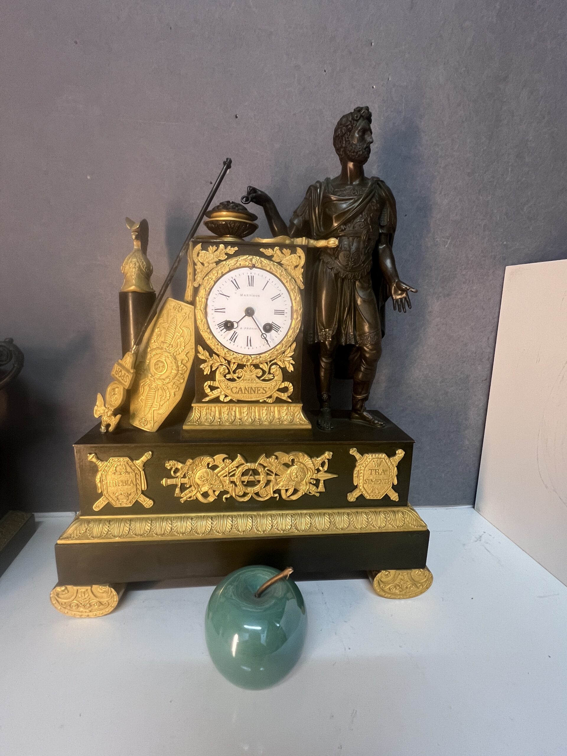 La façade de la pendule est richement décorée de motifs et d’inscriptions évoquant les batailles légendaires de « Cannes », « Trasimène » et « Trébie ».