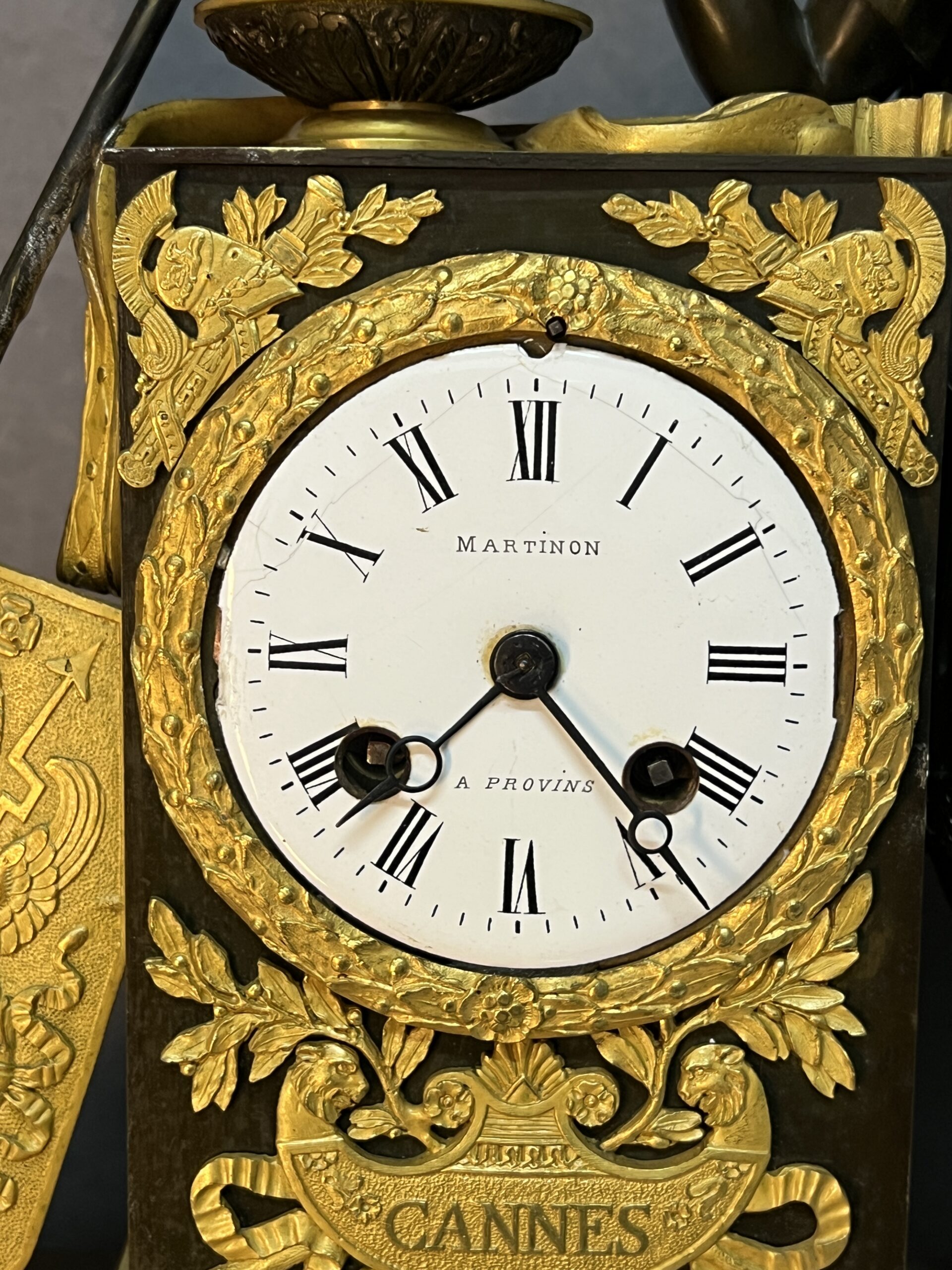 Le cadran émaillé, bien que présentant une fissure qui témoigne de son authenticité et de son âge vénérable, est signé « Martinon à Provin ».