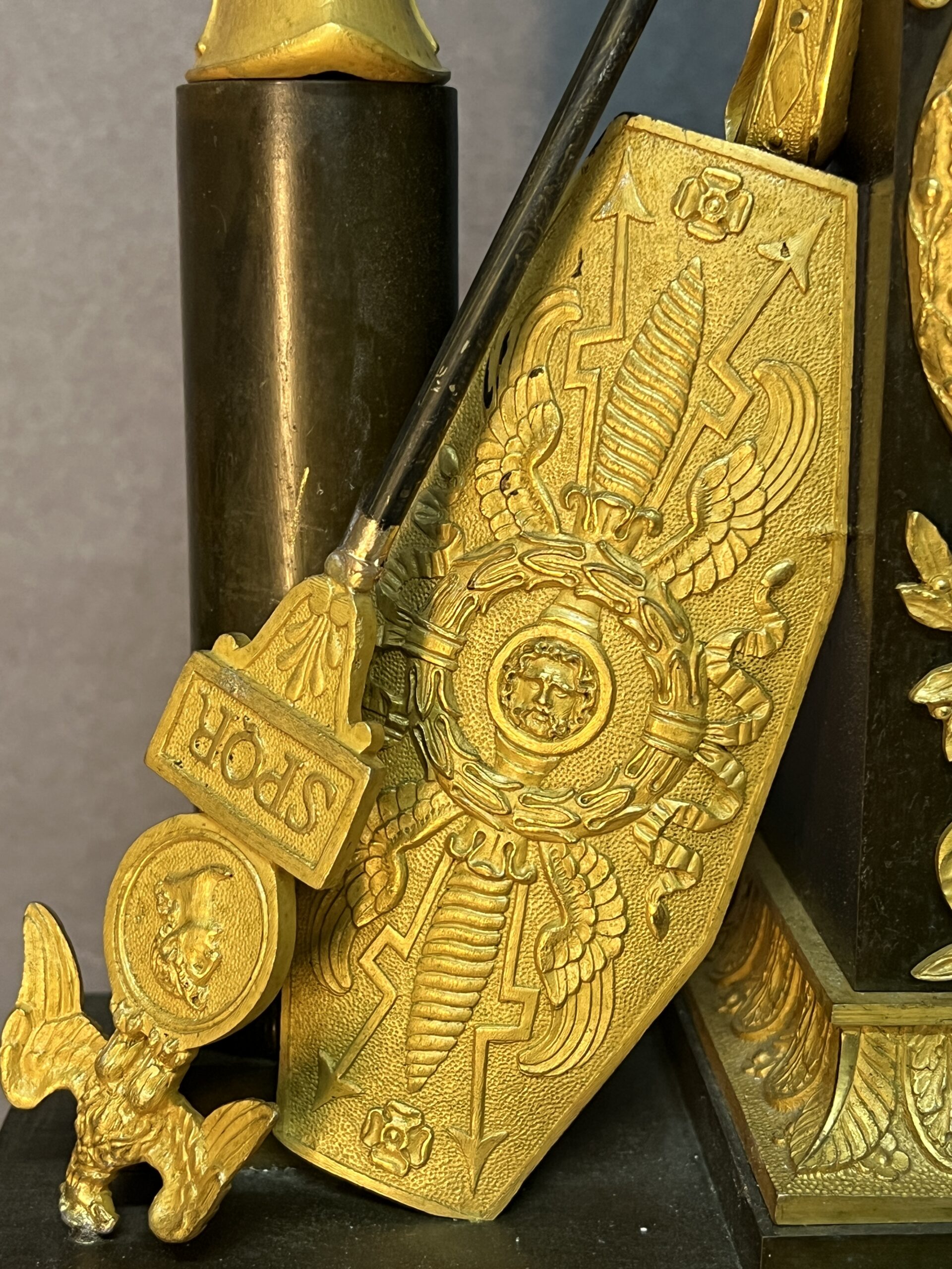 Les ornements en bronze doré, les finitions soignées et les symboles historiques en font un objet de collection aussi bien qu’un élément de décoration raffiné.