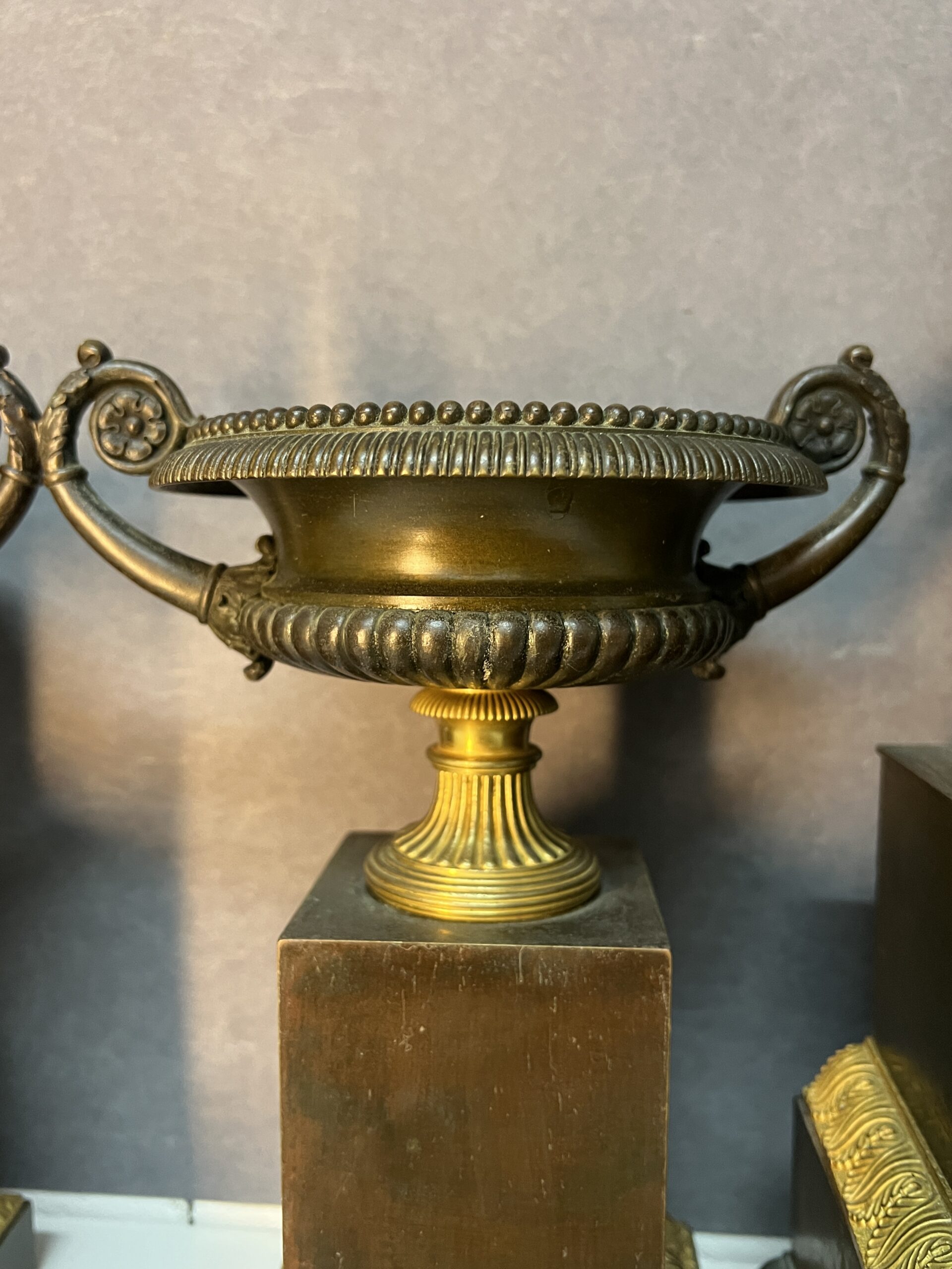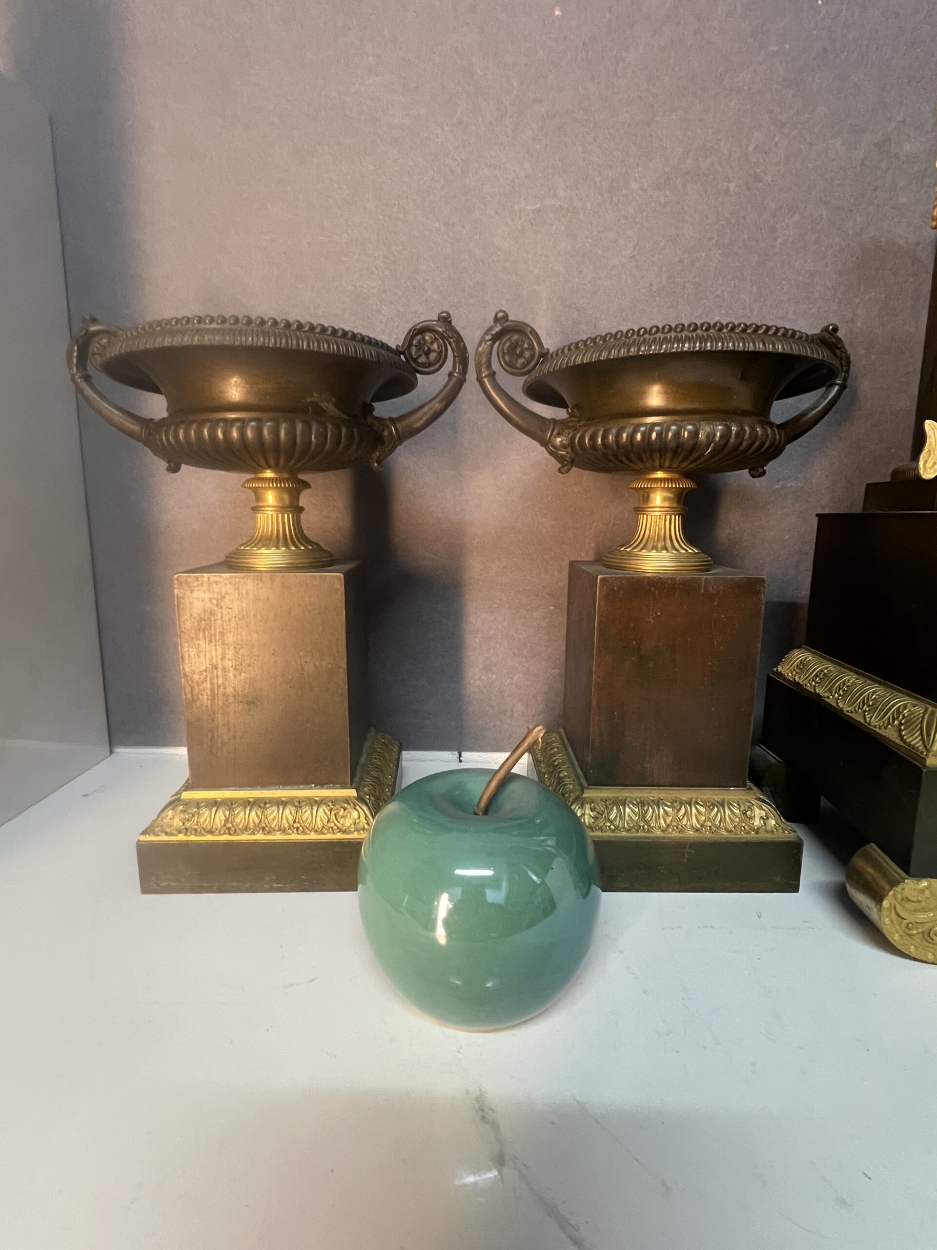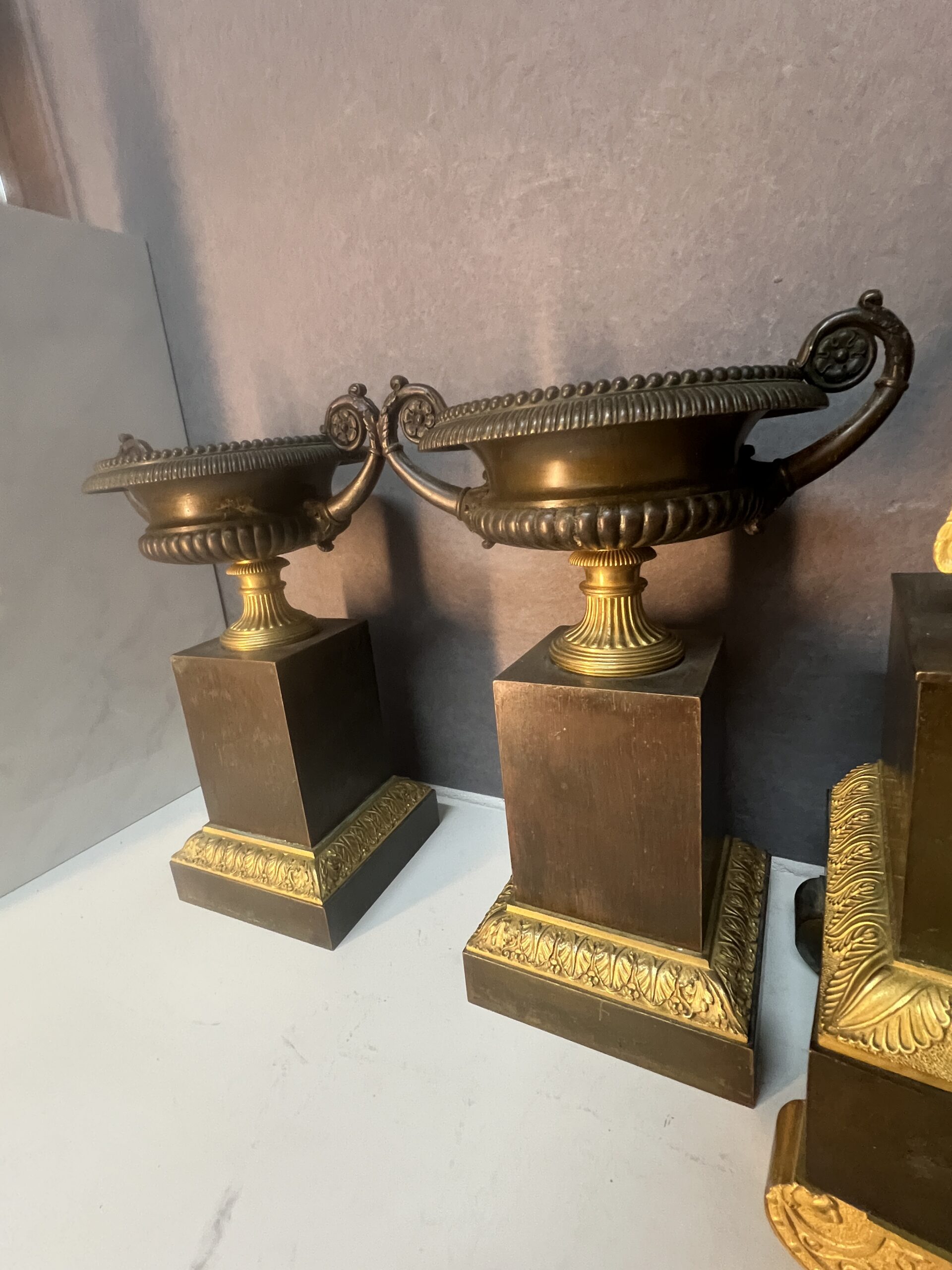 La pendule est accompagnée de deux cassolettes assorties, ajoutant une symétrie harmonieuse à l’ensemble et renforçant son caractère monumental.