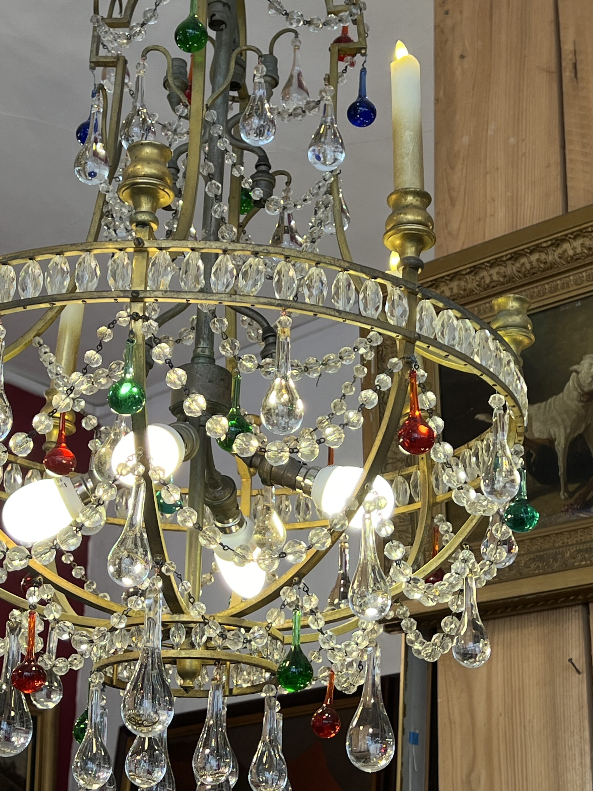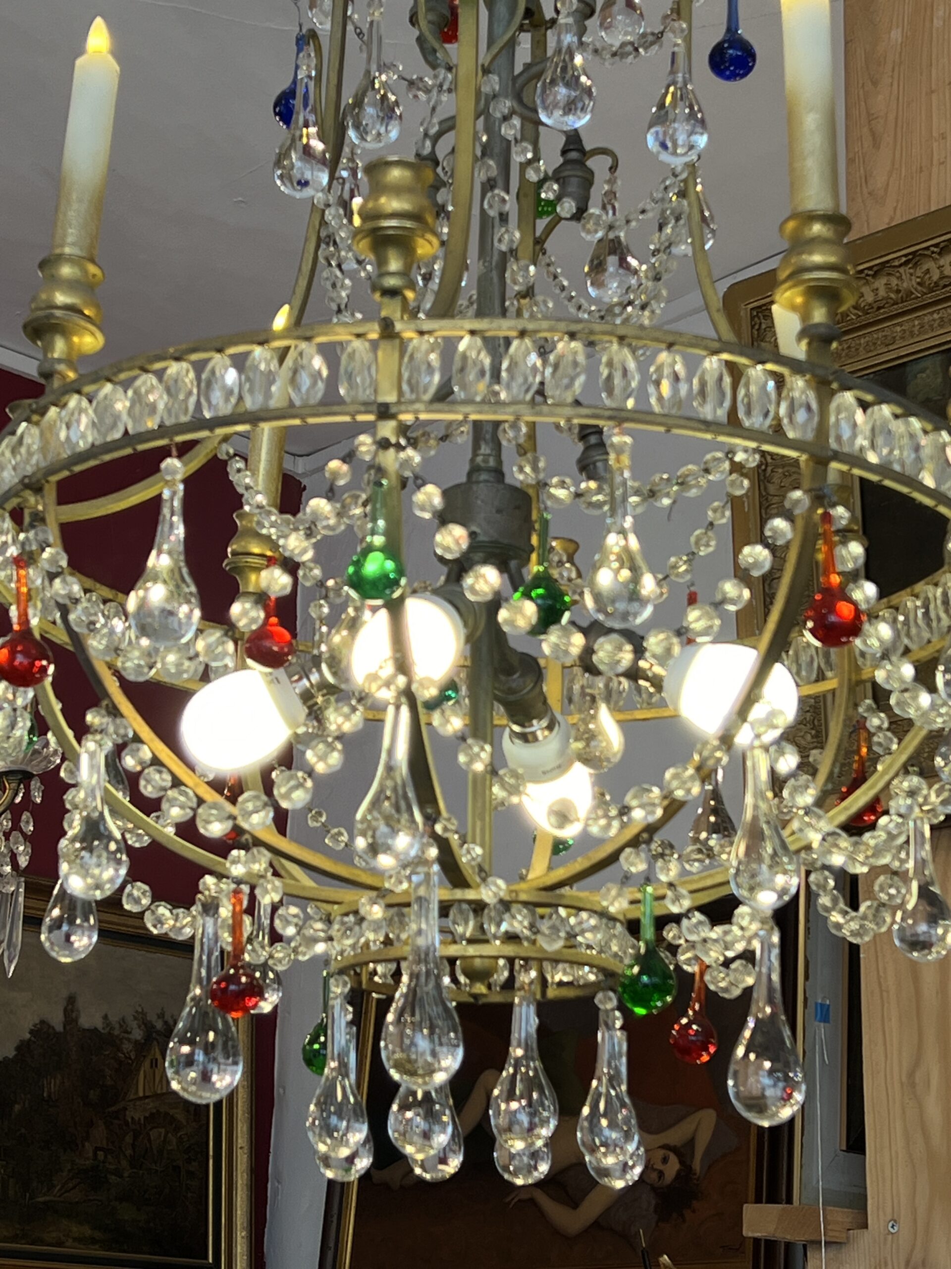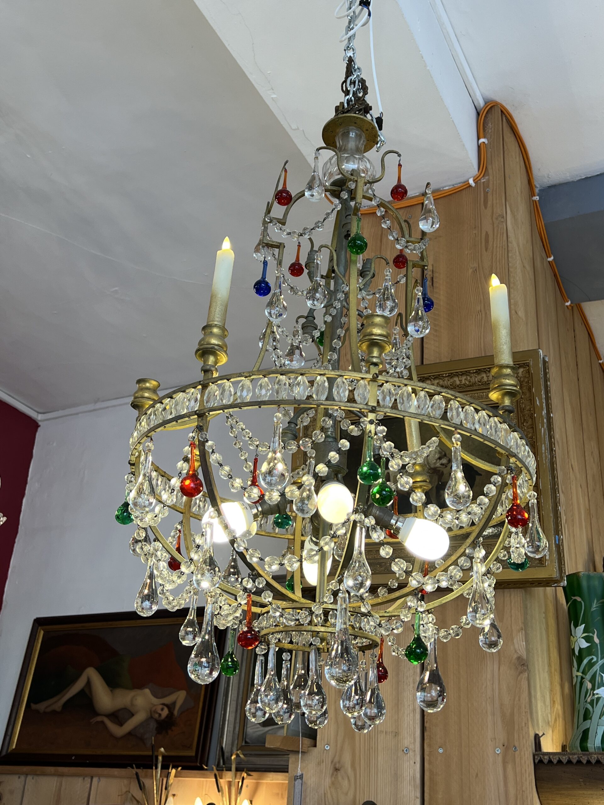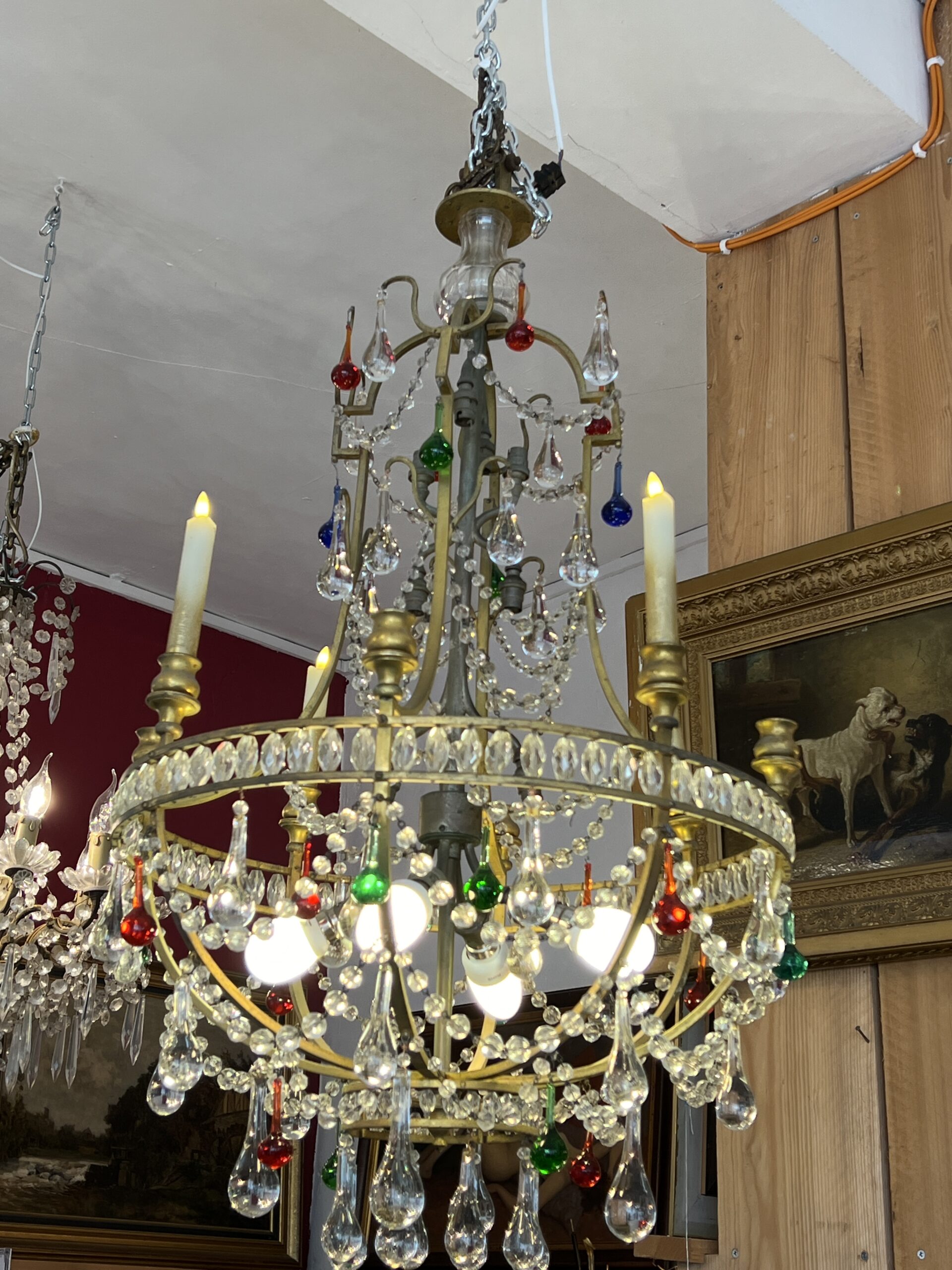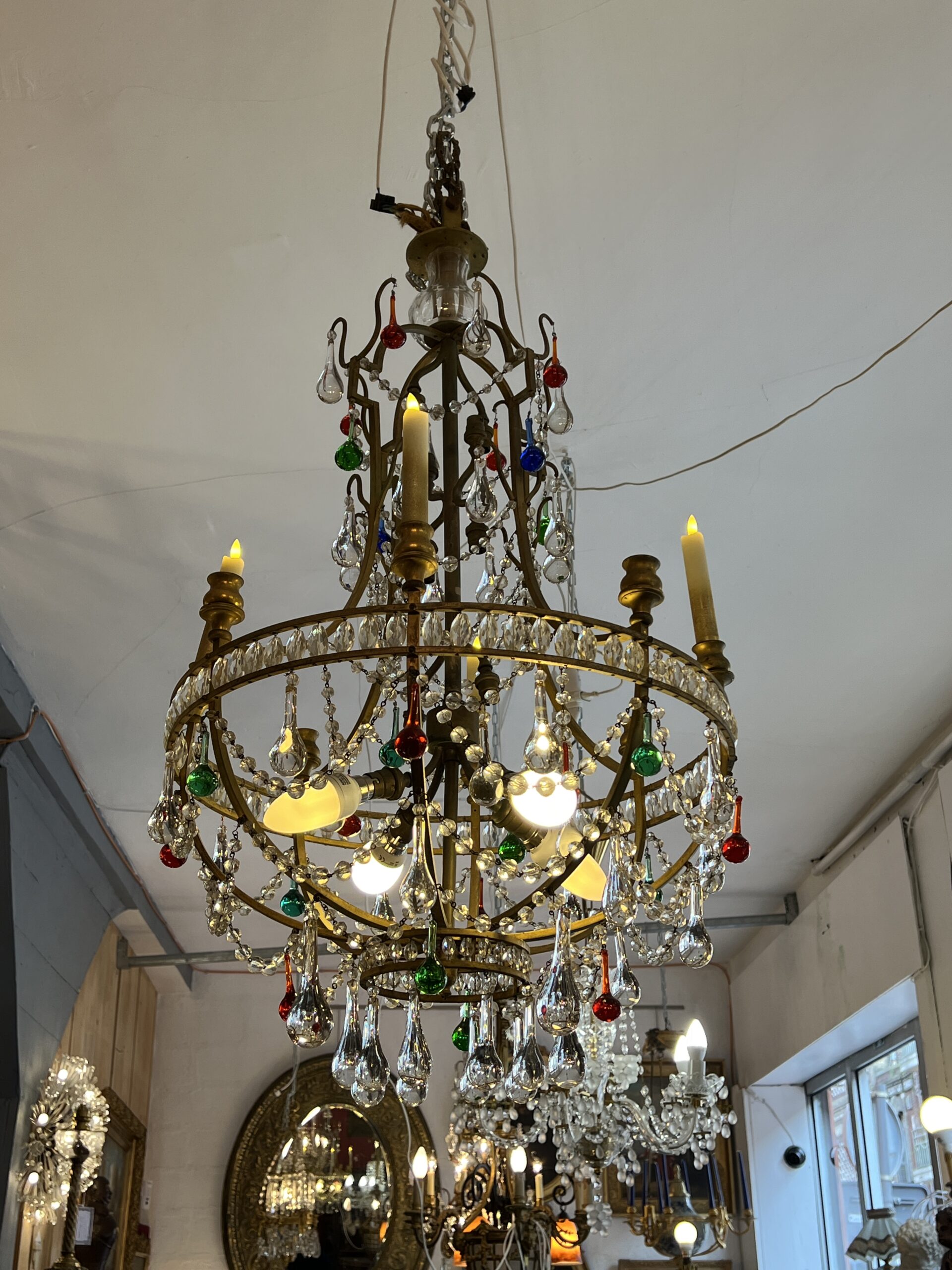 Magnifique lustre à corbeille et pendeloques à Goutte d’eau de couleur