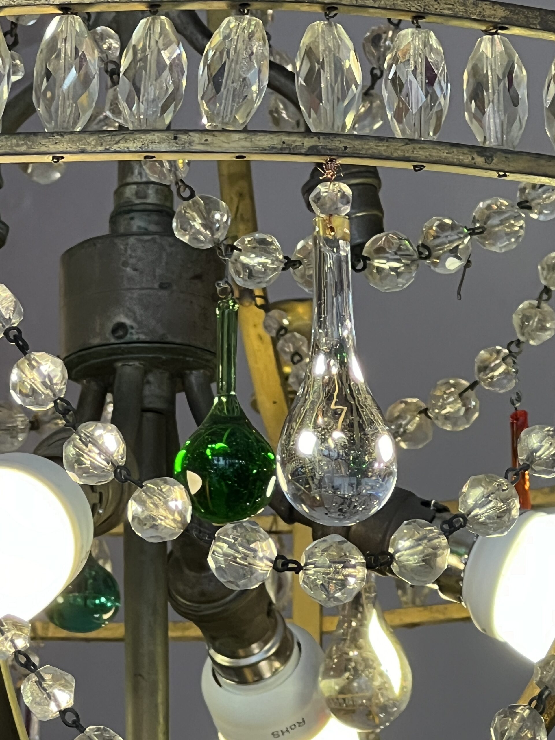 Orné de pendeloques ou pampilles à goutte d’eau de couleur, ce lustre ne se contente pas d’éclairer l’espace, il le transforme en un spectacle visuel captivant. Les pendeloques, avec leurs reflets chatoyants, captent la lumière et la diffusent en mille éclats scintillants, créant ainsi une atmosphère enchanteresse et féérique. Chaque goutte d’eau semble suspendue dans l’air, ajoutant une dimension de mystère et de magie à l’ensemble.