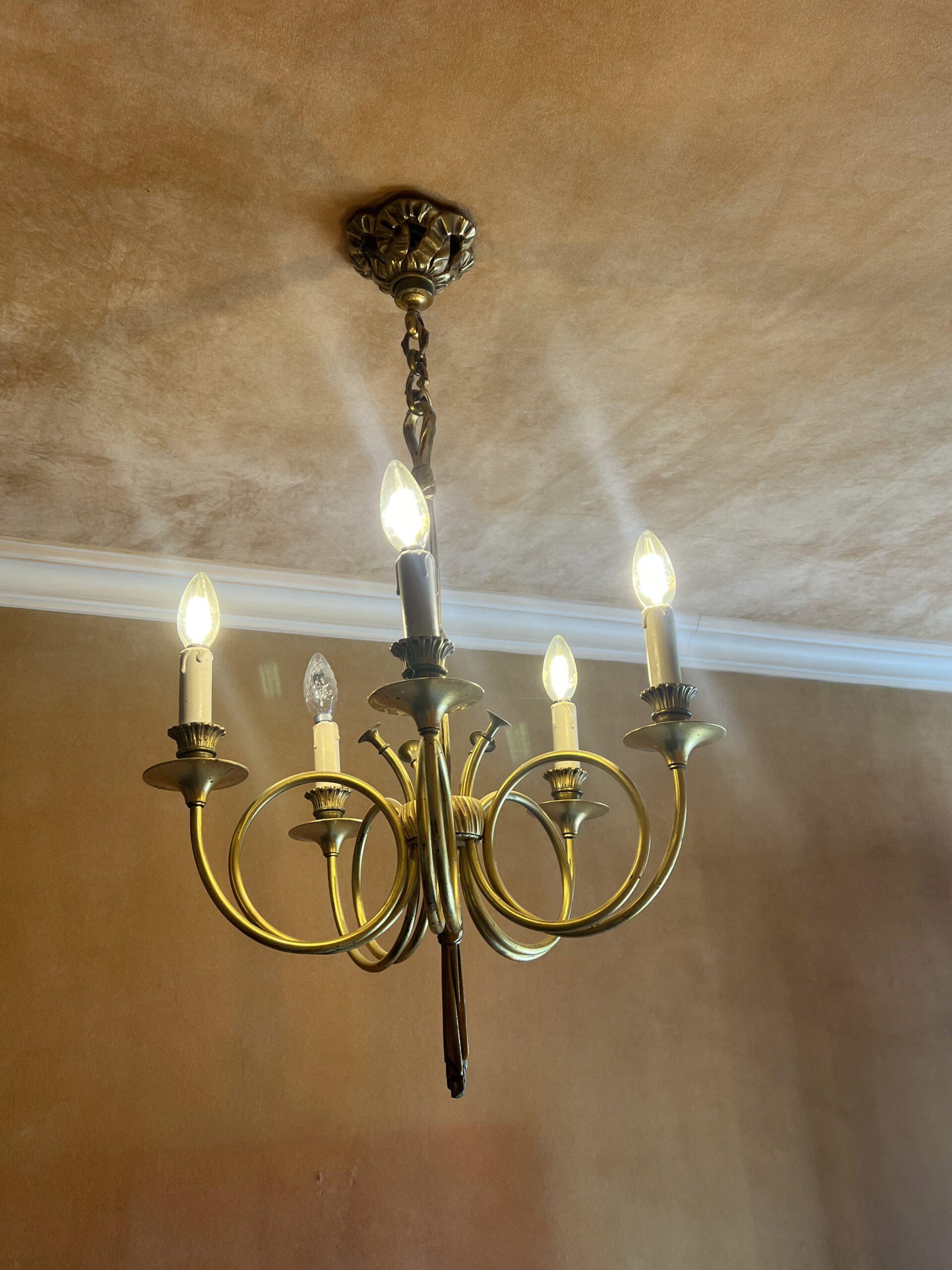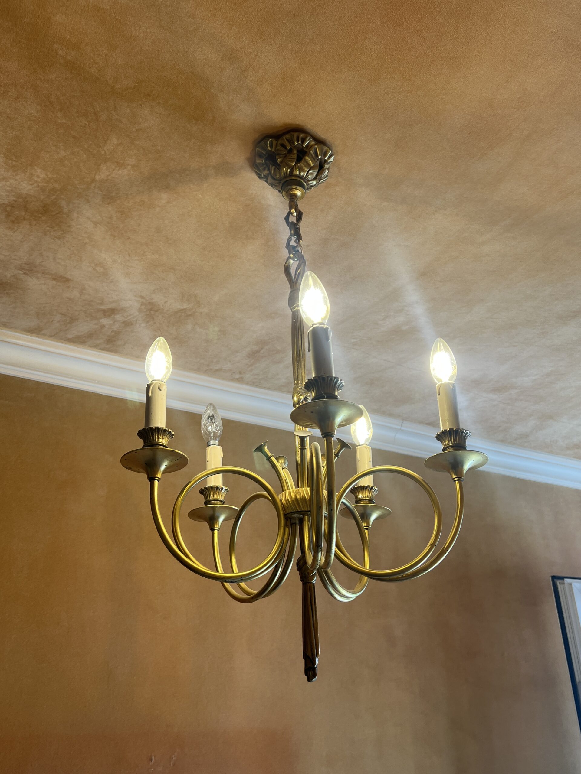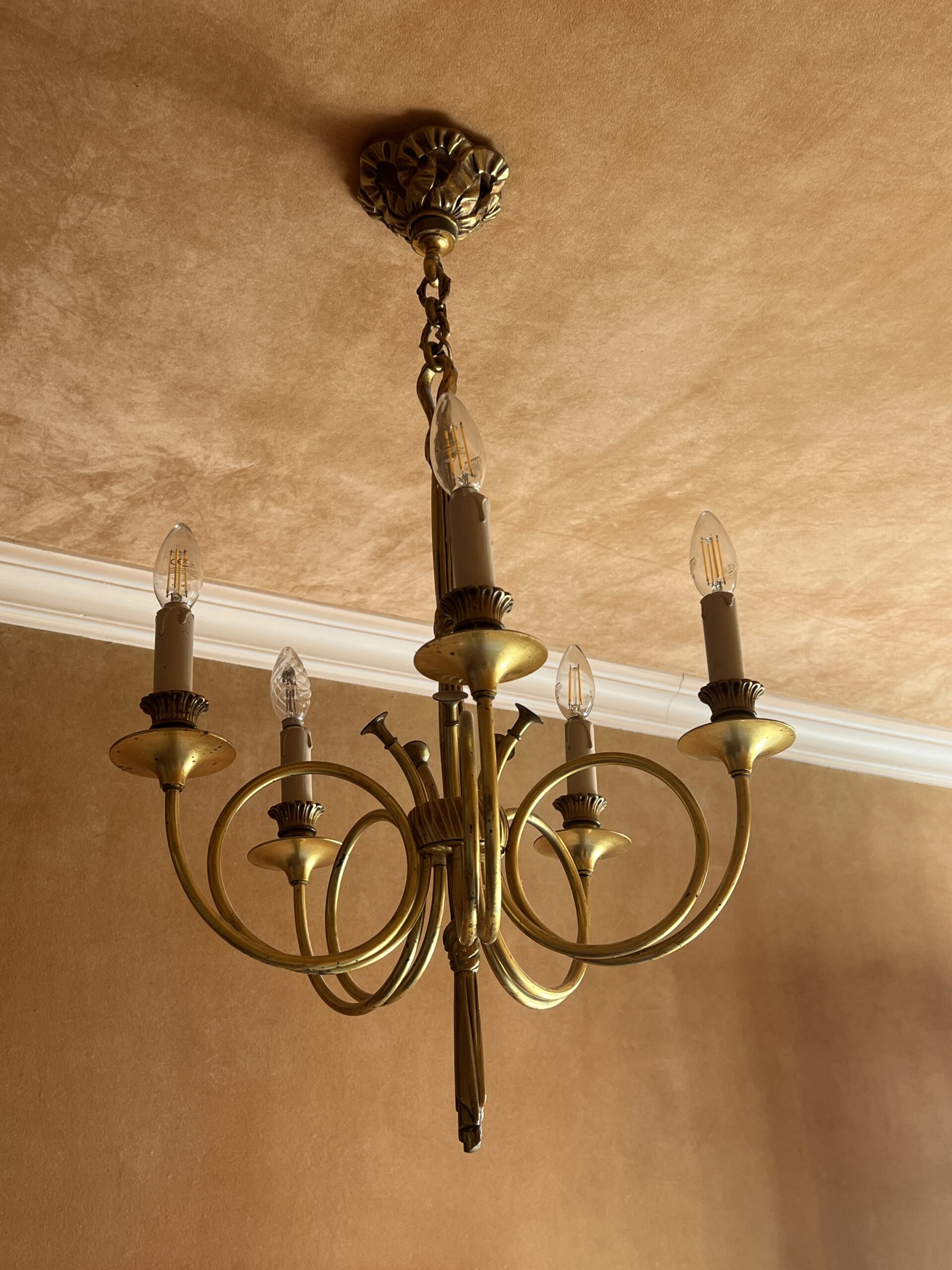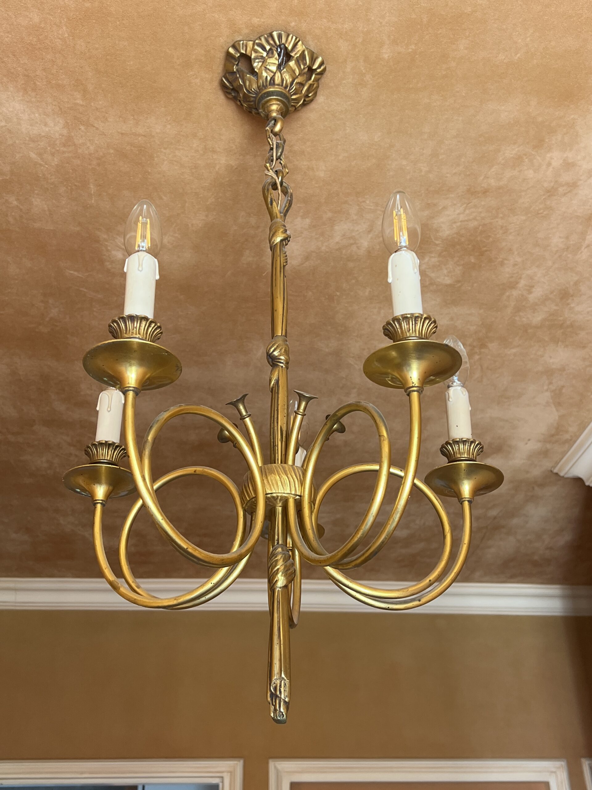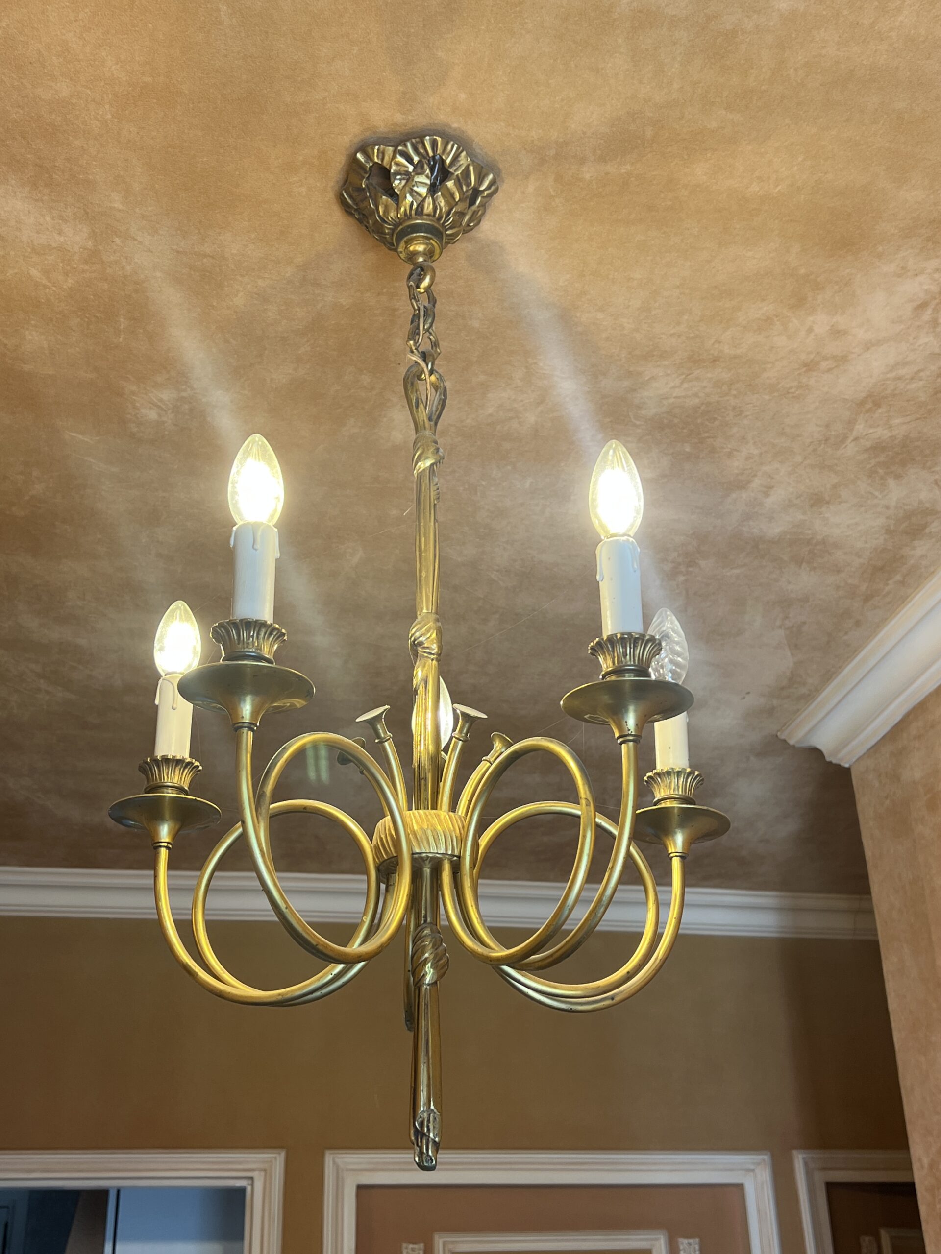Ce lustre en laiton doré et bronze est une pièce d’exception, alliant élégance intemporelle et savoir-faire artisanal.