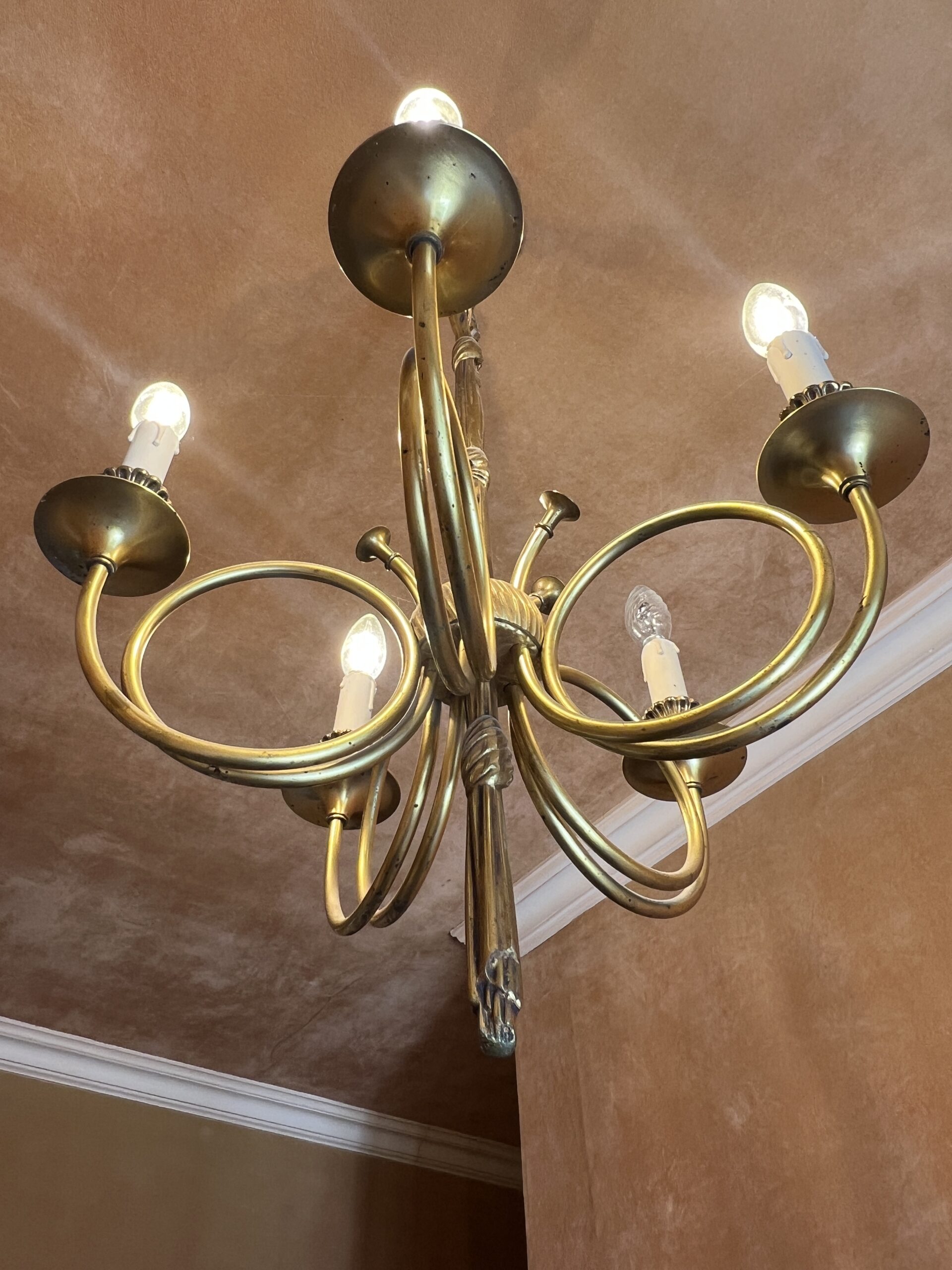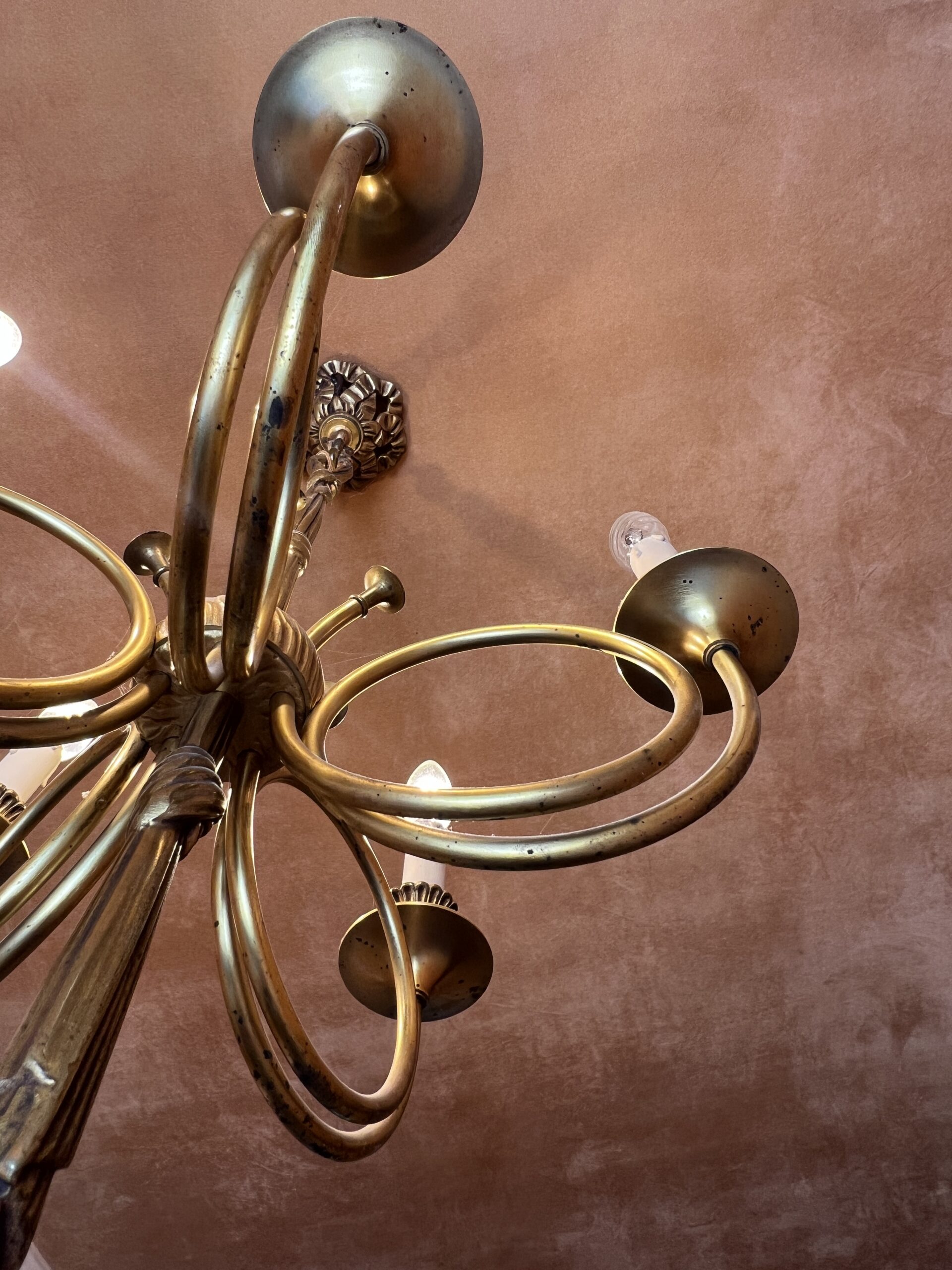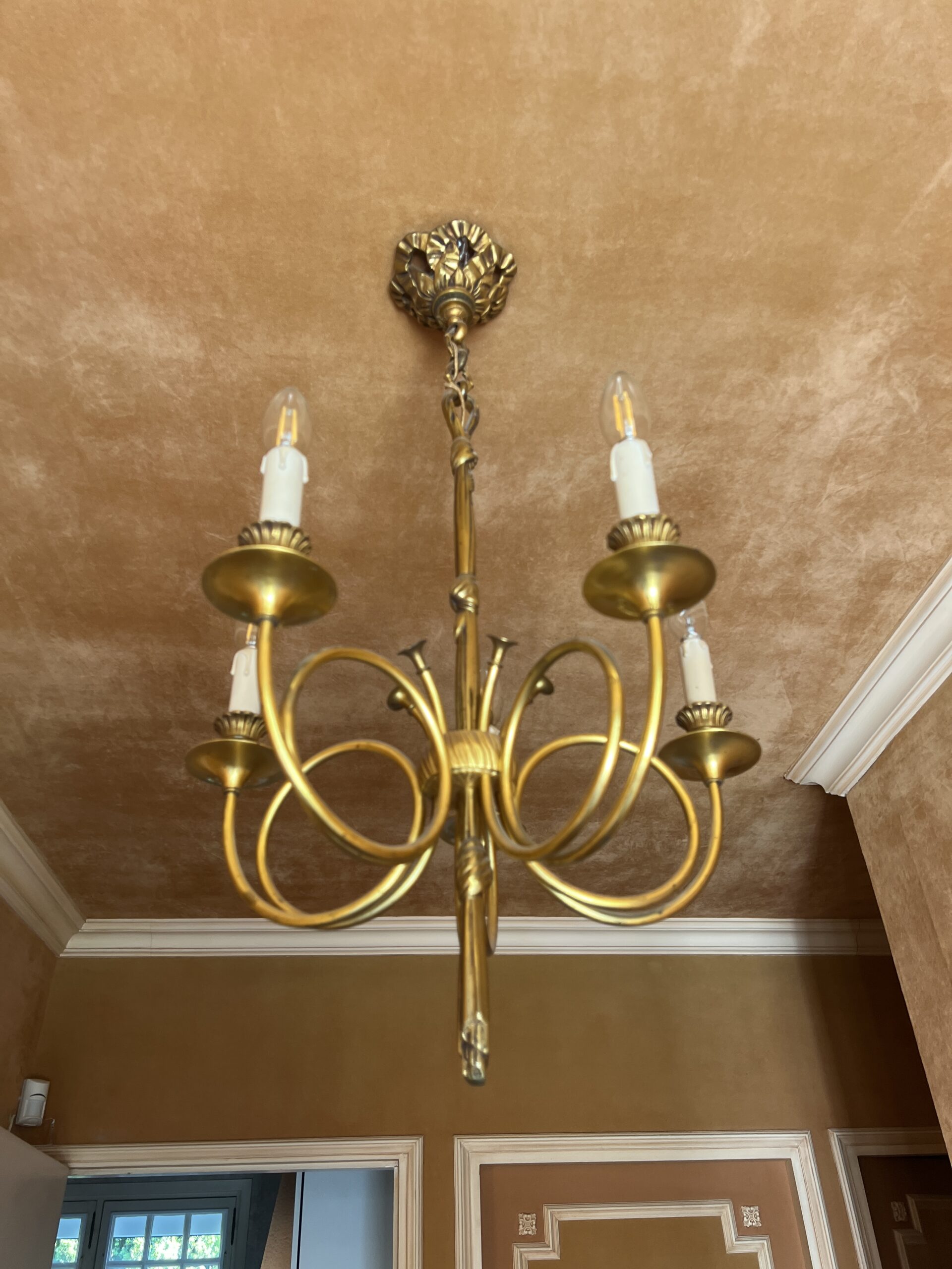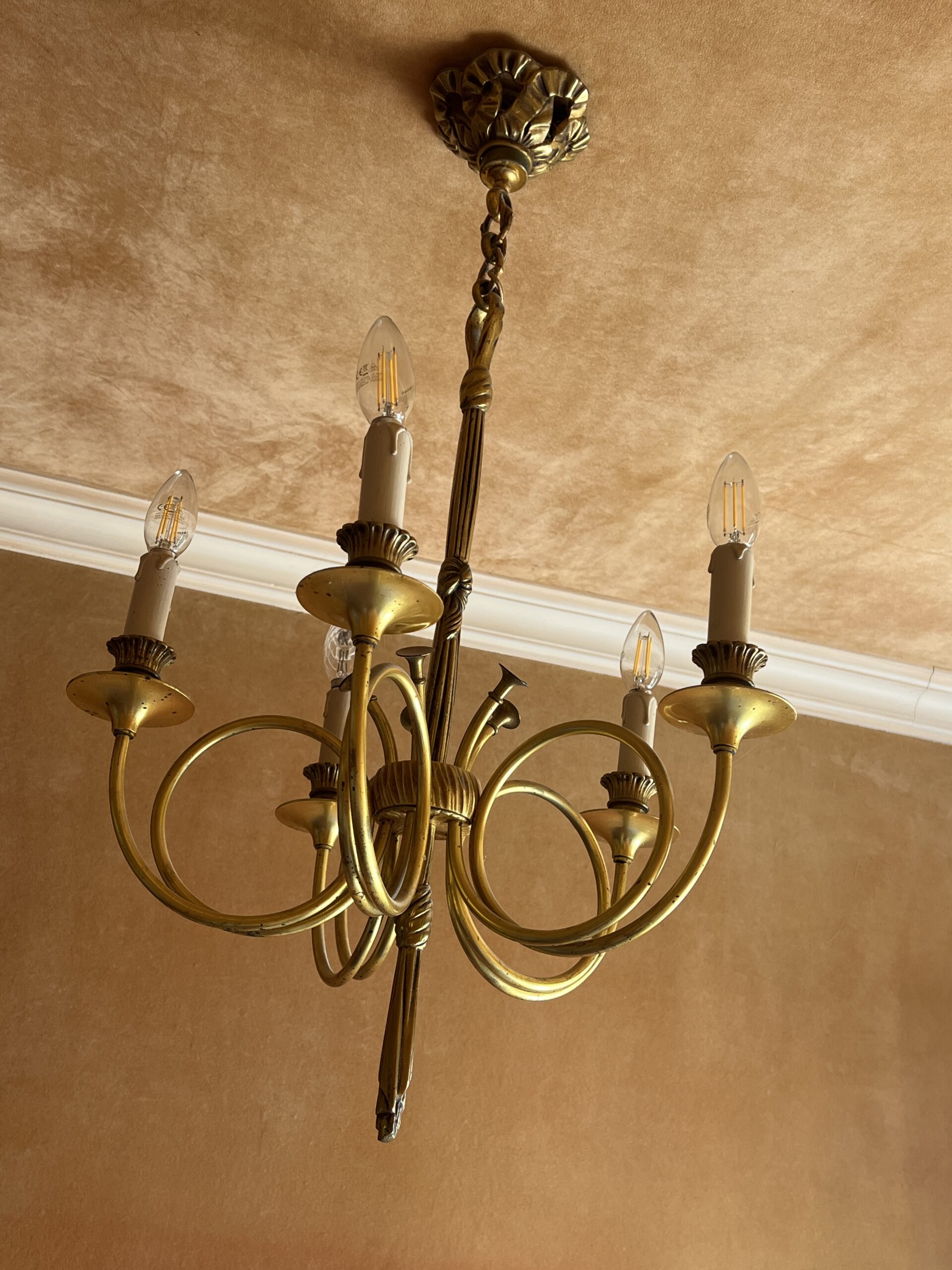 Ce lustre en laiton doré et bronze est une pièce d’exception, alliant élégance intemporelle et savoir-faire artisanal.