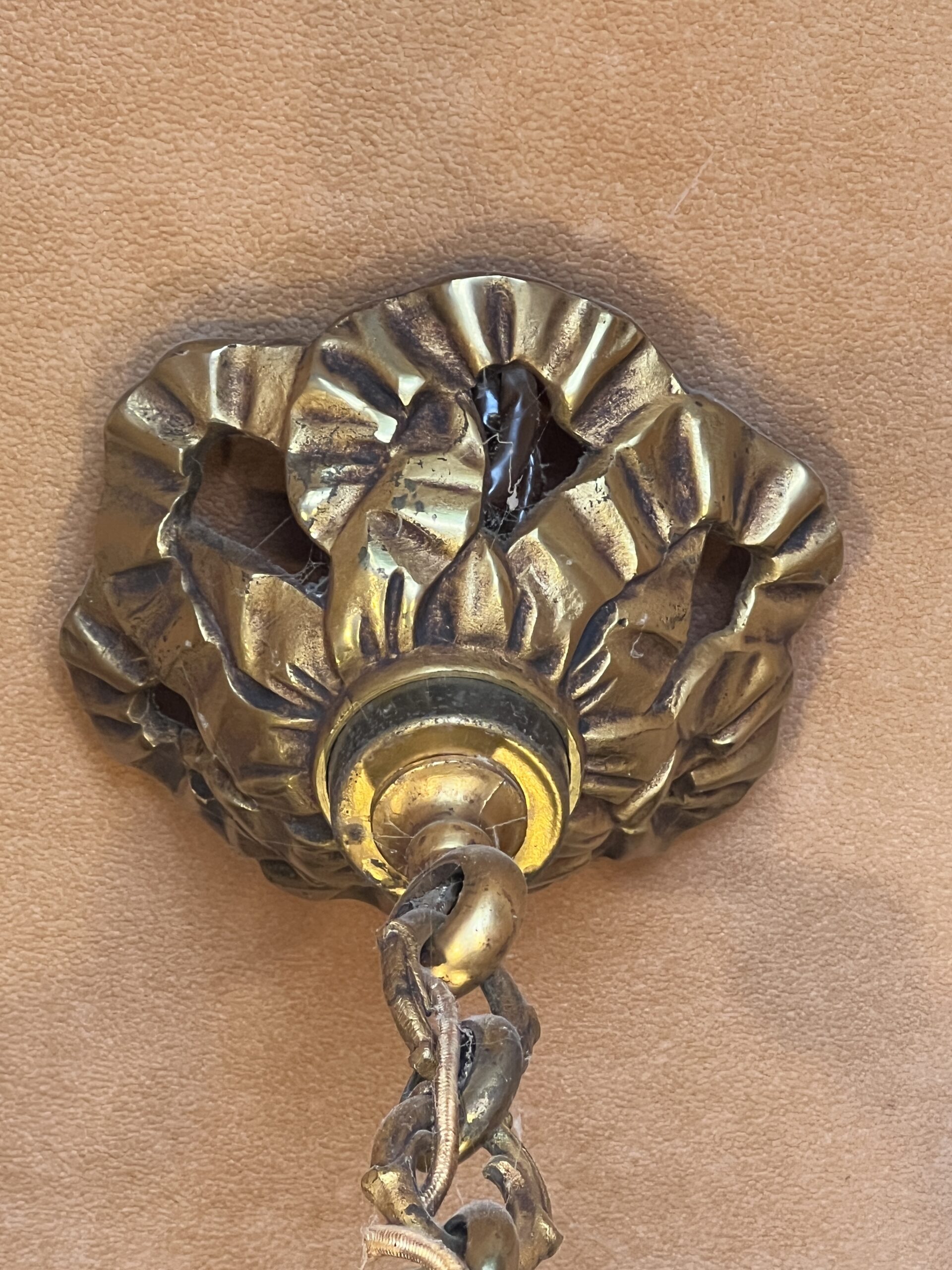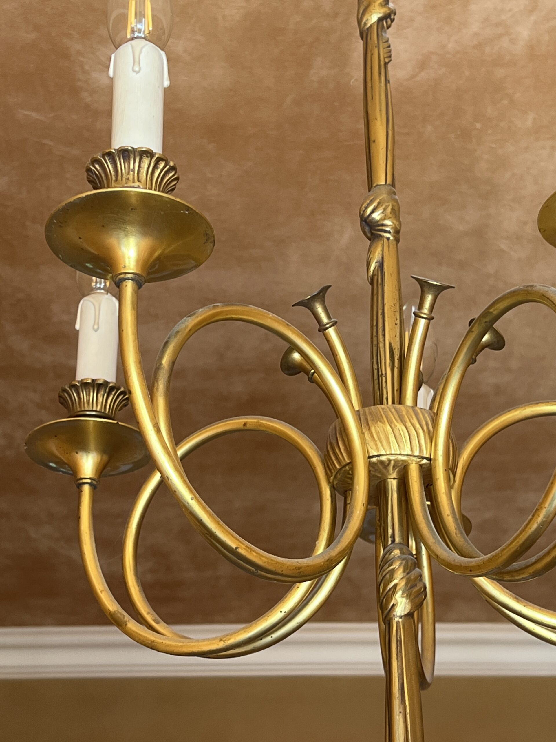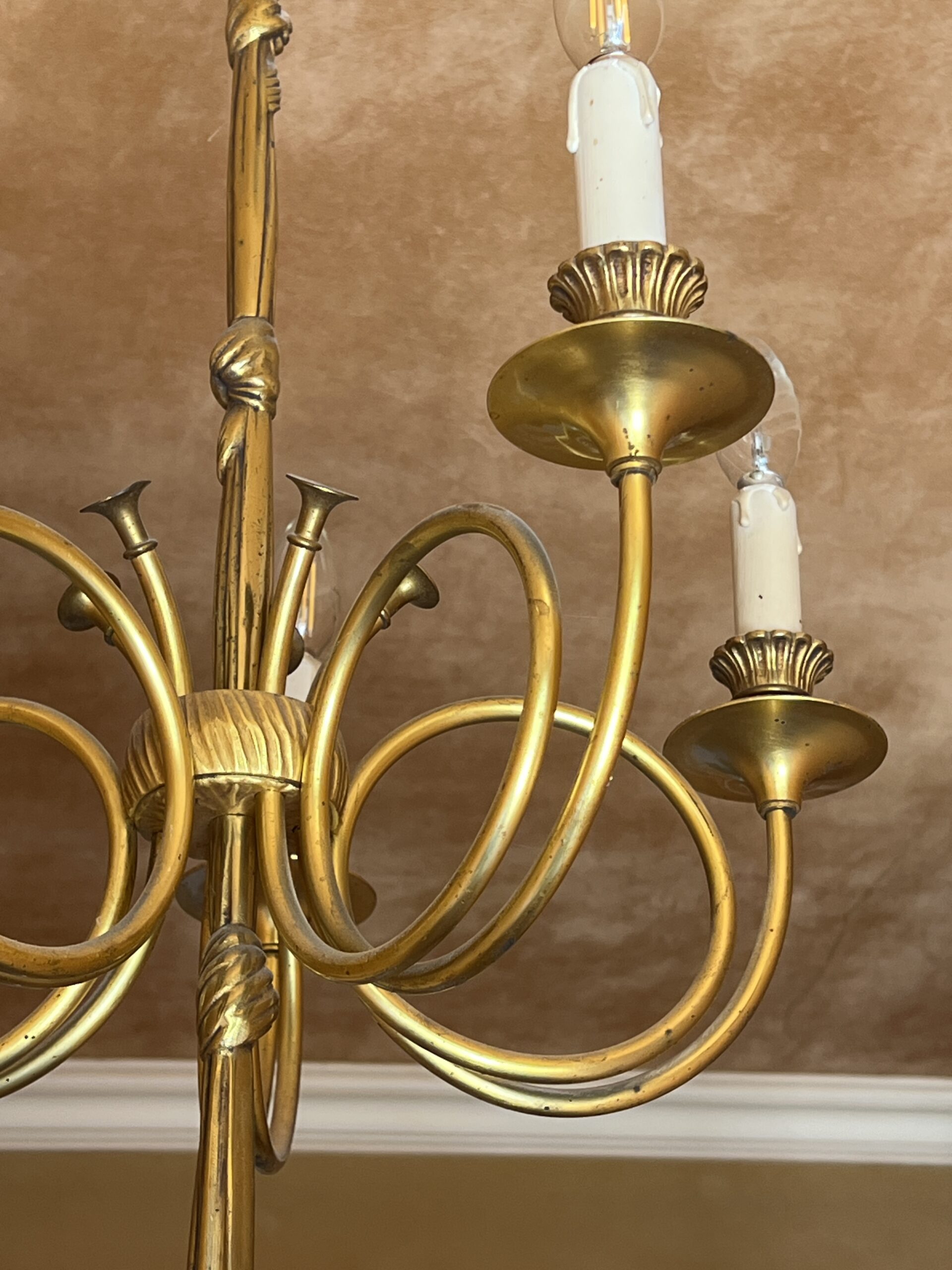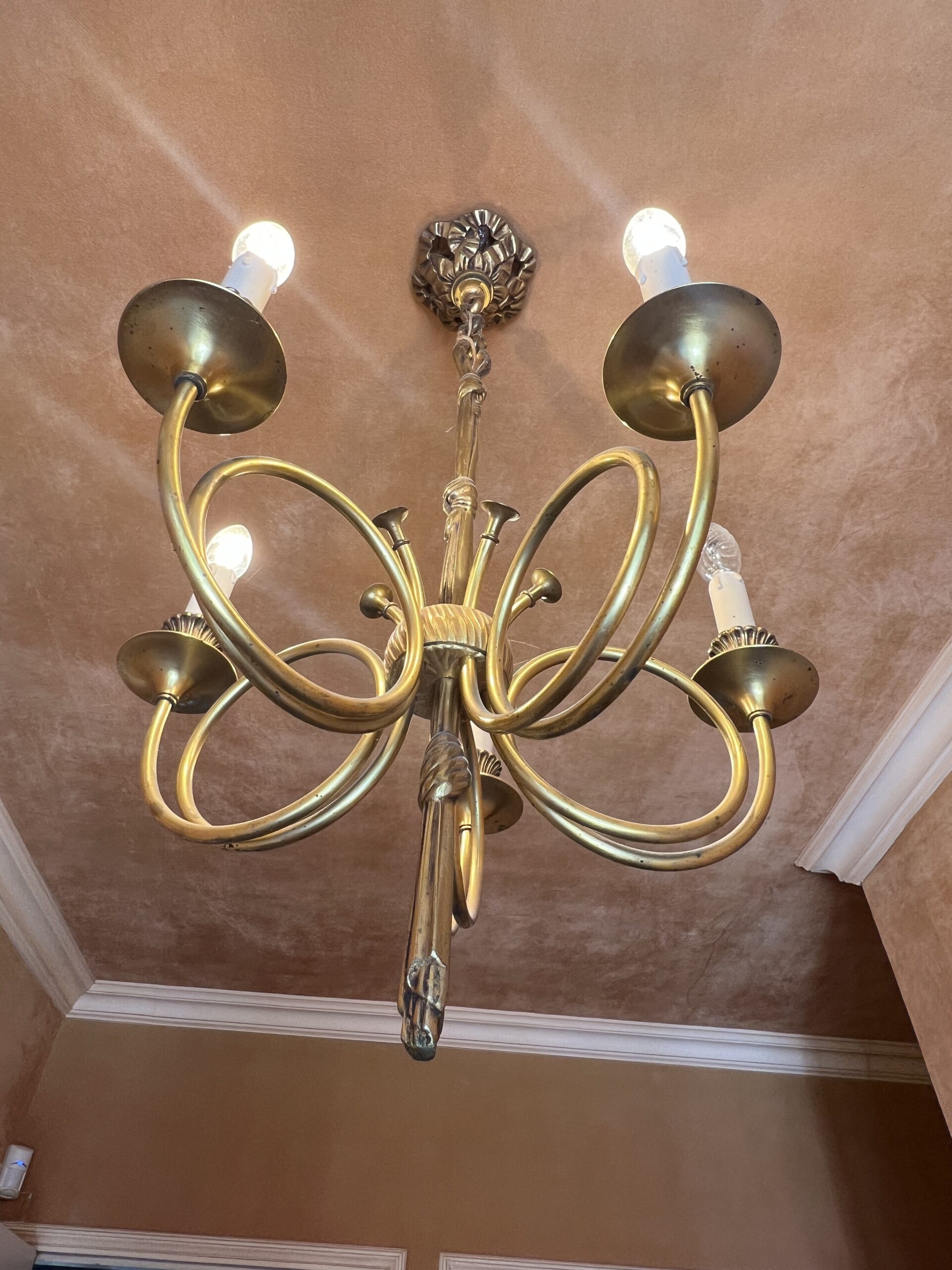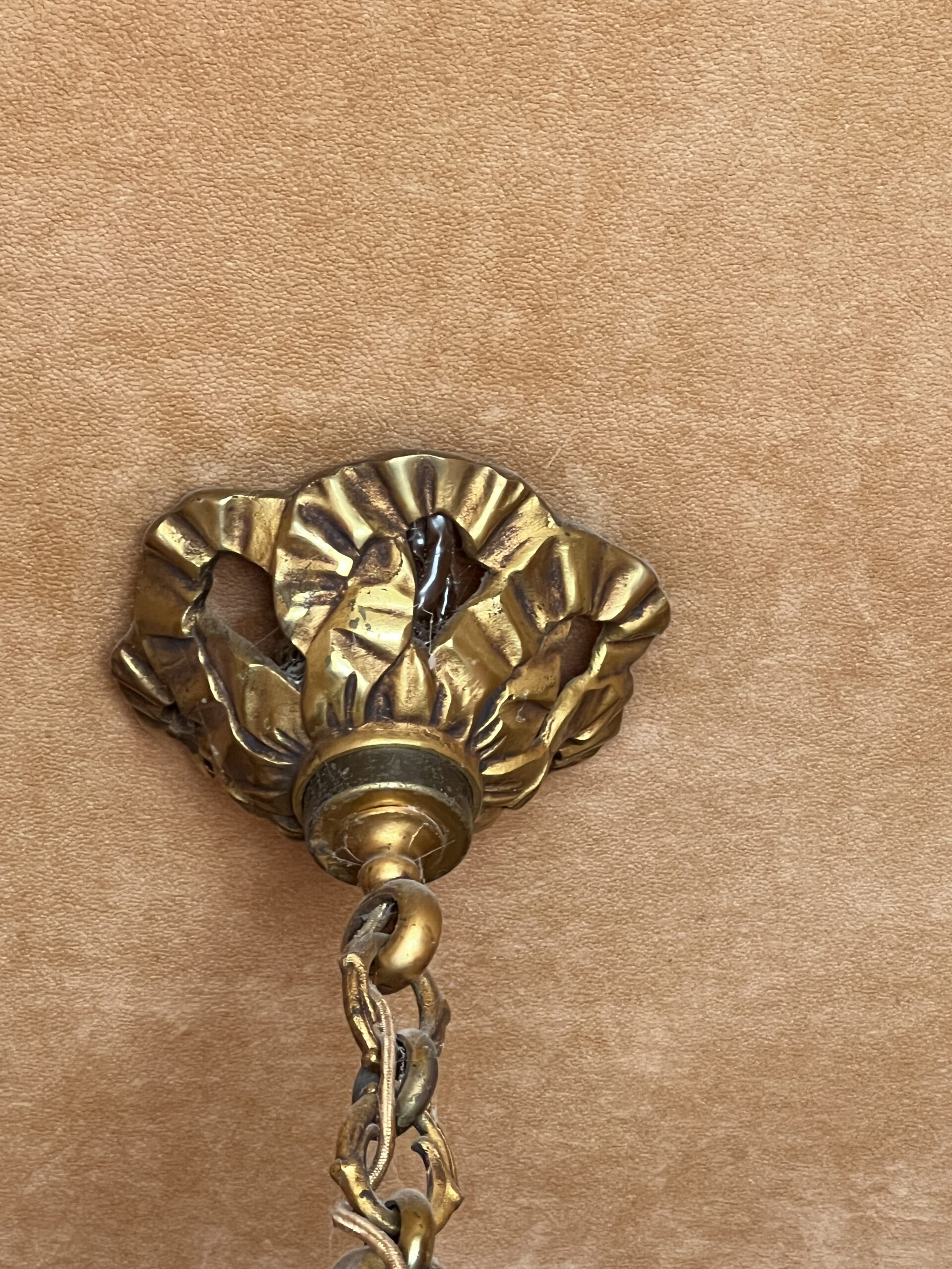 Ce lustre en laiton doré et bronze est une pièce d’exception, alliant élégance intemporelle et savoir-faire artisanal.