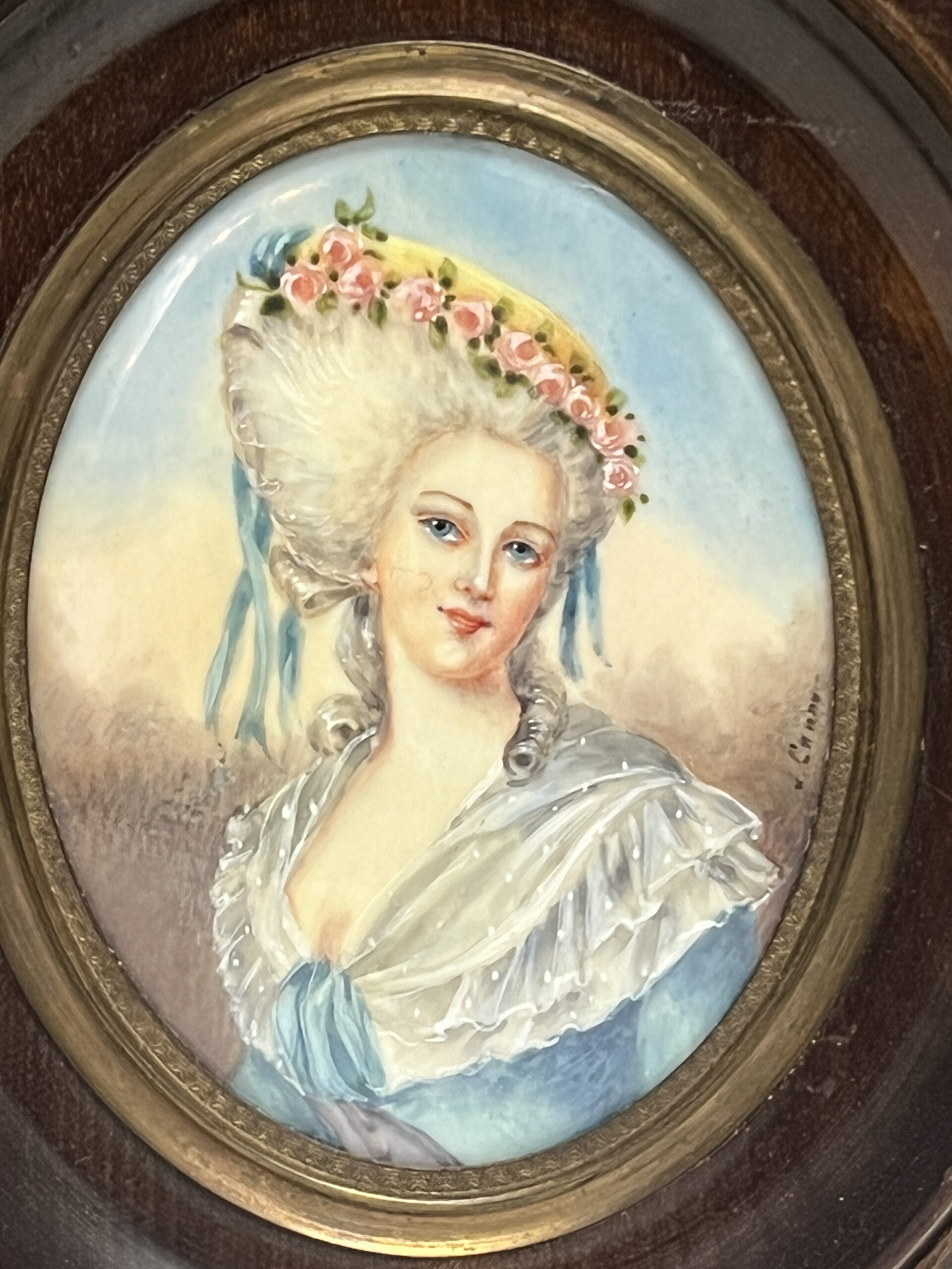 Dans cette miniature spécifique, Cavana excelle en restituant l’élégance d’une dame de la noblesse, sans doute Marie Thérèse Blonel d’Haraucourt. La précision des plis de la robe, les jeux d’ombre et de lumière sur le visage, et la douceur du regard traduisent un travail minutieux et une grande habileté artistique. Ces caractéristiques témoignent de l’attention que l’artiste portait à chaque élément de ses compositions, révélant ainsi sa capacité à donner vie à ses sujets dans des formats si réduits.
