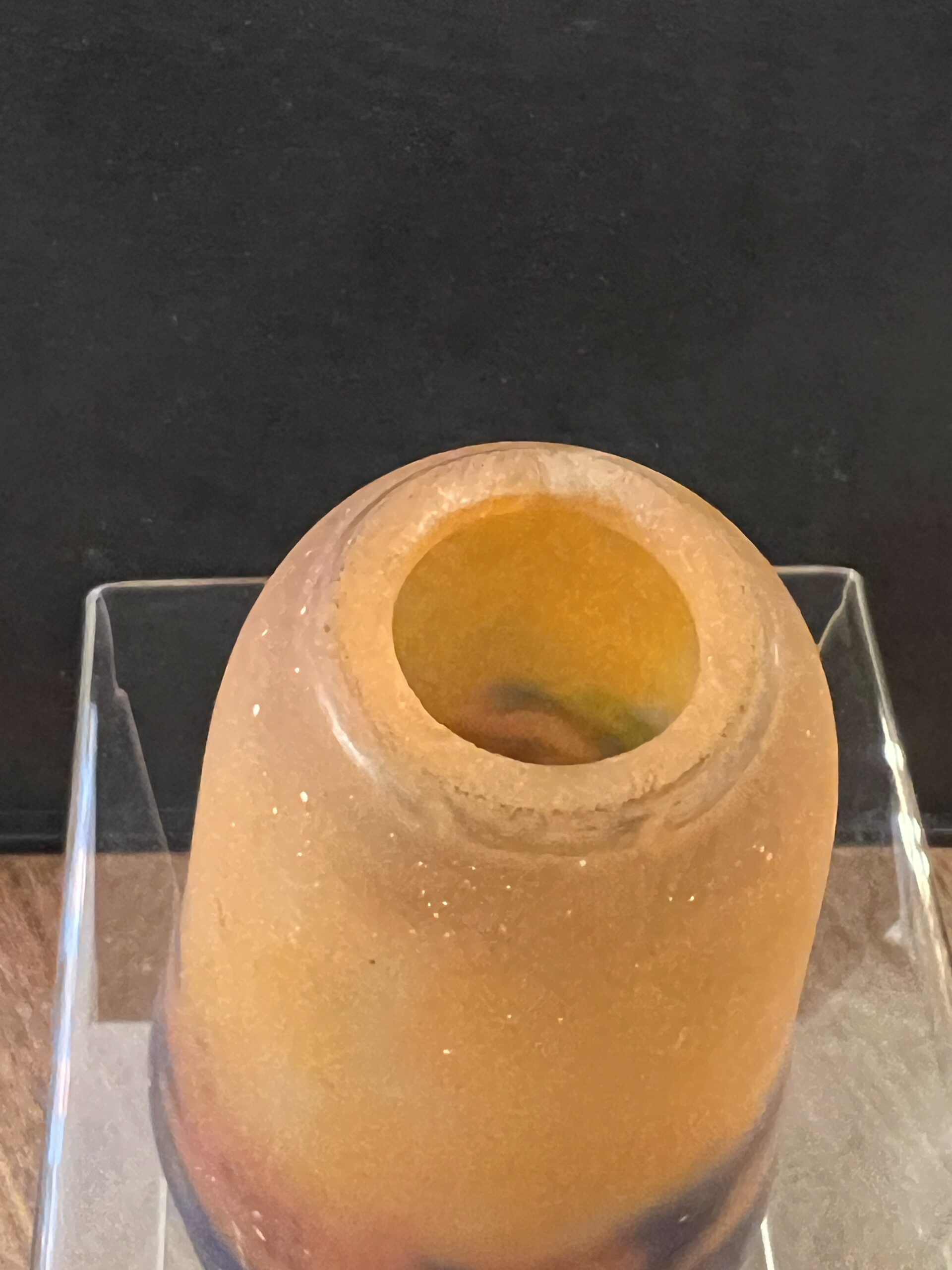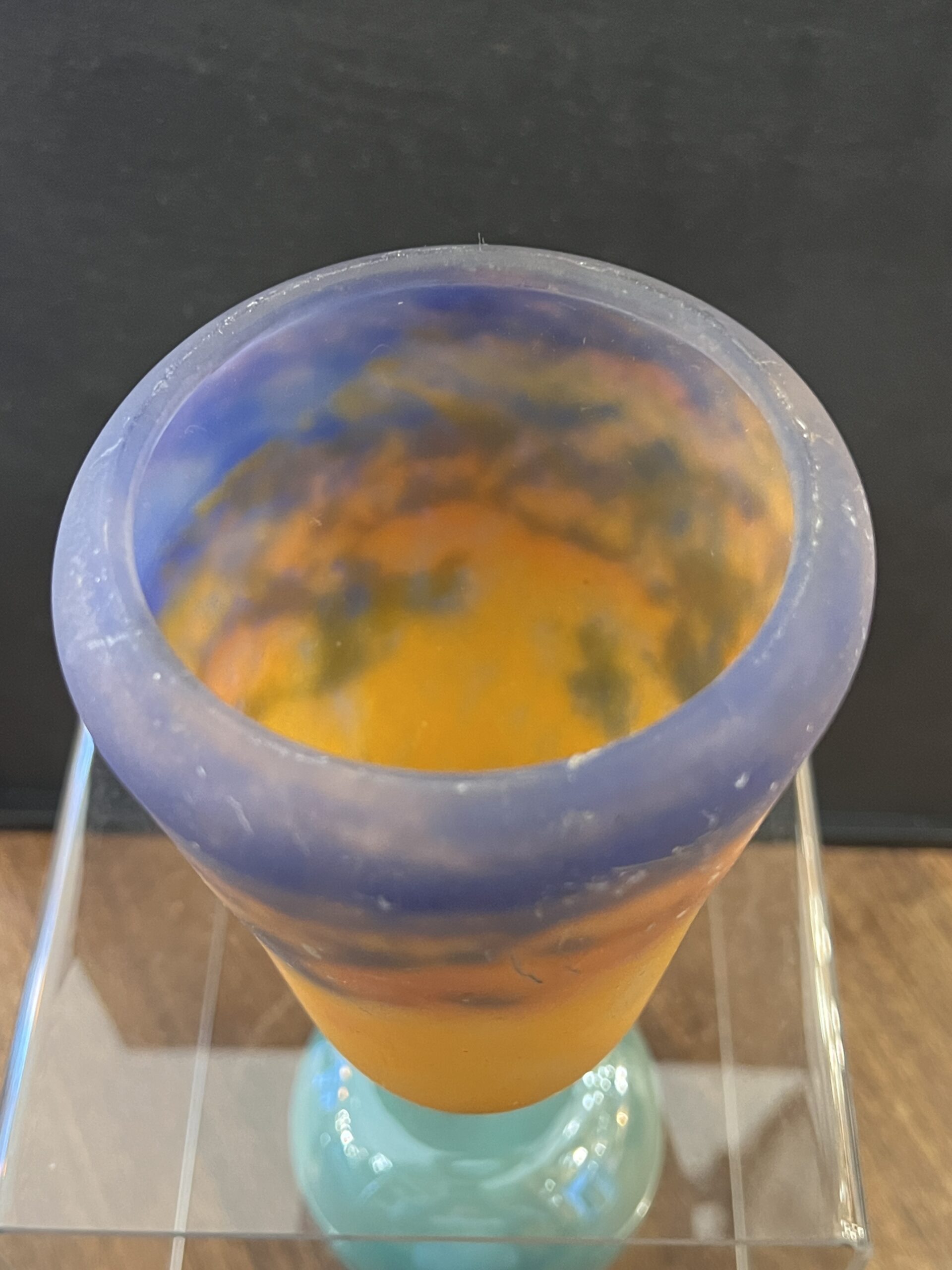 La pâte de verre, technique méticuleuse et exigeante, confère à cette tulipe une texture et une luminosité uniques. Chaque détail, chaque veinure marbrée, semble capturer la lumière de manière éthérée, créant une ambiance chaleureuse et enveloppante dans n’importe quelle pièce où elle est placée. Cette technique, développée par les maîtres verriers de l’époque, donne à la tulipe une élégance intemporelle, lui permettant de traverser les âges sans perdre de sa splendeur.