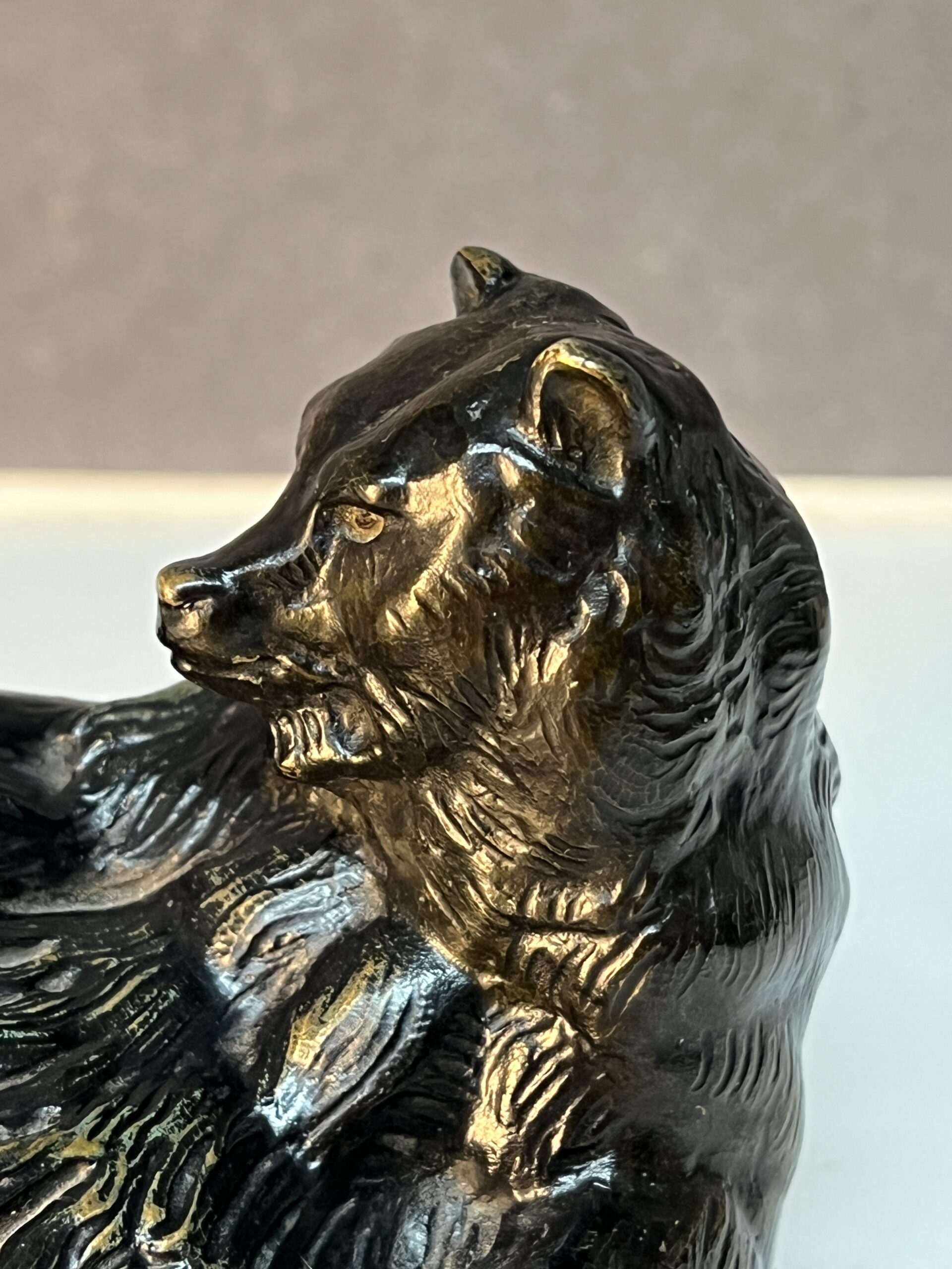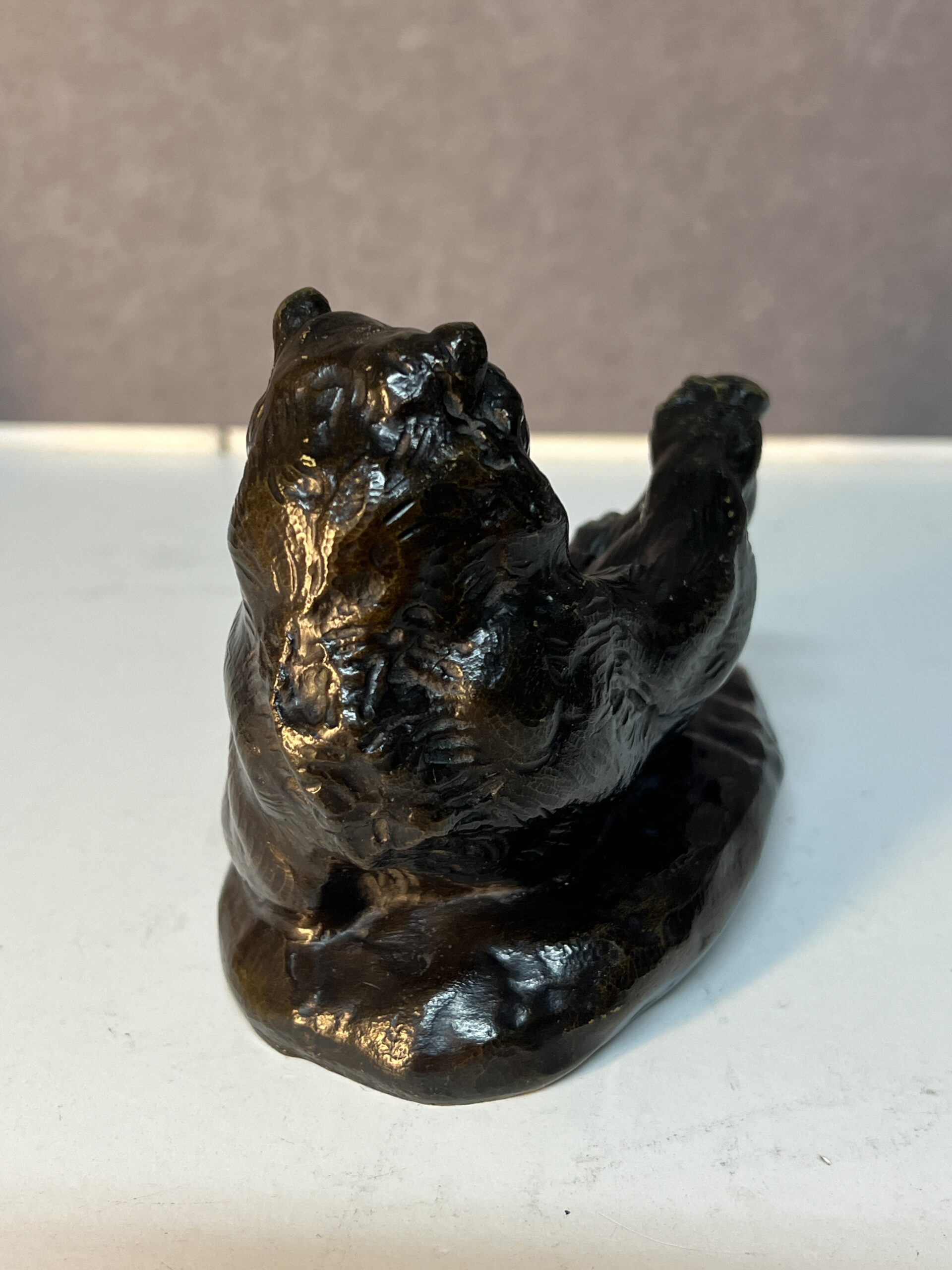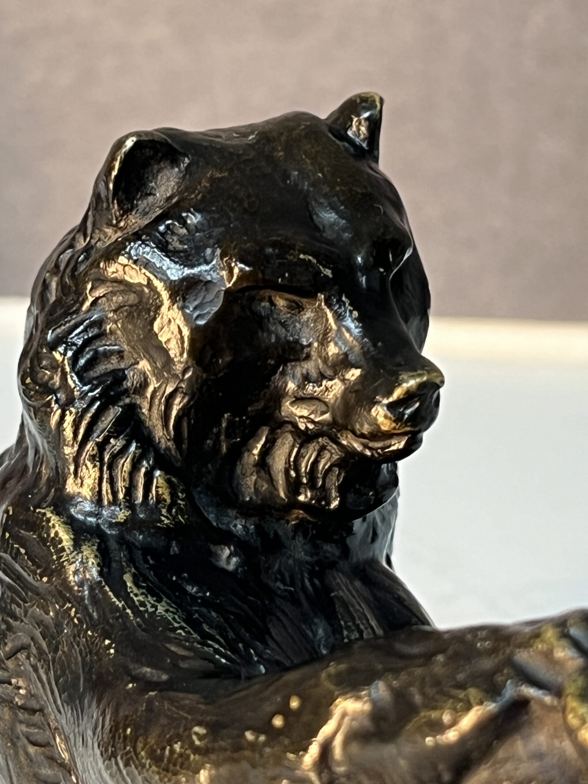 La patine brune appliquée à la surface du bronze confère à l’œuvre une richesse et une profondeur supplémentaires. Elle crée des nuances subtiles qui mettent en valeur les différentes textures de l’ours, des poils épais de son pelage aux coussinets rugueux de ses pattes. Cette patine donne également à la sculpture une apparence antique, lui conférant une aura intemporelle qui traverse les époques.