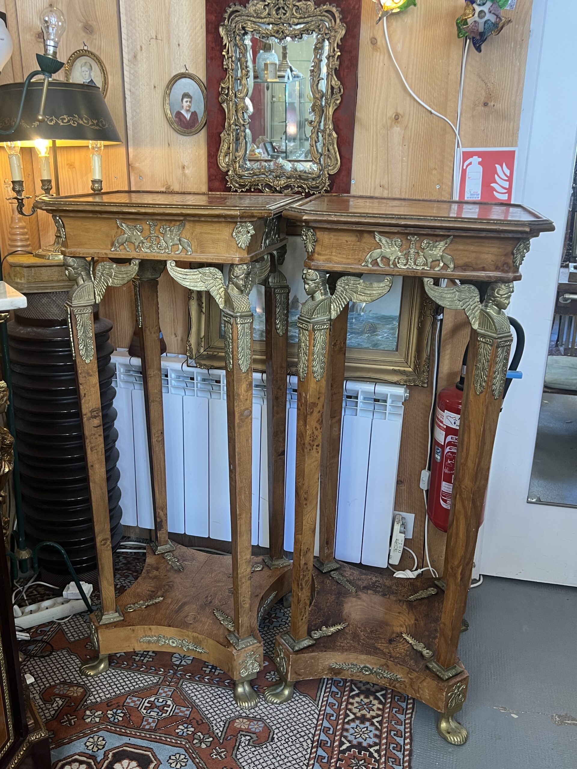 Paire de sellettes en bois de placage, ornées de magnifiques détails en bronze.