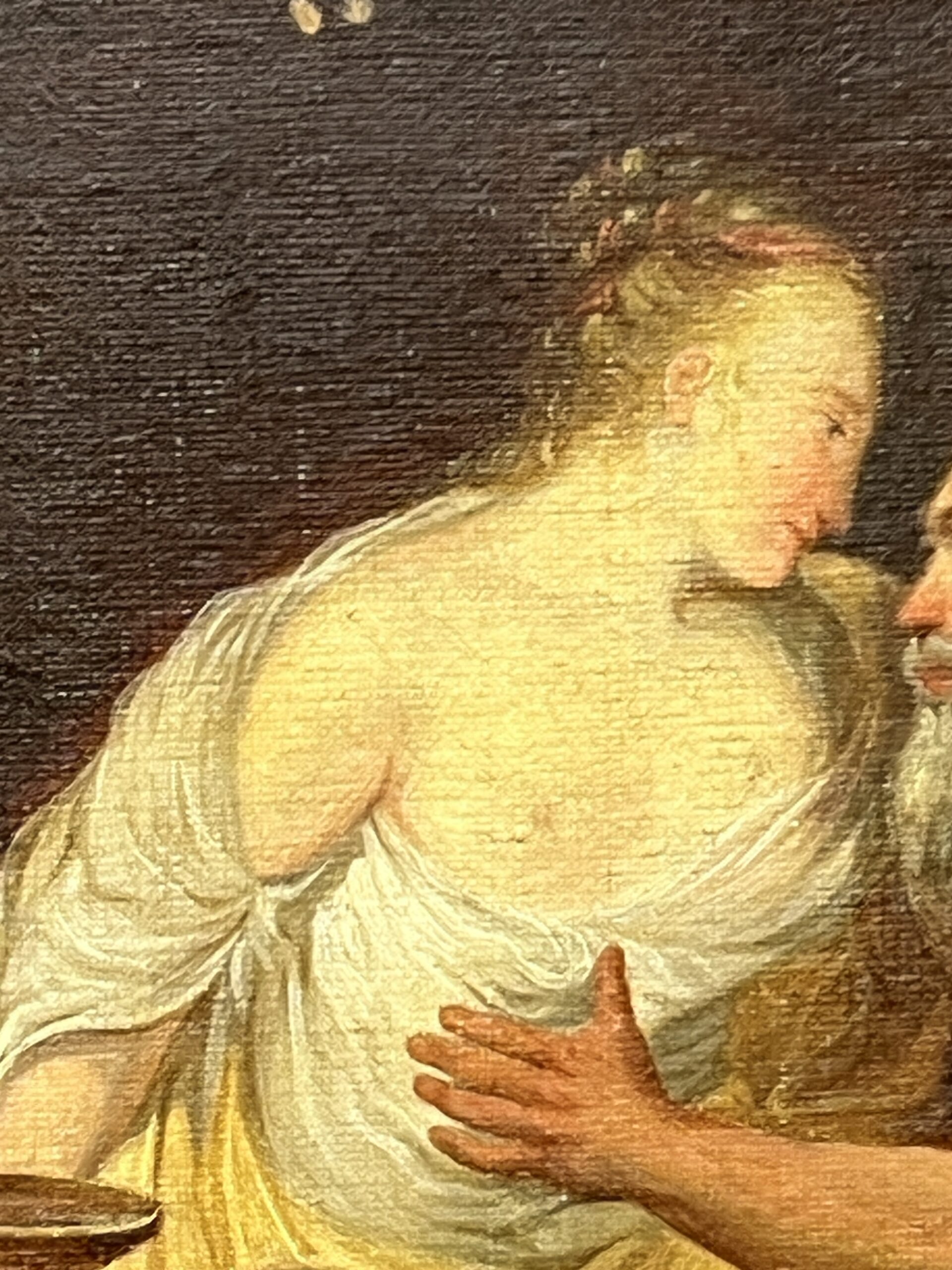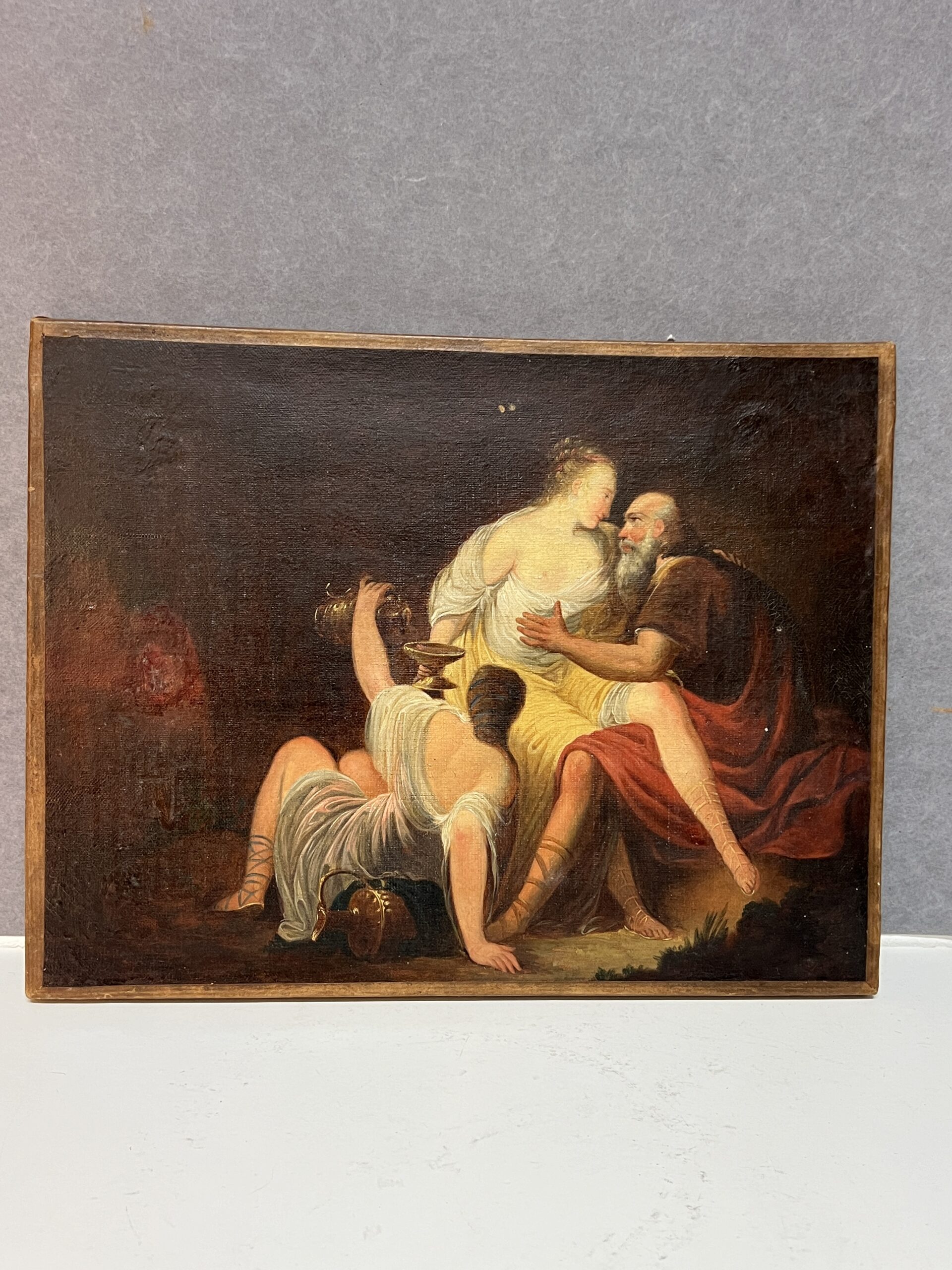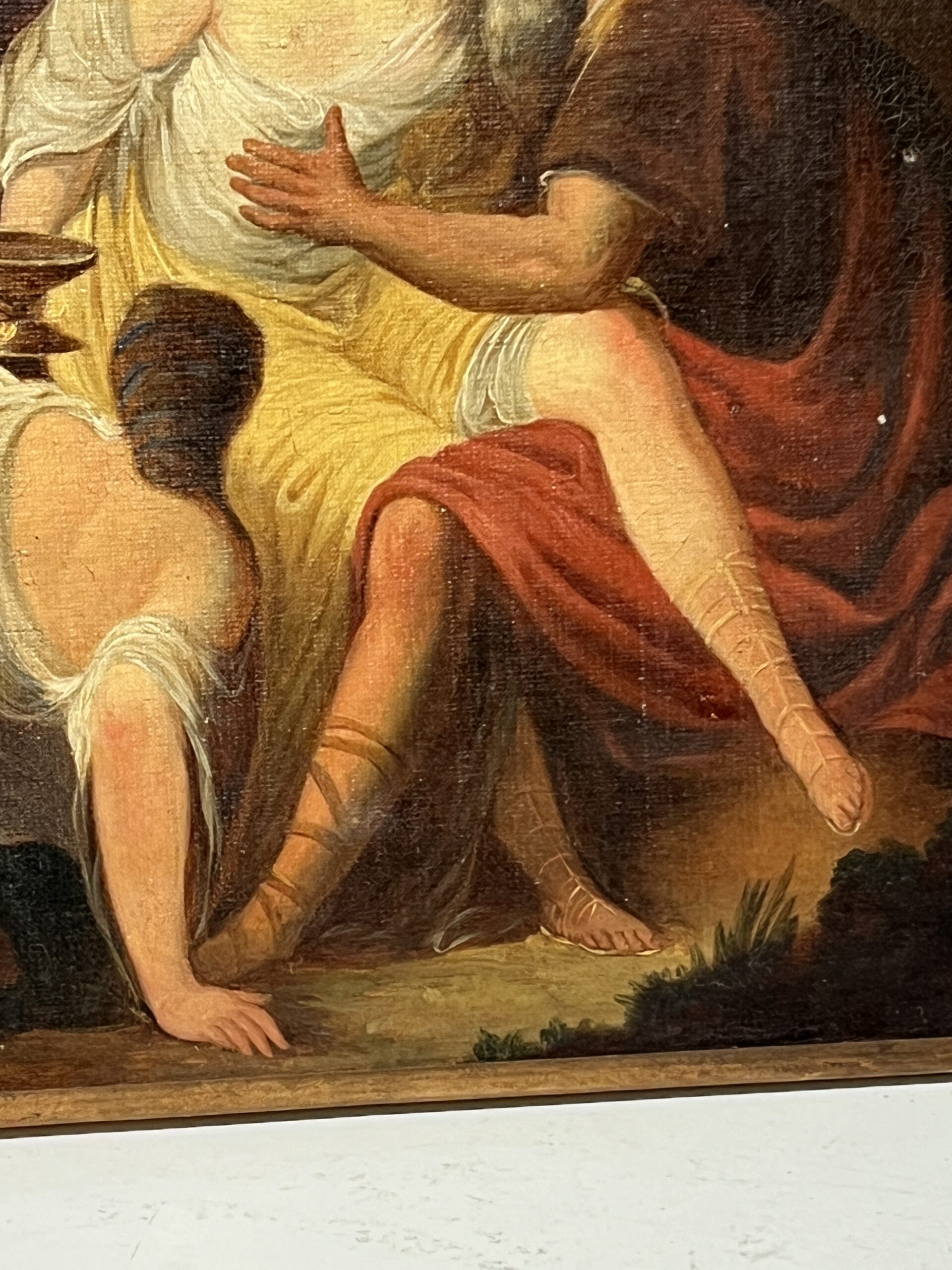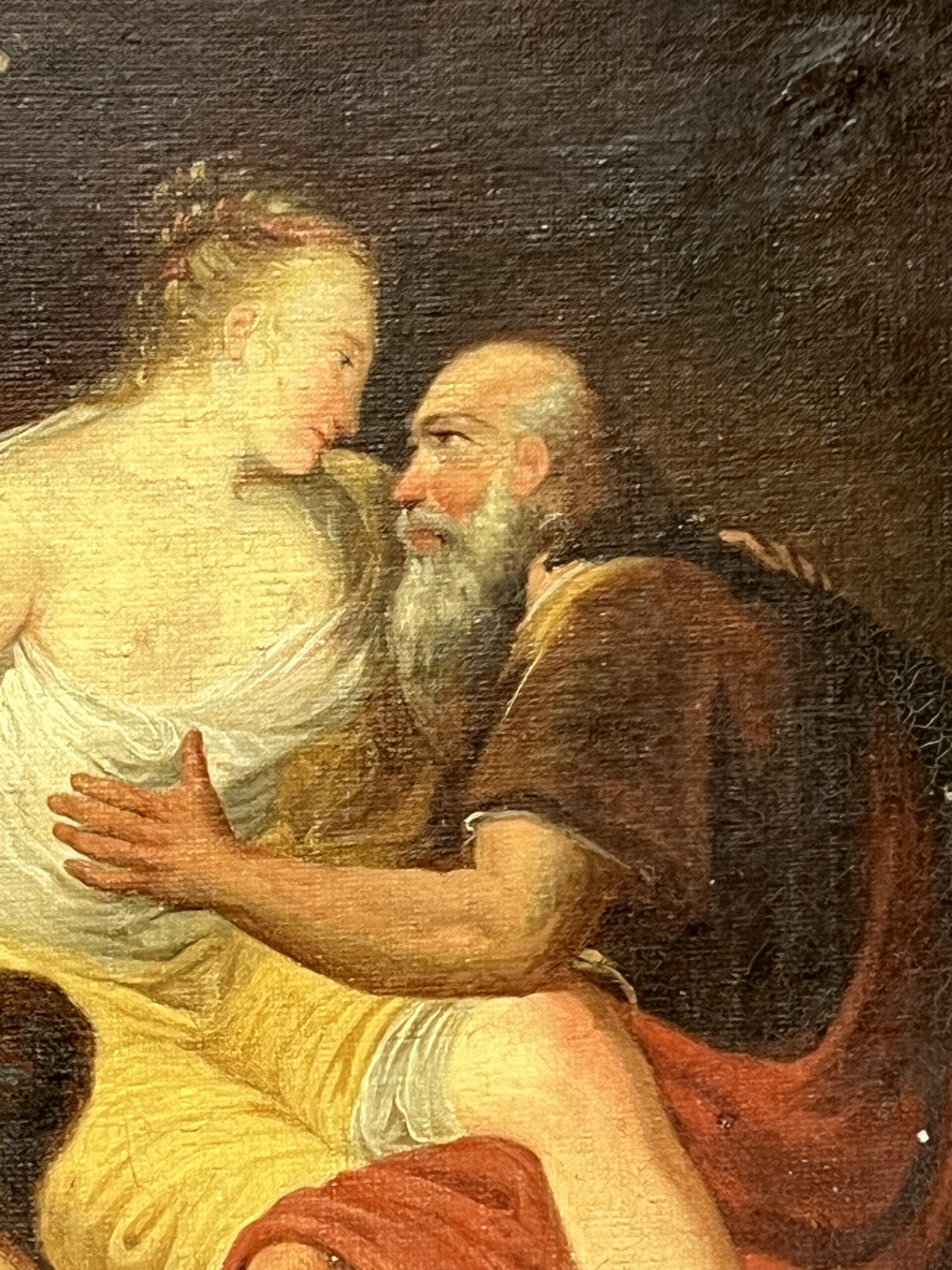 En conclusion, cette ancienne peinture du XIXe siècle, avec sa scène légèrement érotique et ses réparations anciennes, est une œuvre qui mérite d’être contemplée et explorée avec attention, offrant un aperçu fascinant de son époque et de ses préoccupations artistiques.