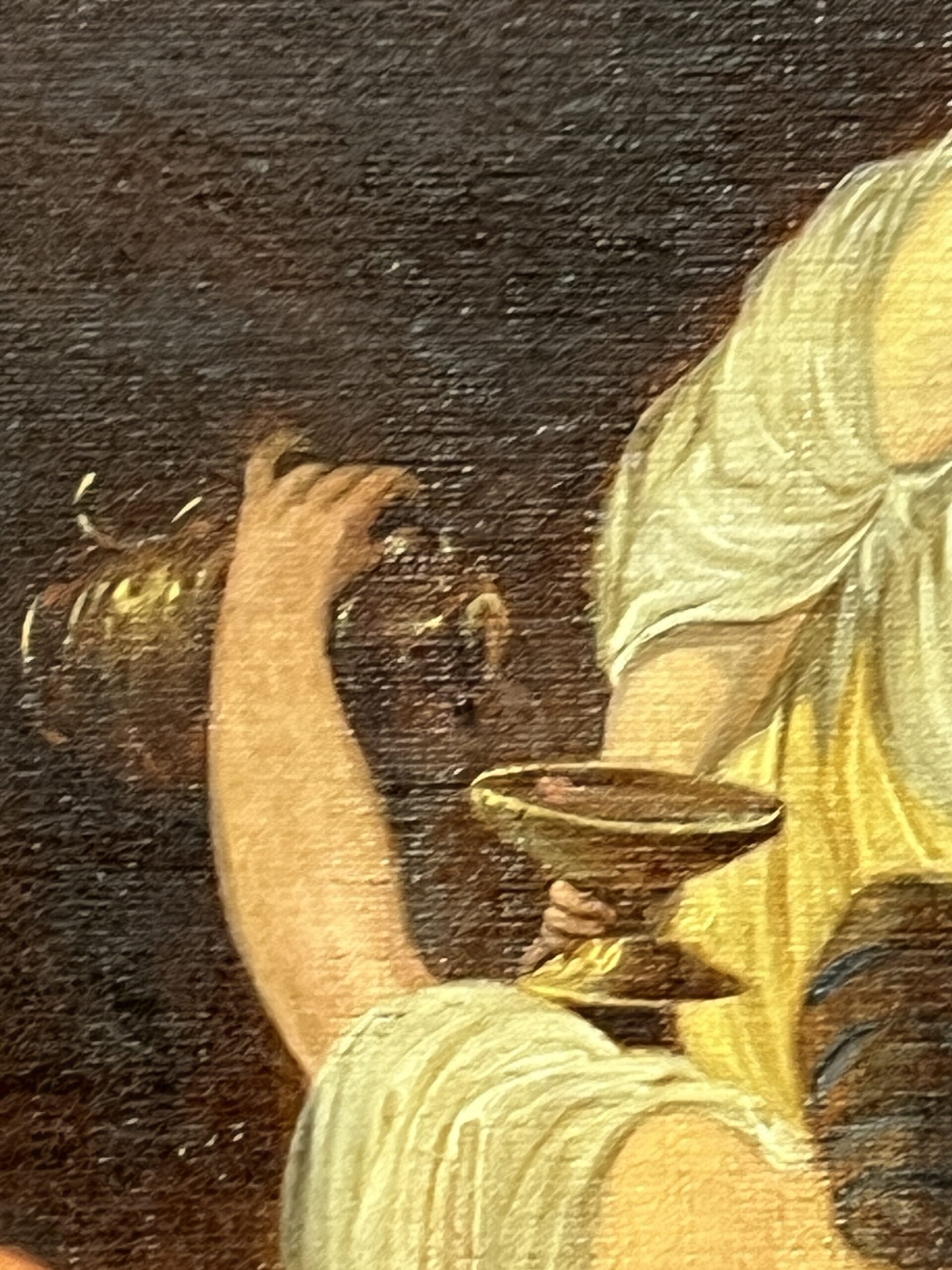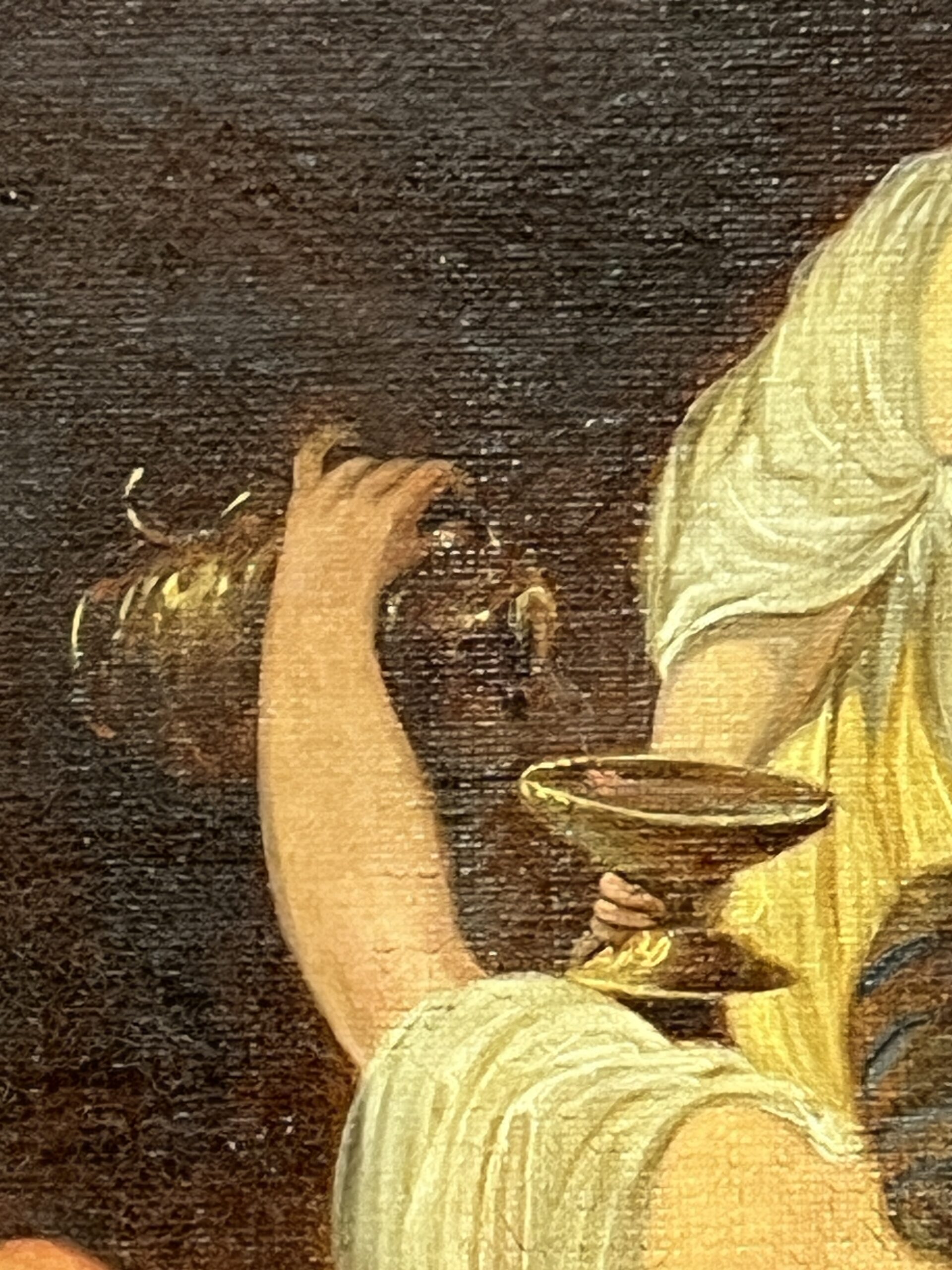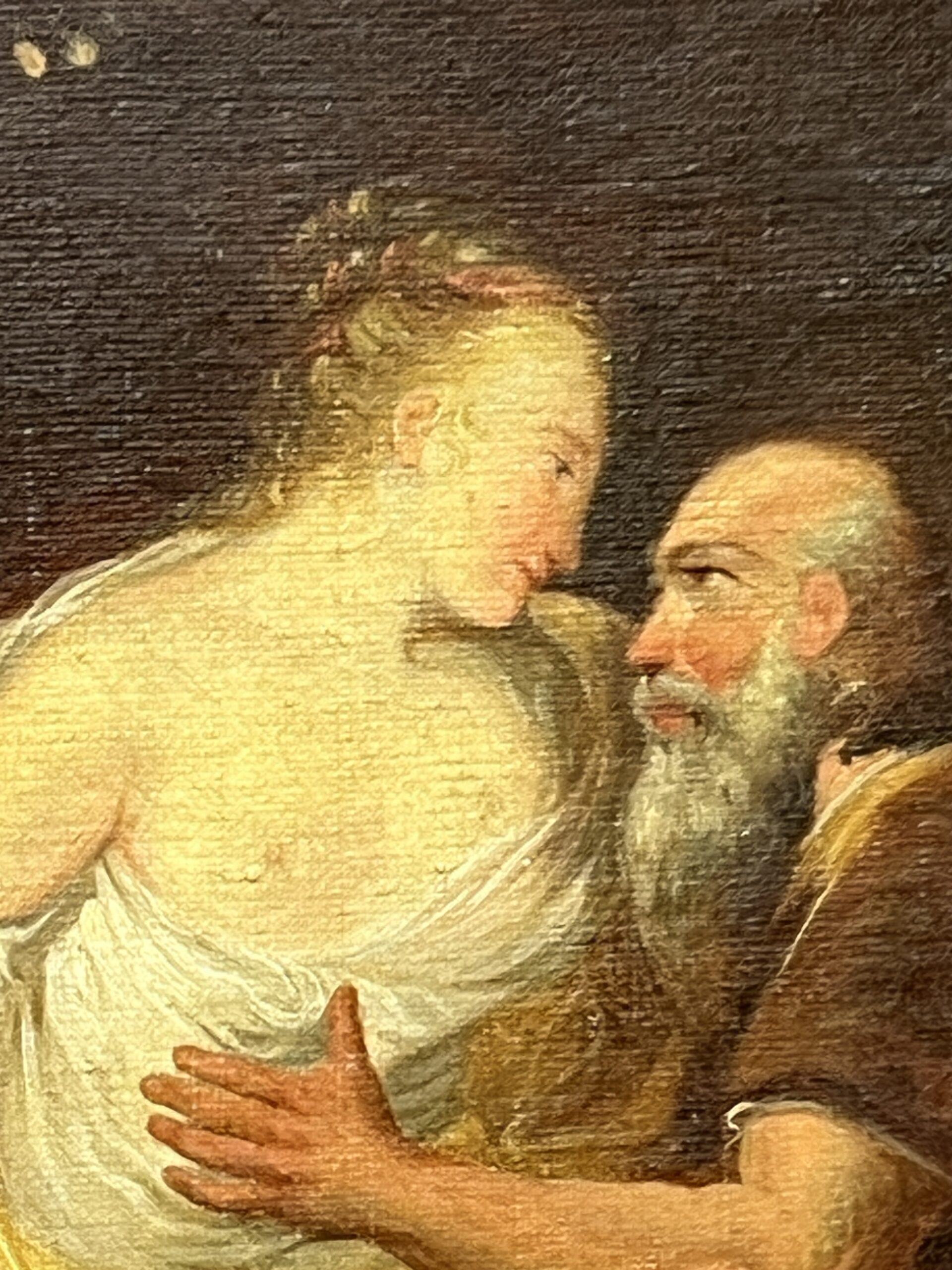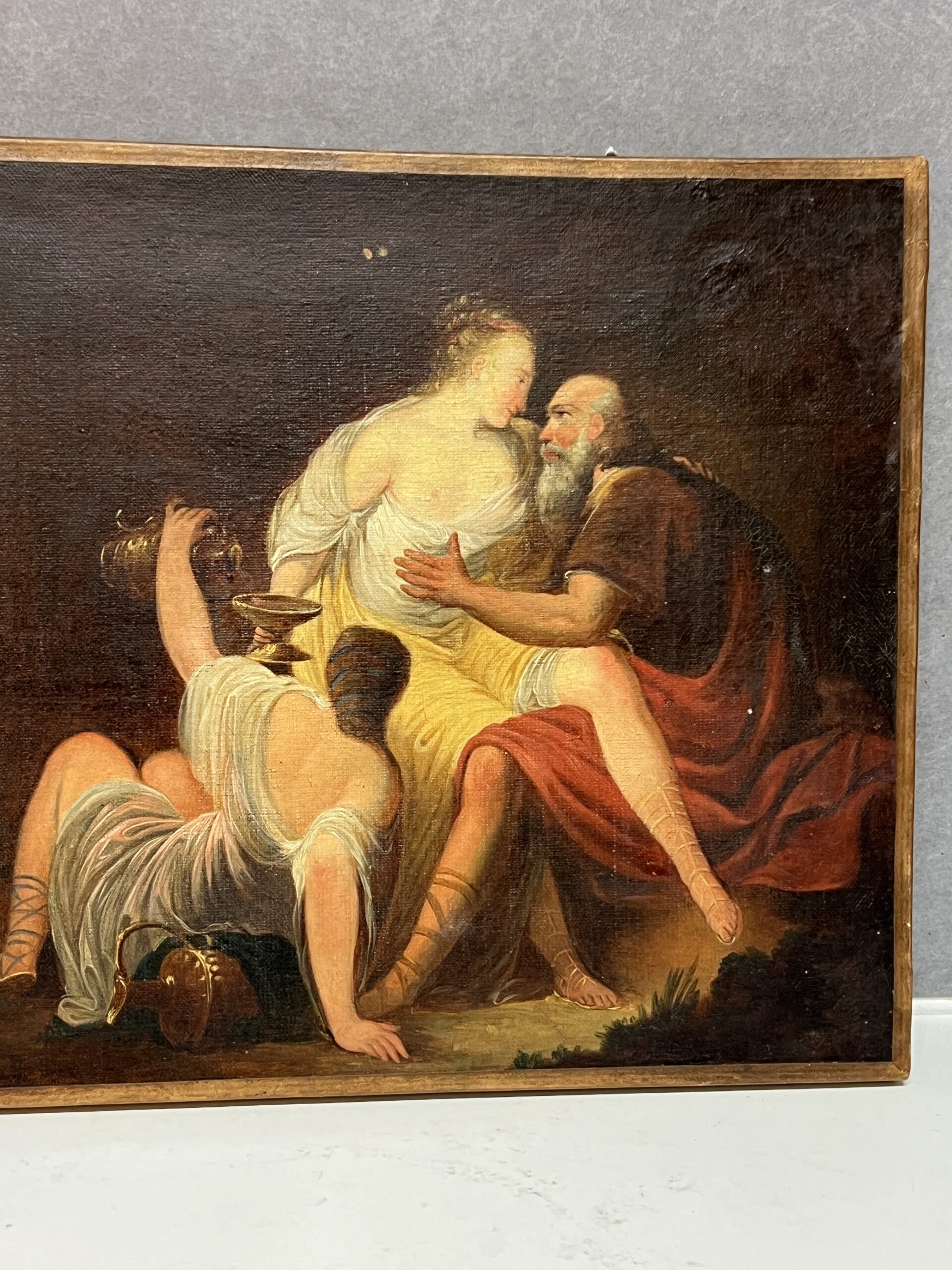 En conclusion, cette ancienne peinture du XIXe siècle, avec sa scène légèrement érotique et ses réparations anciennes, est une œuvre qui mérite d’être contemplée et explorée avec attention, offrant un aperçu fascinant de son époque et de ses préoccupations artistiques.