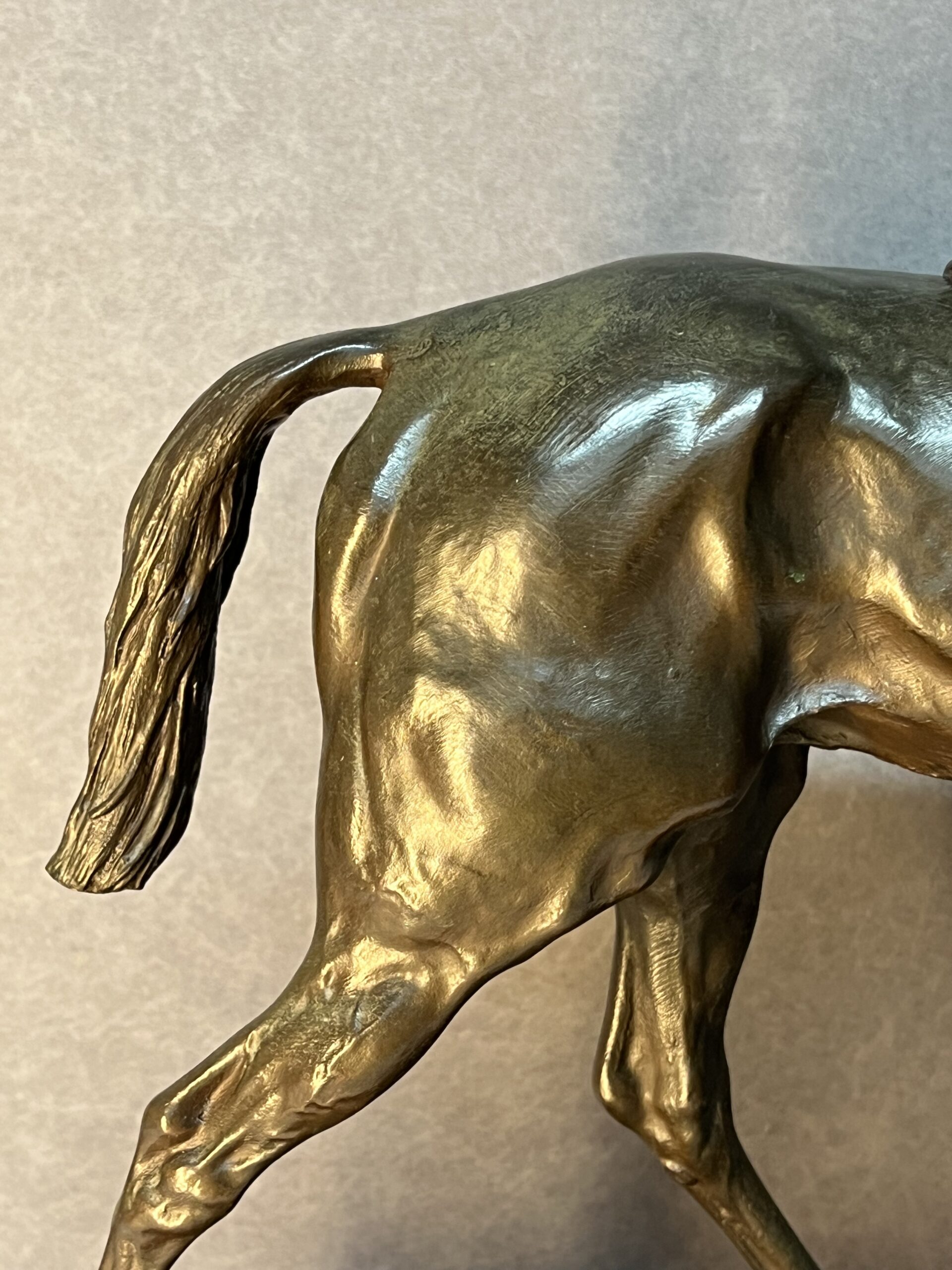 Pierre Jules Mêne était réputé pour sa capacité à capturer l’essence même de ses sujets, et “Cheval de Course” en est un exemple remarquable. La sculpture présente un cheval en pleine course, figé dans un moment d’intensité pure. Les muscles tendus, la crinière flottante dans le vent, et les jambes galopantes donnent une impression de mouvement dynamique figé dans le bronze.