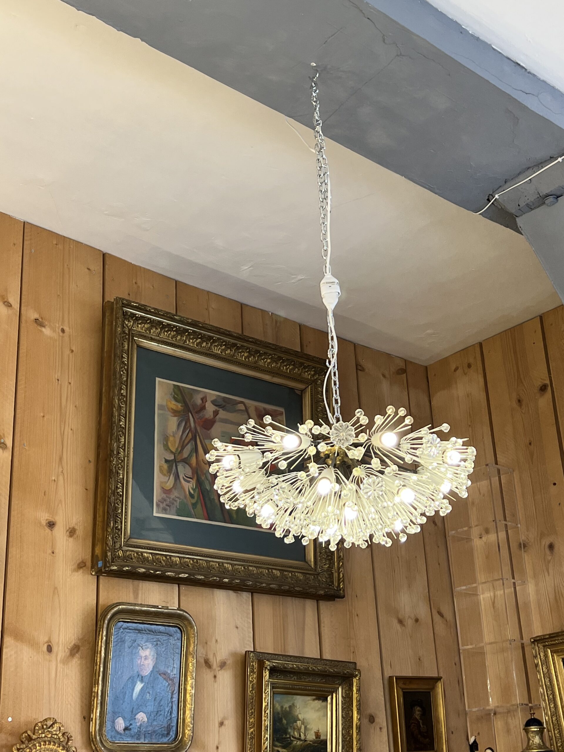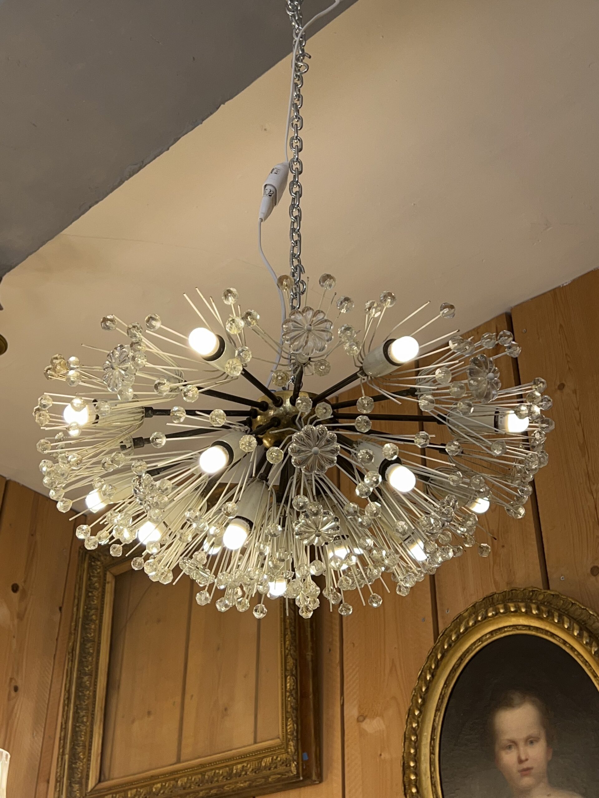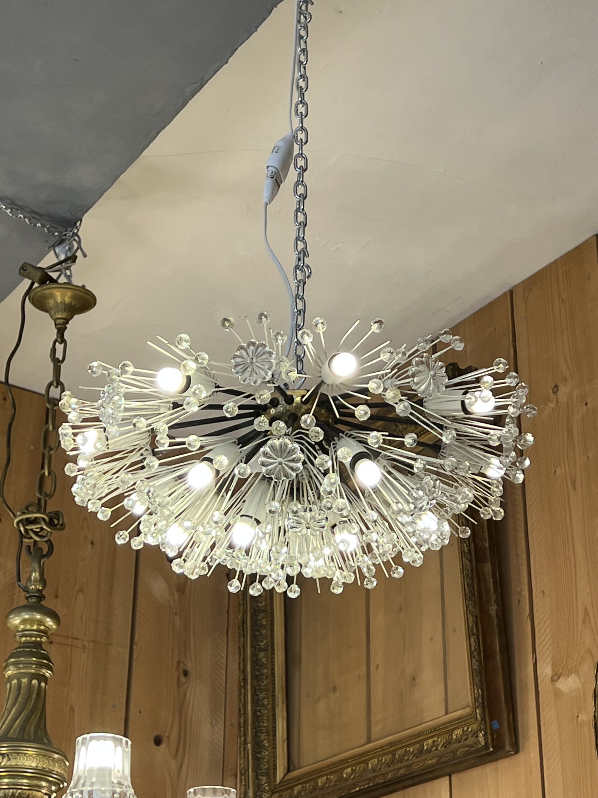 Ce luminaire se distingue par ses détails minutieux, notamment les fleurs et les flocons de neige qui ornent chaque bras avec une précision remarquable. Son état impeccable, complet et sans aucun manque, témoigne du soin apporté à sa préservation au fil des décennies. Même les plus petits détails, comme de minuscules éclats de peinture, sont absents, préservant ainsi l’intégrité et l’esthétique originale de la pièce.