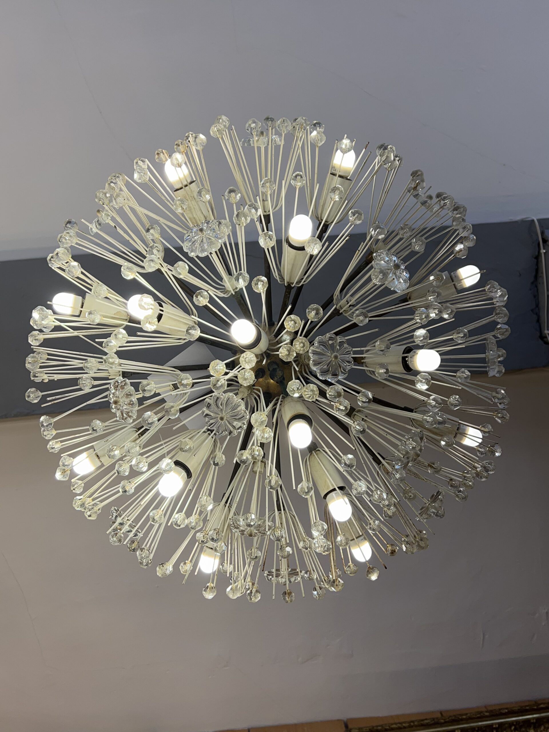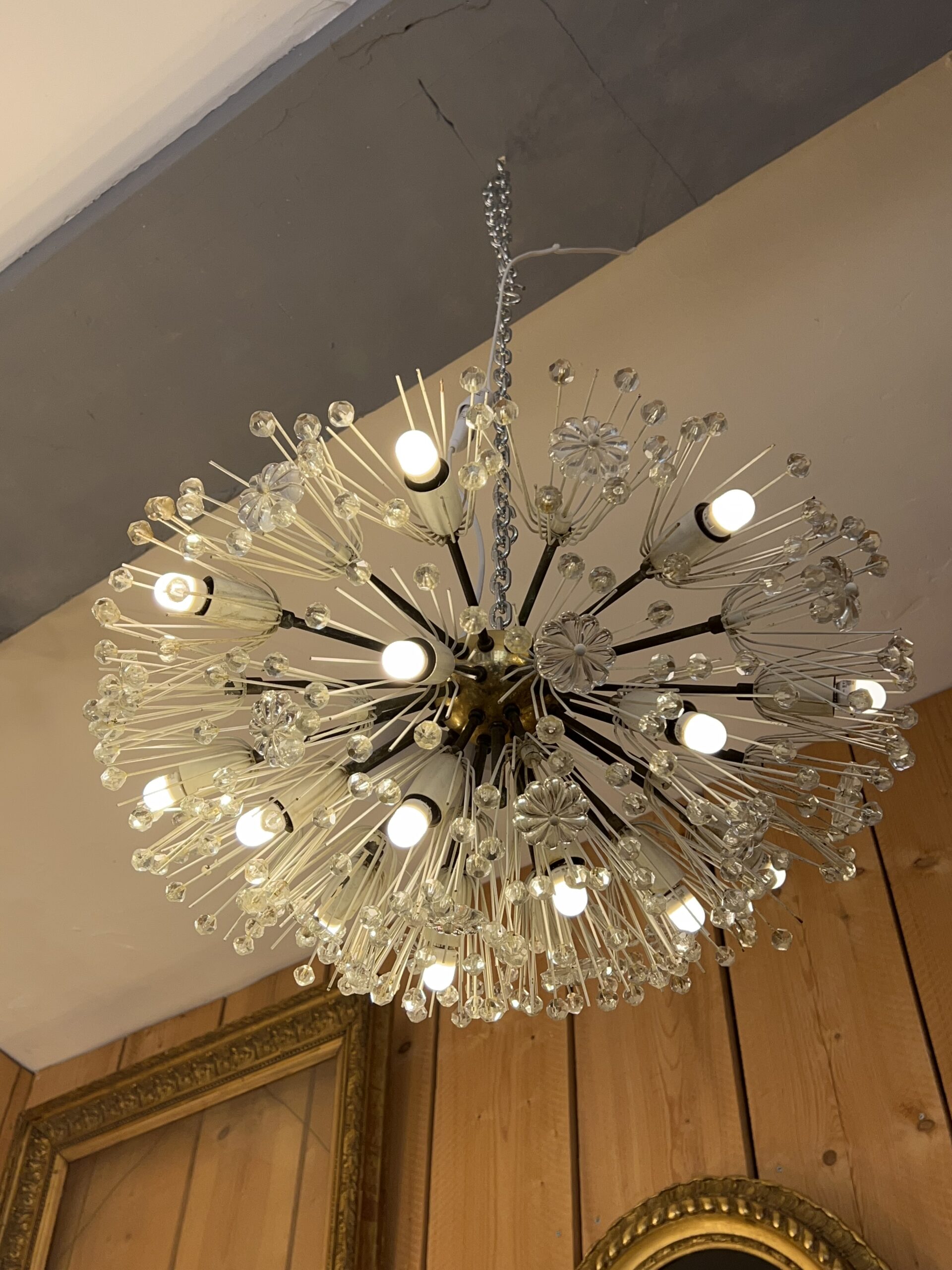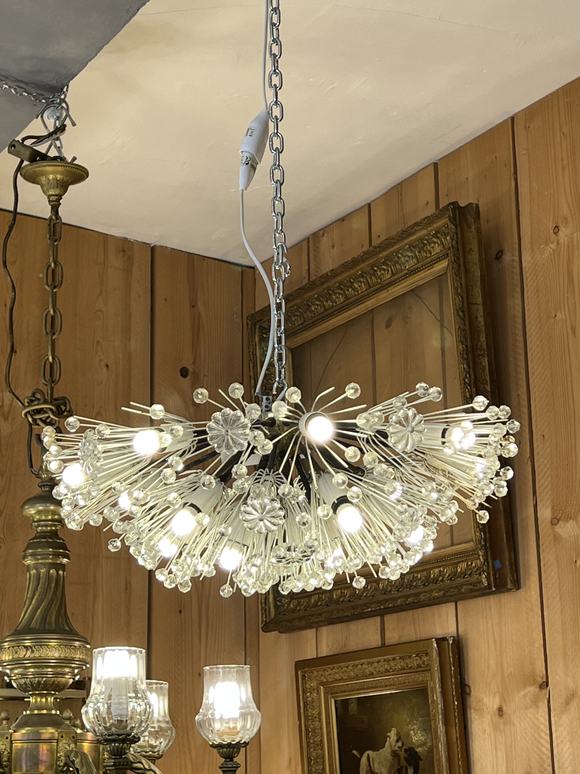 Ce luminaire se distingue par ses détails minutieux, notamment les fleurs et les flocons de neige qui ornent chaque bras avec une précision remarquable. Son état impeccable, complet et sans aucun manque, témoigne du soin apporté à sa préservation au fil des décennies. Même les plus petits détails, comme de minuscules éclats de peinture, sont absents, préservant ainsi l’intégrité et l’esthétique originale de la pièce.