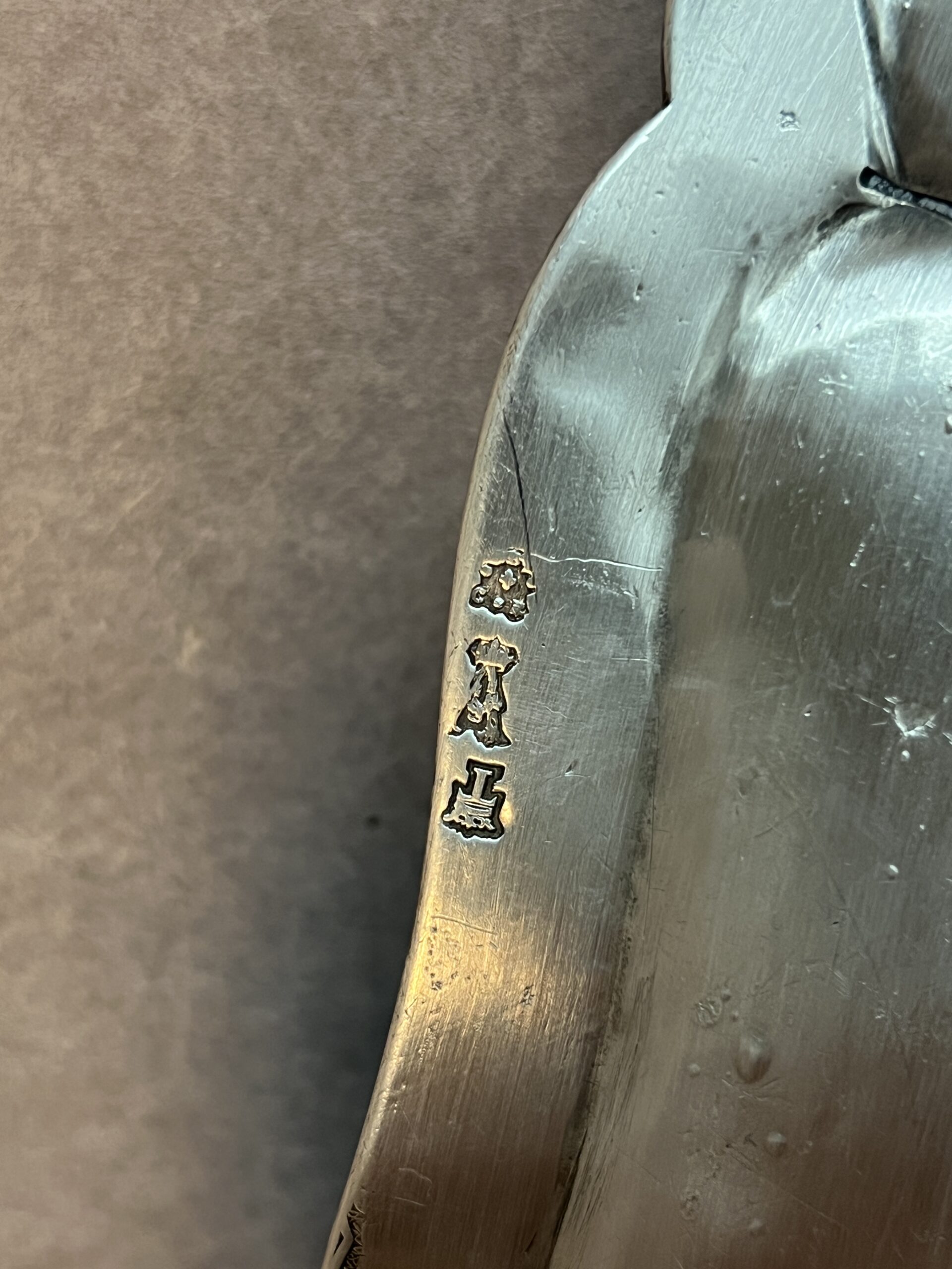 Côté garantie d’authenticité, ce plat est estampillé de plusieurs poinçons officiels : le poinçon de l’argent de Paris, attestant de son origine parisienne, ainsi que les poinçons de De Clavel et des Fermiers généraux, marques de contrôle de l’Ancien Régime.