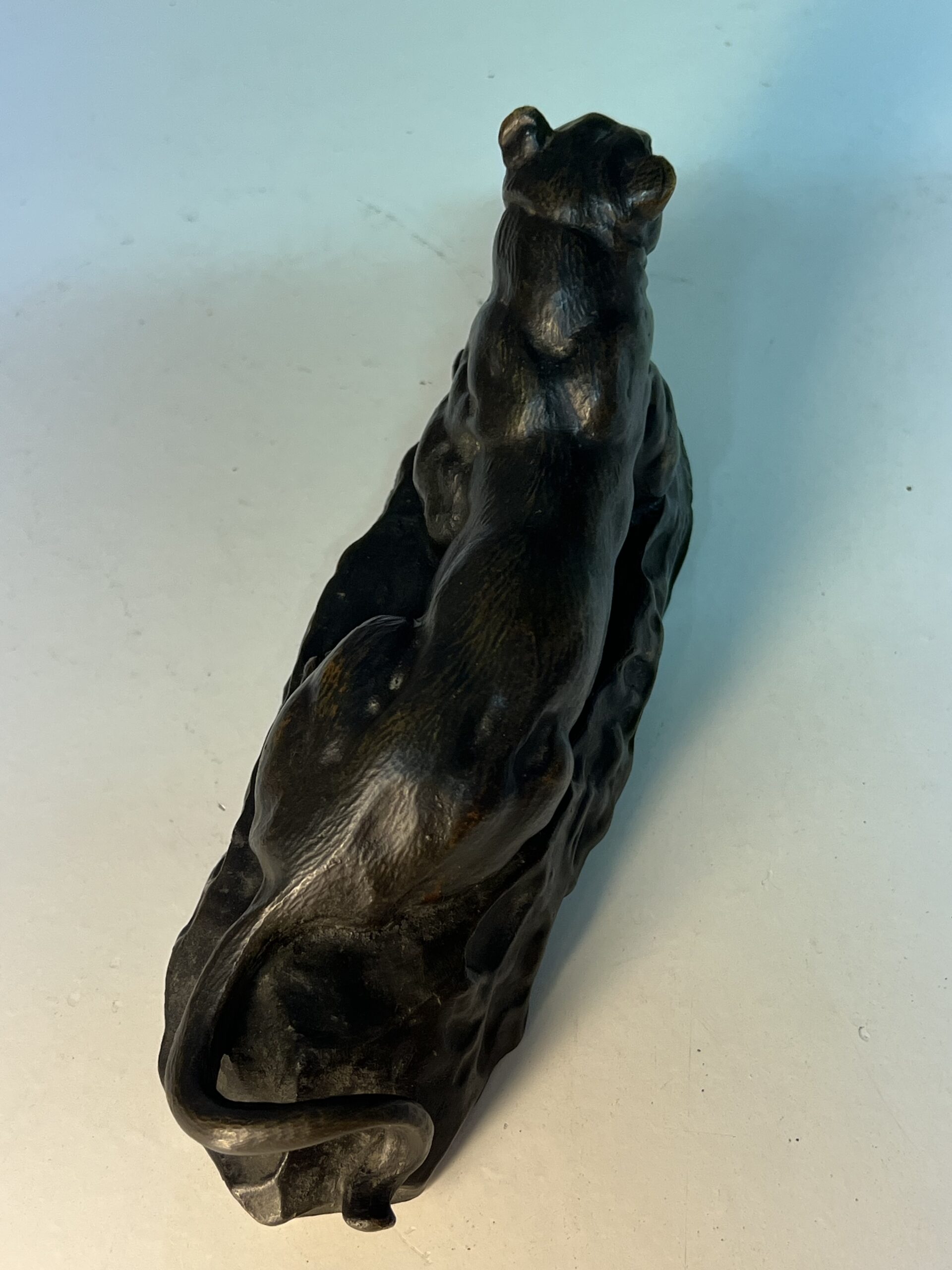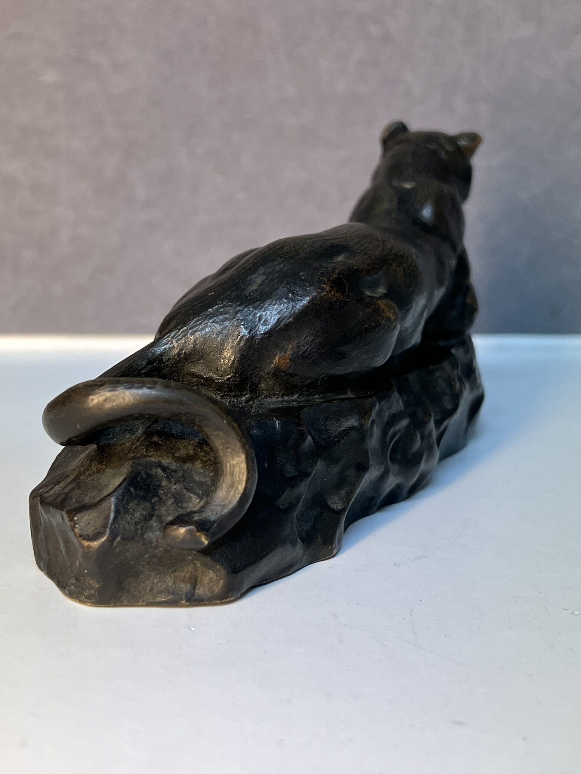La panthère elle-même semble sur le point de s’élancer dans l’action, figée dans un moment de préparation concentrée. Son regard intense, figé dans une expression à la fois farouche et attentive, capte l’attention du spectateur, lui conférant une présence presque palpable. L’artiste parvient à communiquer la force et la grâce de l’animal à travers chaque aspect de la sculpture, créant une expérience immersive pour ceux qui contemplent son travail.