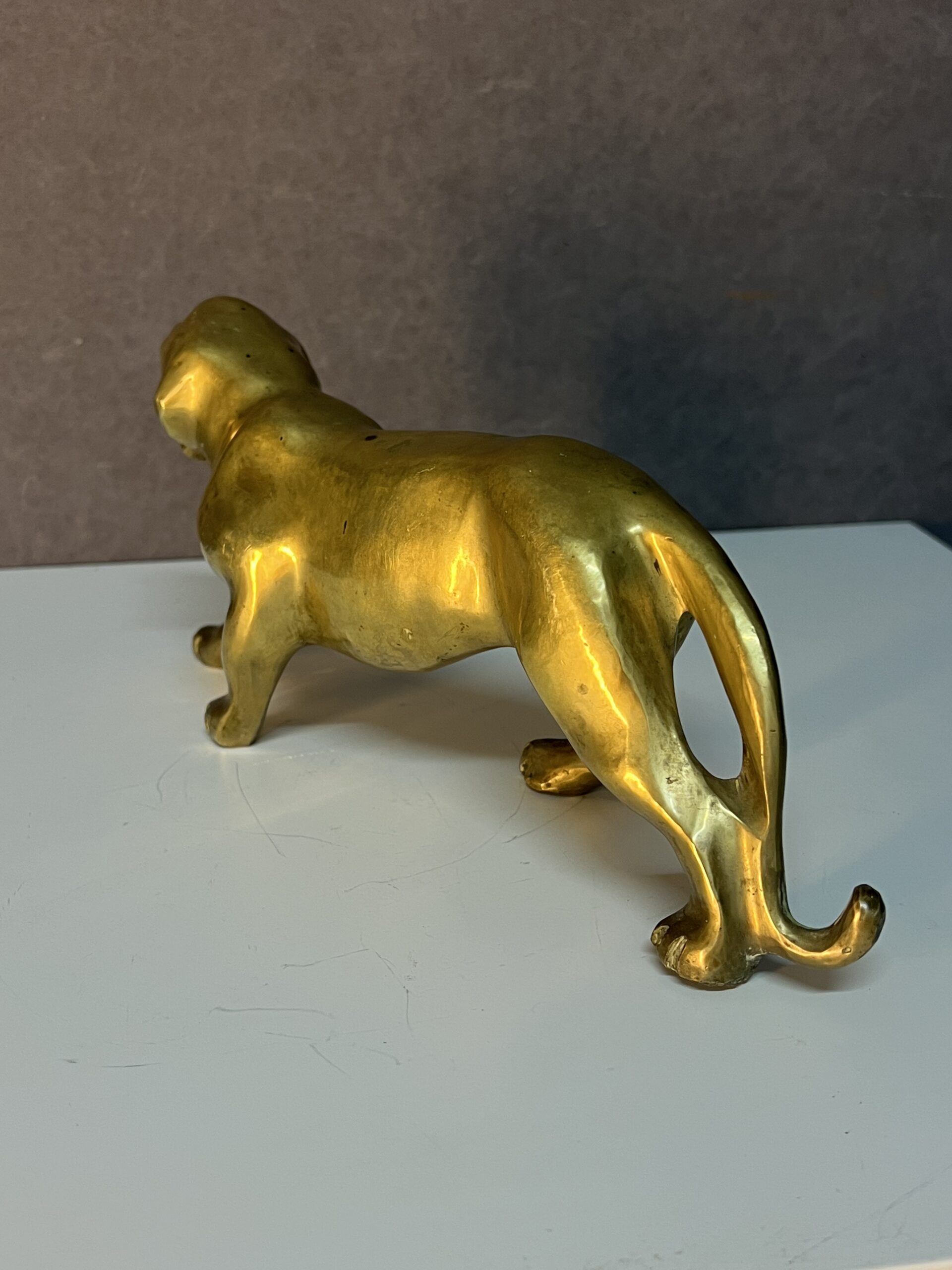 Découvrez cette sublime sculpture d’un tigre en bronze ou en laiton doré, une pièce d’exception qui saura captiver les amateurs d’art et de décoration raffinée.