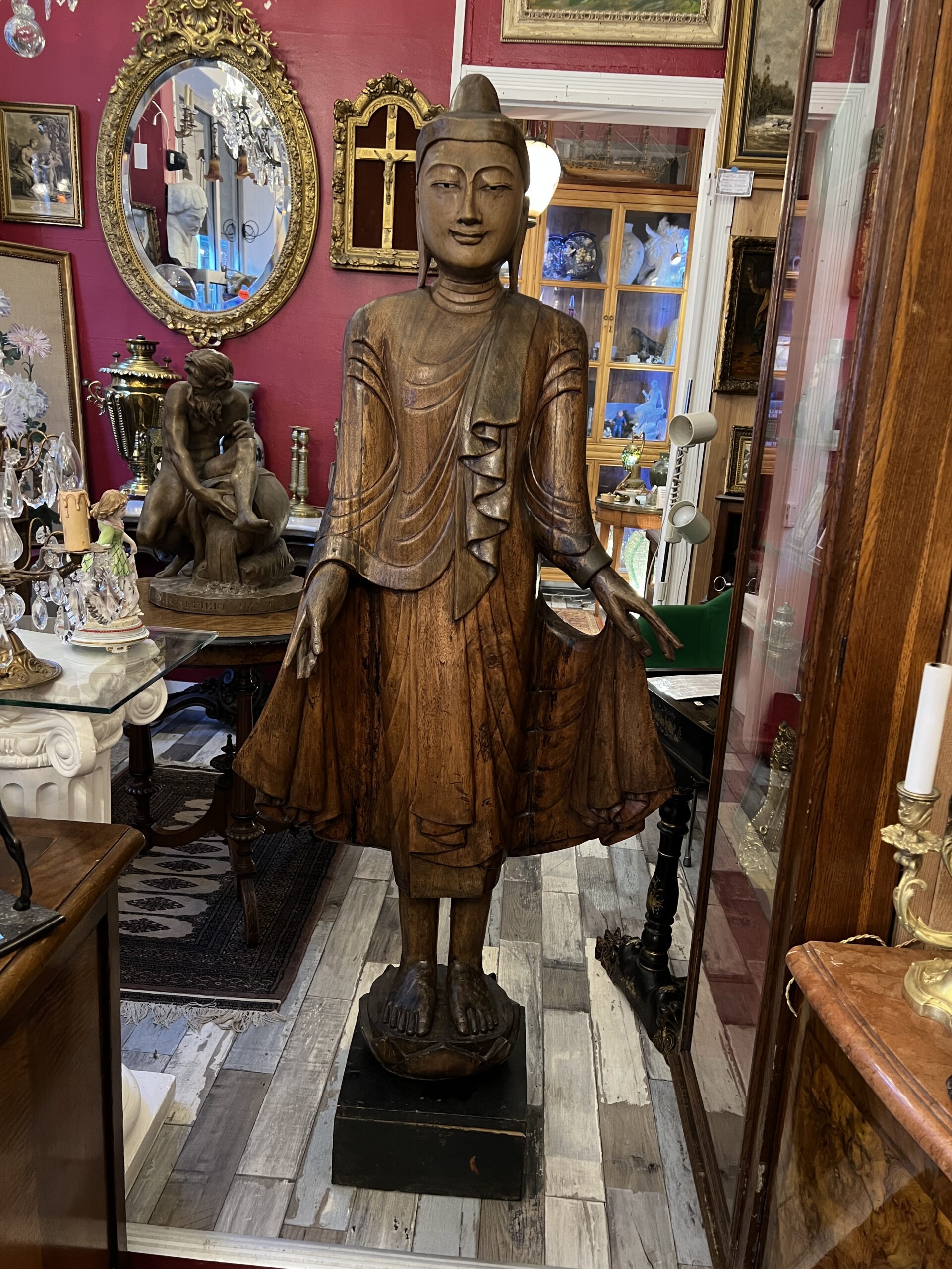 Avec une hauteur imposante de 167 cm, elle attire immédiatement l’attention par ses détails méticuleusement ciselés et son expression paisible, caractéristique des représentations bouddhistes.