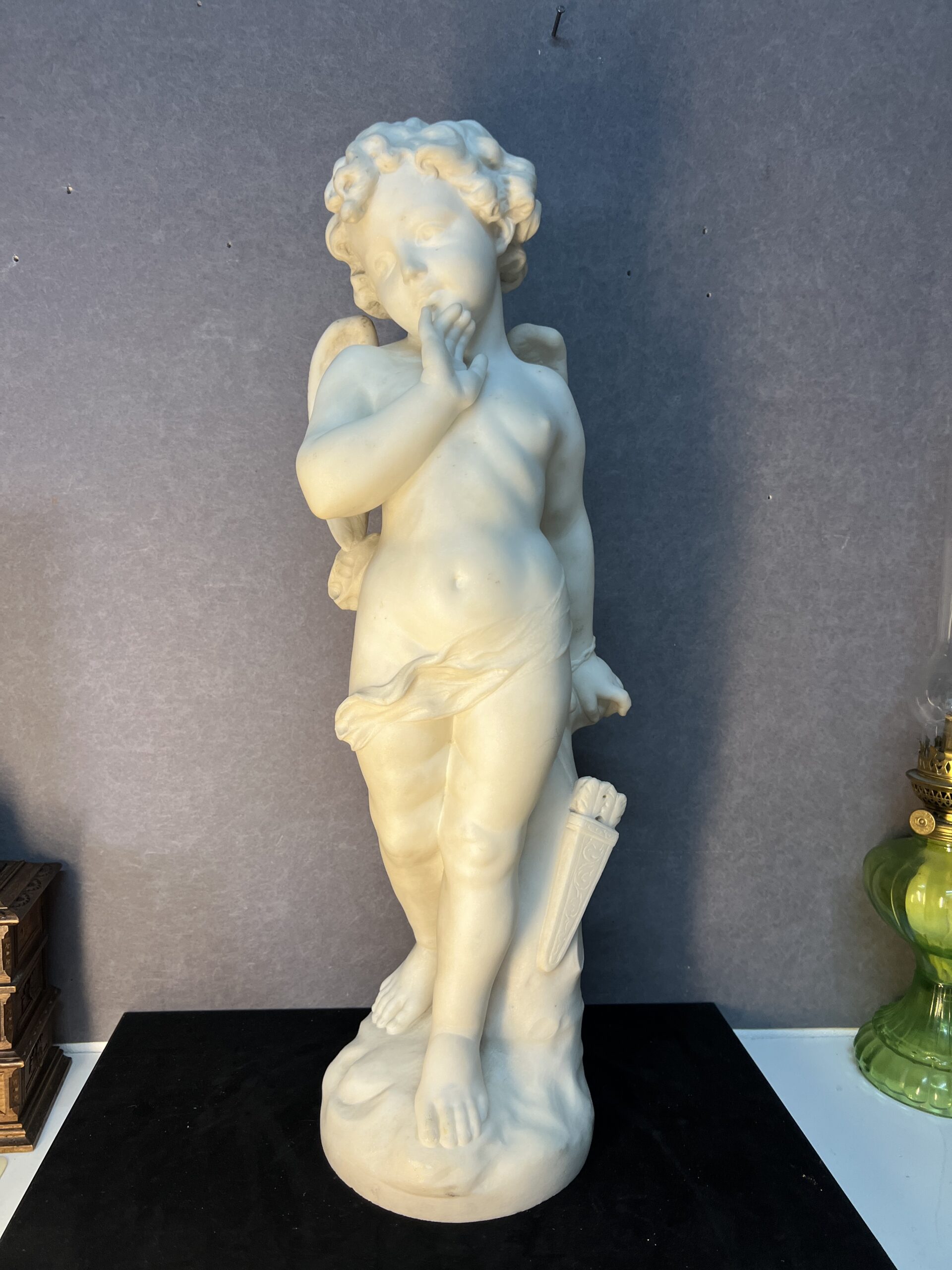 Cette sculpture en marbre, d’une hauteur de 59 cm, est une représentation exquise de Cupidon, signée par le talentueux Adolfo Cipriani.