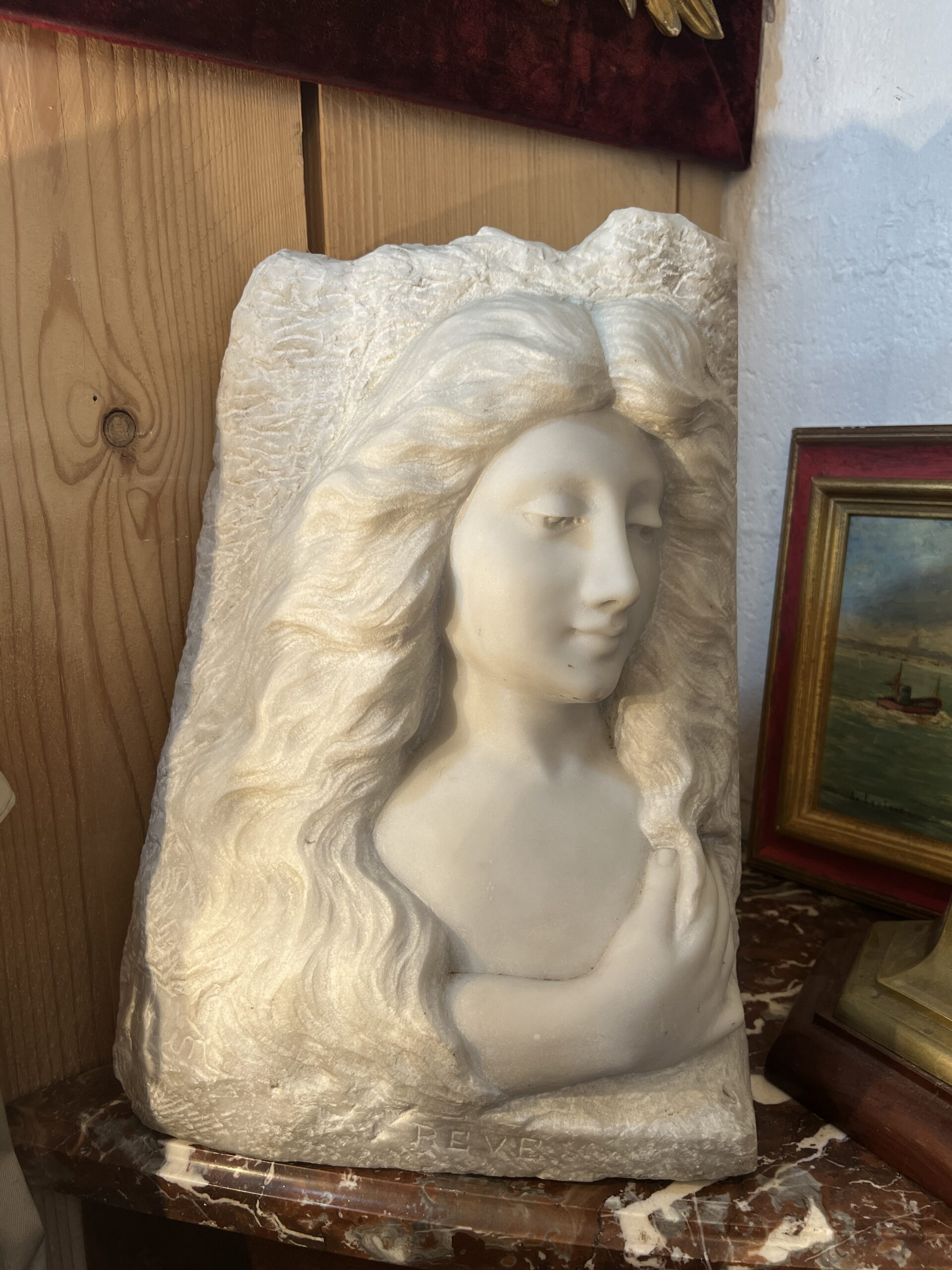 Le style Art nouveau, émergent à la fin du XIXe siècle, se caractérise par son rejet des formes géométriques rigides au profit de lignes organiques et de motifs inspirés par la nature. Ce buste incarne parfaitement ces principes, avec ses courbes fluides et ses détails floraux subtils qui encadrent le visage de la femme. L’Art nouveau était également une réaction contre les conventions académiques, privilégiant l’expression individuelle et la recherche de l’émotion. Dans “Rêve”, on ressent une certaine douceur mélancolique, comme si la femme représentée était perdue dans ses pensées les plus intimes.