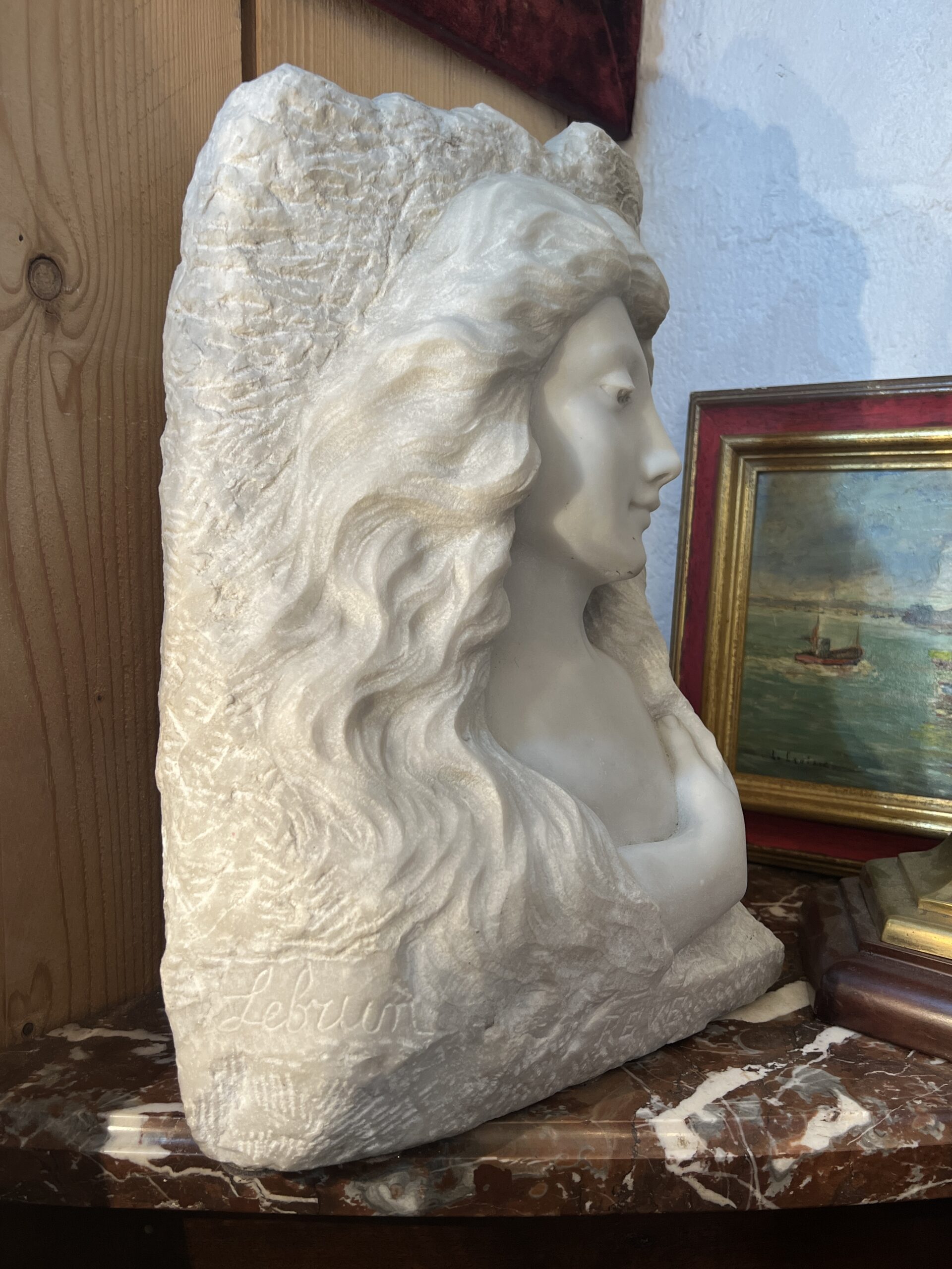 Le buste en marbre de Carrare de style Art nouveau, représentant un portrait de femme, est une pièce remarquable à bien des égards. Signé par l’artiste Lebrun et intitulé “Rêve”, il incarne l’esthétique et l’élégance caractéristiques de cette période artistique fascinante. Avec ses dimensions de 43 cm de hauteur et 30 cm de largeur, il occupe une place majestueuse où il capte immédiatement l’attention de l’observateur.