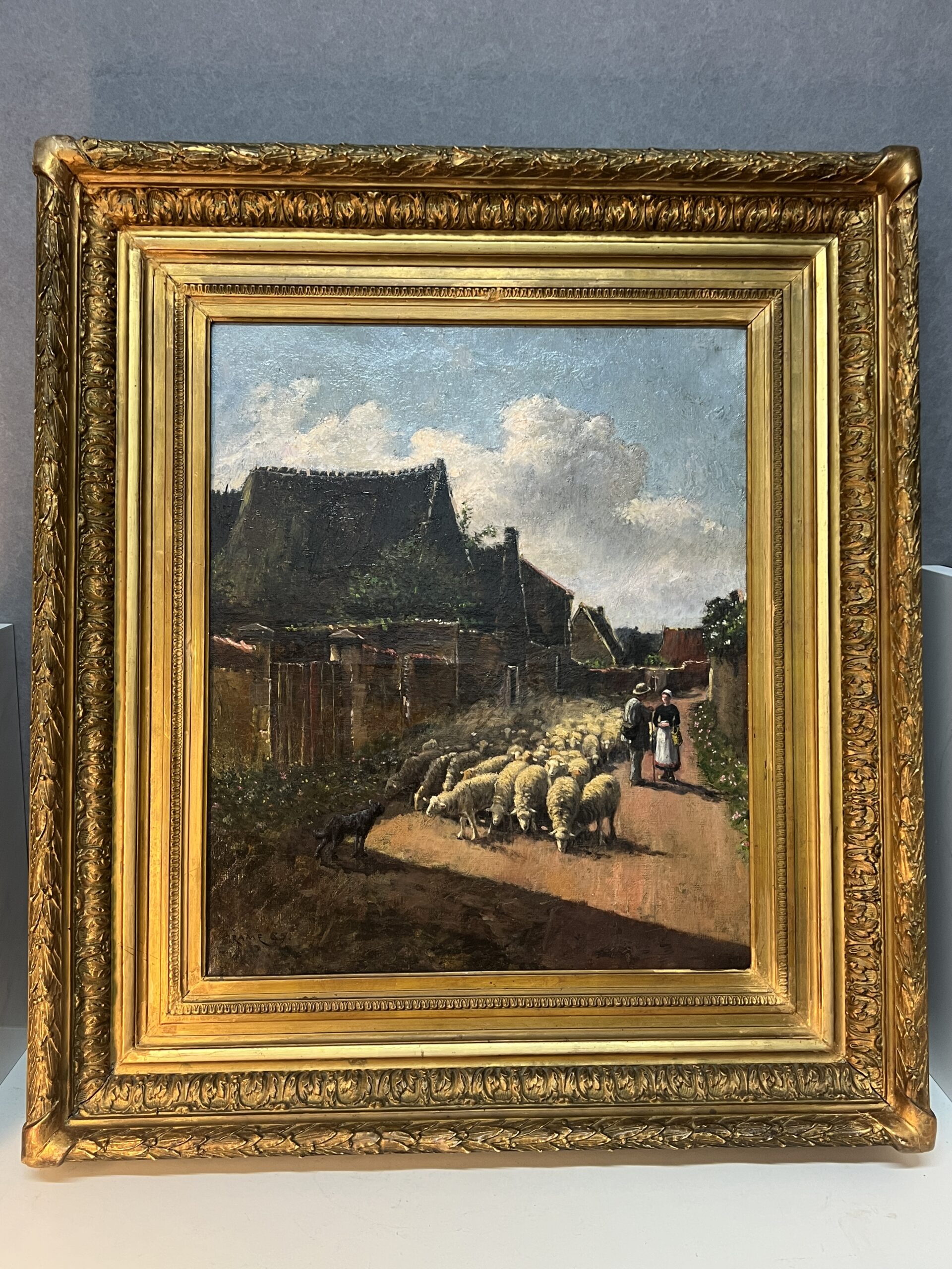 L’artiste a su capturer avec une grande finesse un moment de la vie rurale, où des bergers accompagnés de leurs moutons et de leur fidèle chien traversent une ruelle pittoresque d’un village.