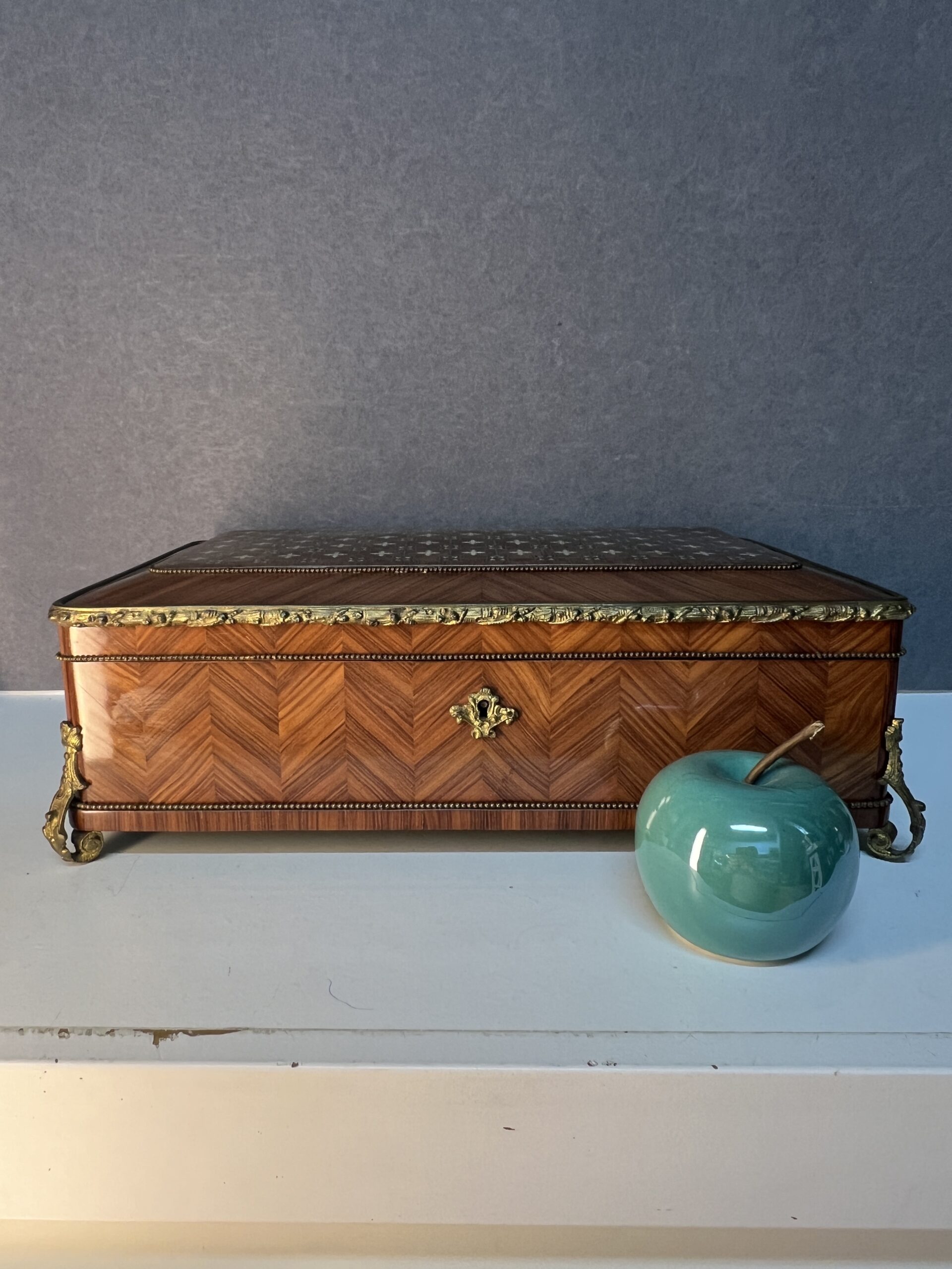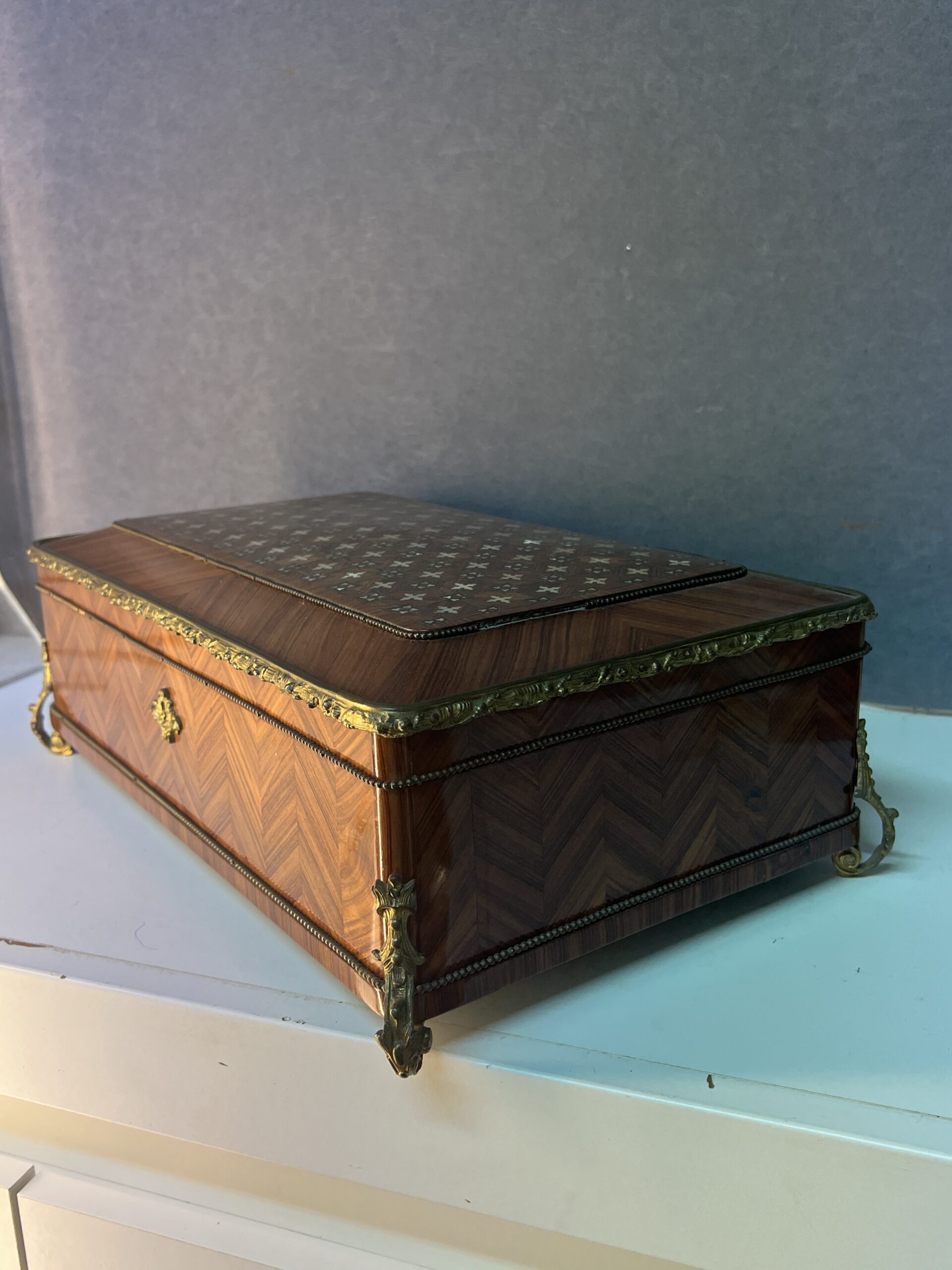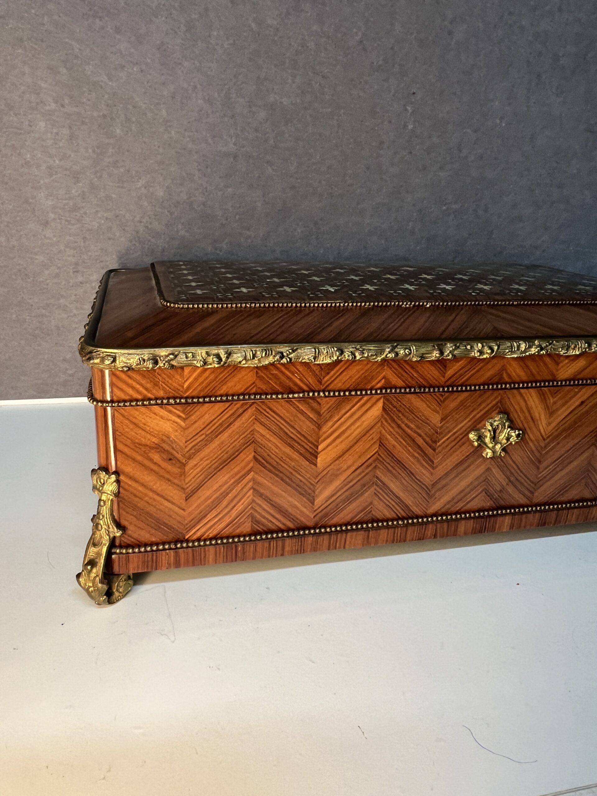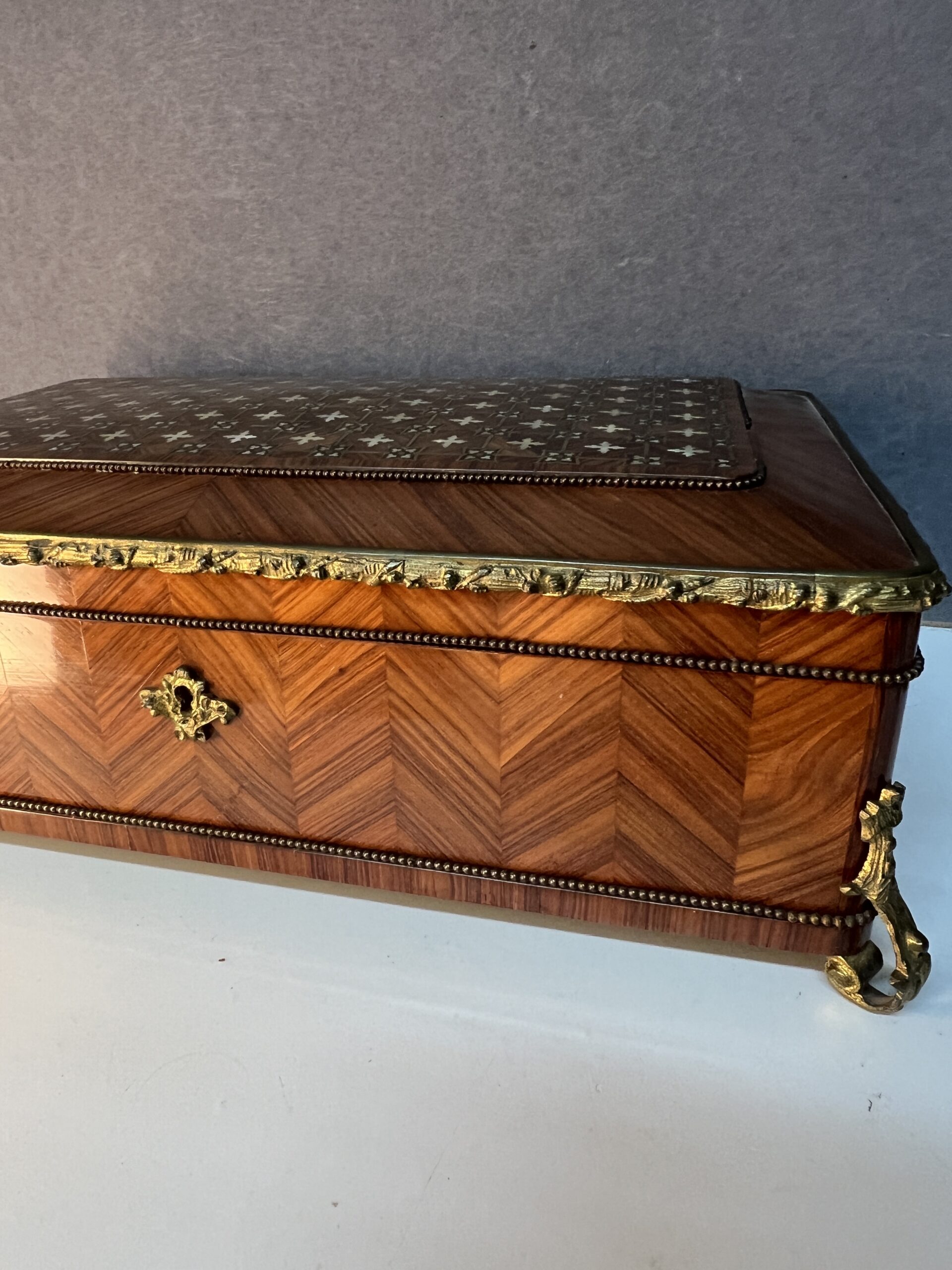 Lorsque vos yeux se posent sur cette merveille, ils sont immédiatement attirés par l’éclat du bronze ornant ses contours. Chaque motif, chaque courbe semble avoir été conçu avec une précision exquise, ajoutant une touche de sophistication à l’ensemble. Le dessus de la boîte, délicieusement garni de Marie, est une ode à la délicatesse, chaque détail en filet doré et incrustation de nacre témoignant du talent de l’artisan qui l’a créée.