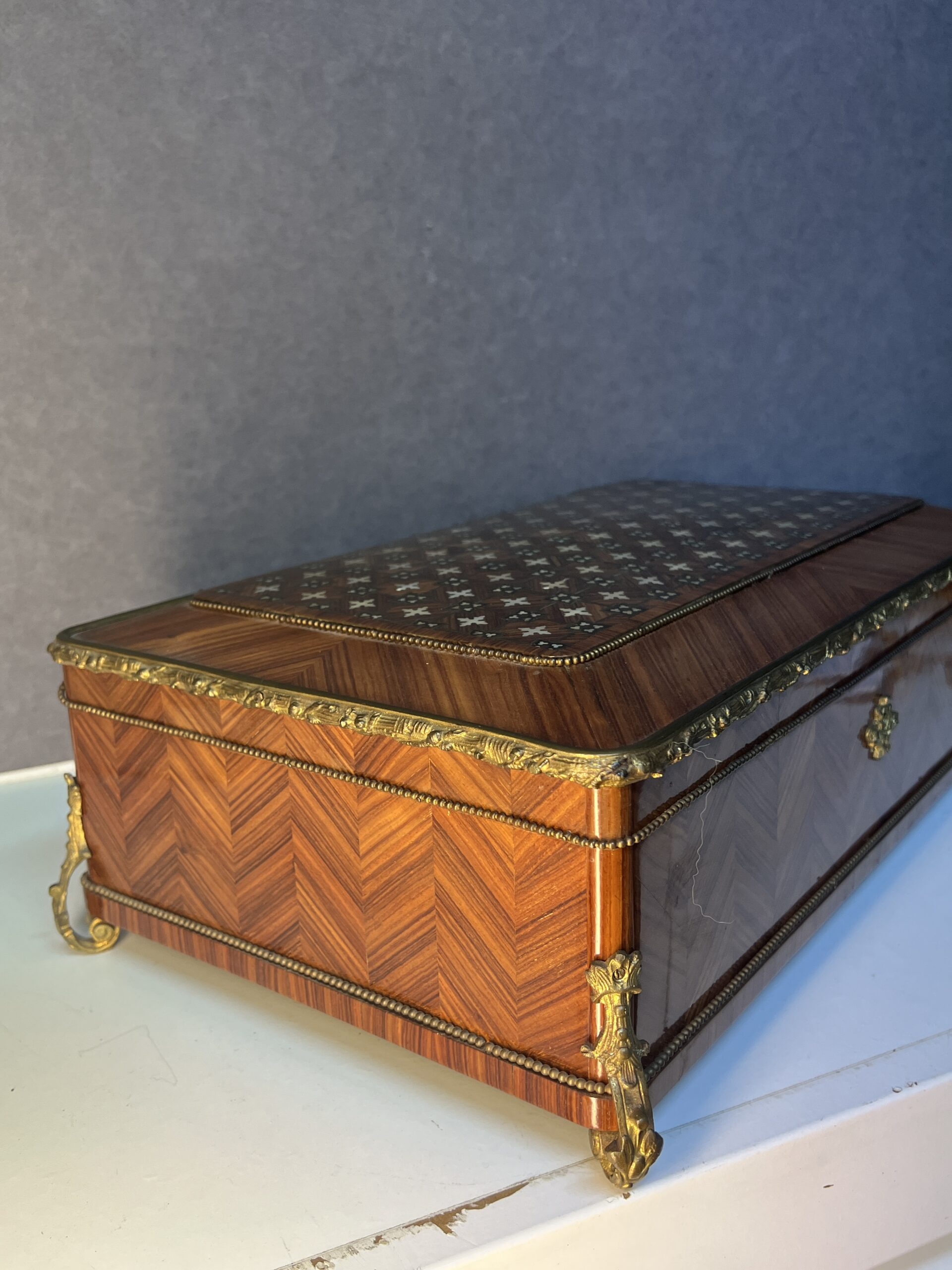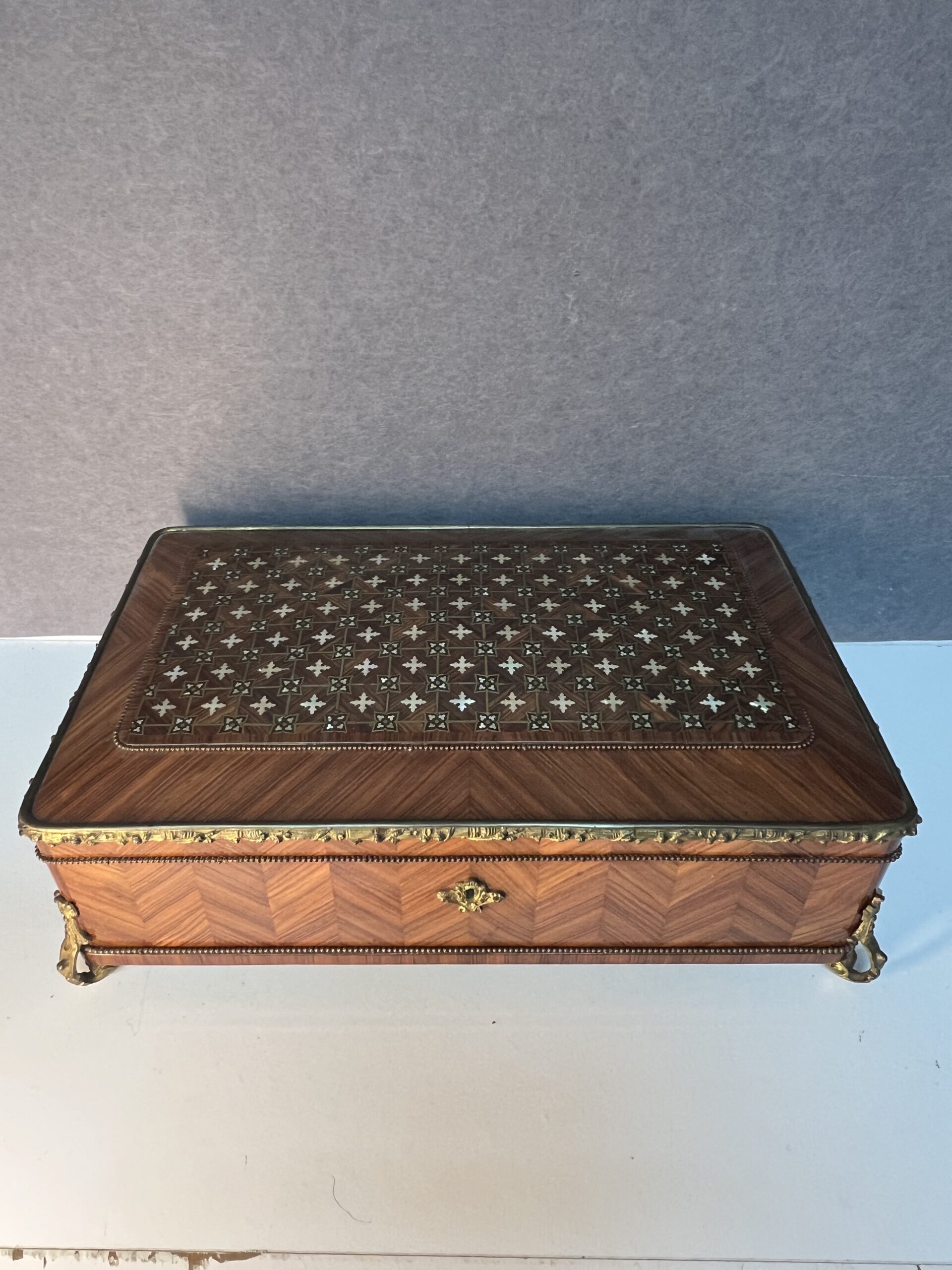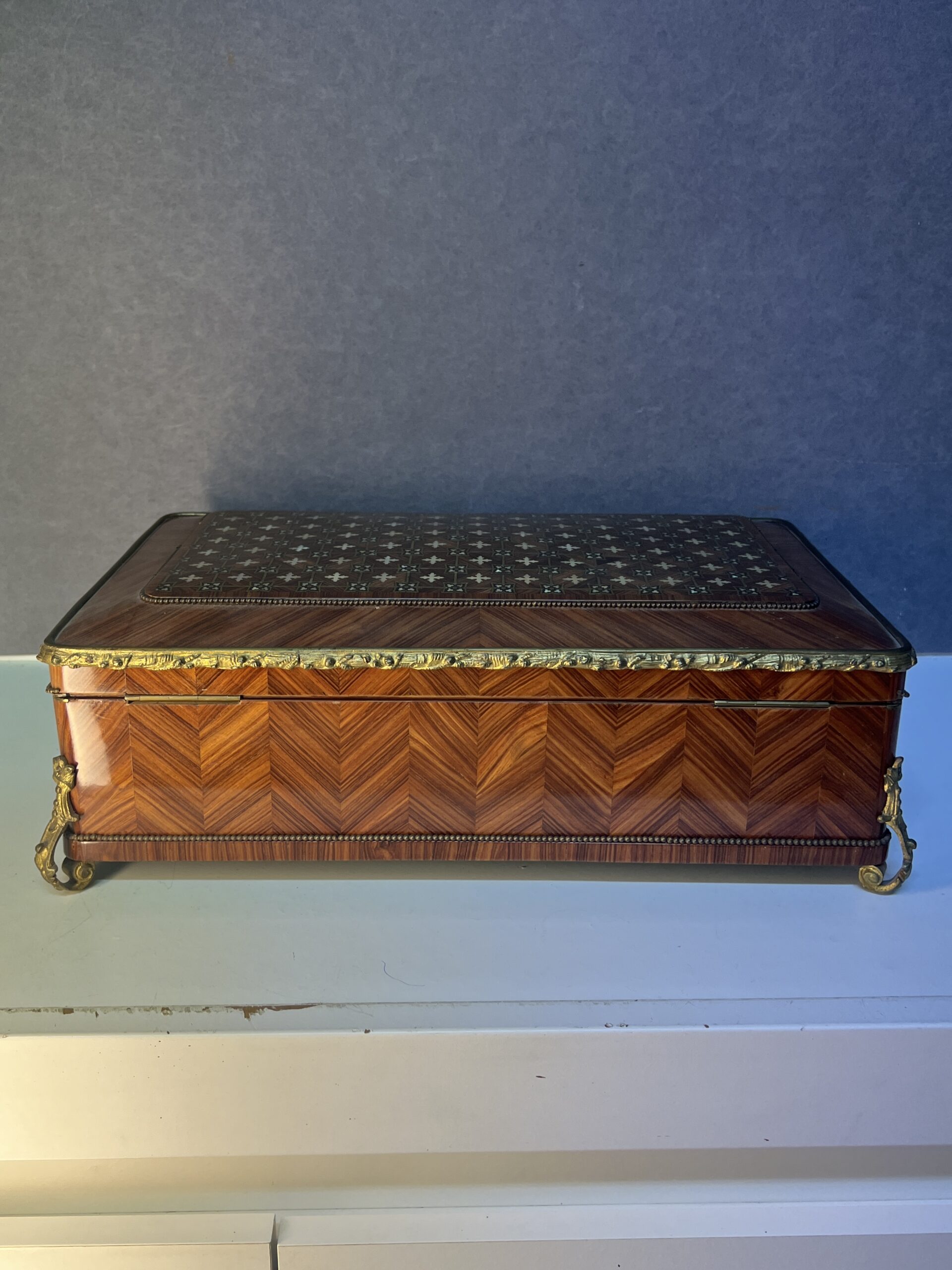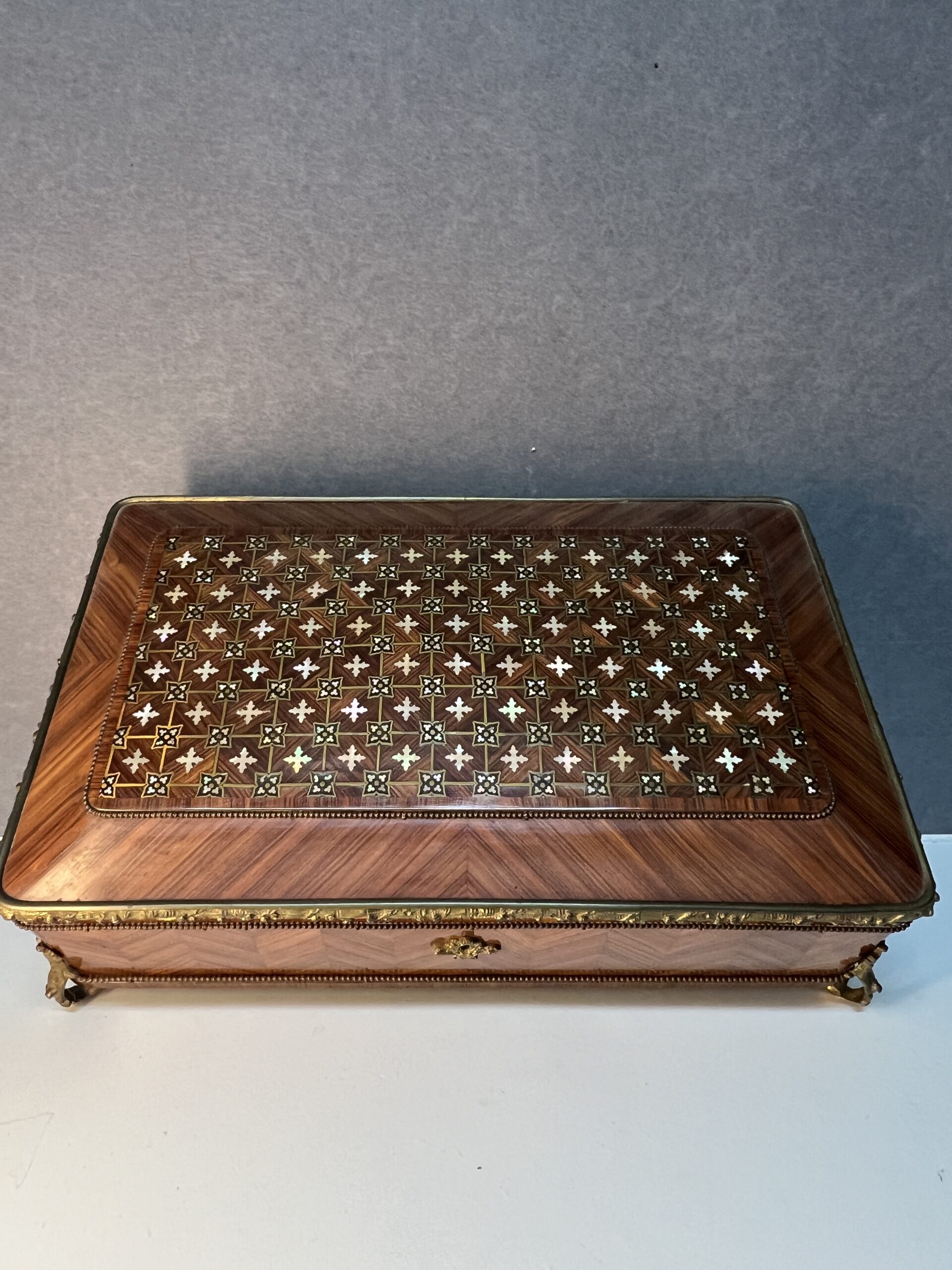 Lorsque vos yeux se posent sur cette merveille, ils sont immédiatement attirés par l’éclat du bronze ornant ses contours. Chaque motif, chaque courbe semble avoir été conçu avec une précision exquise, ajoutant une touche de sophistication à l’ensemble. Le dessus de la boîte, délicieusement garni de Marie, est une ode à la délicatesse, chaque détail en filet doré et incrustation de nacre témoignant du talent de l’artisan qui l’a créée.