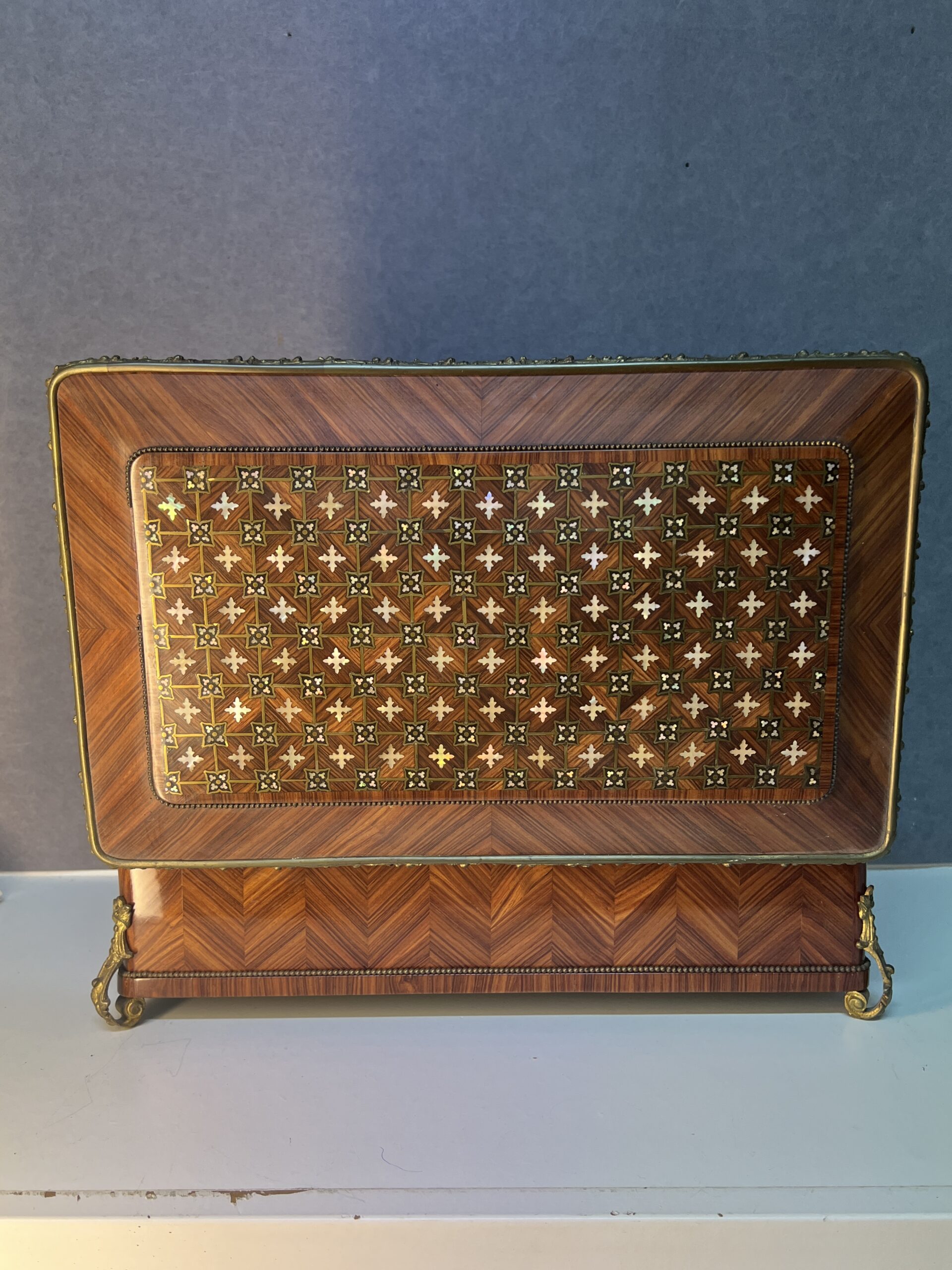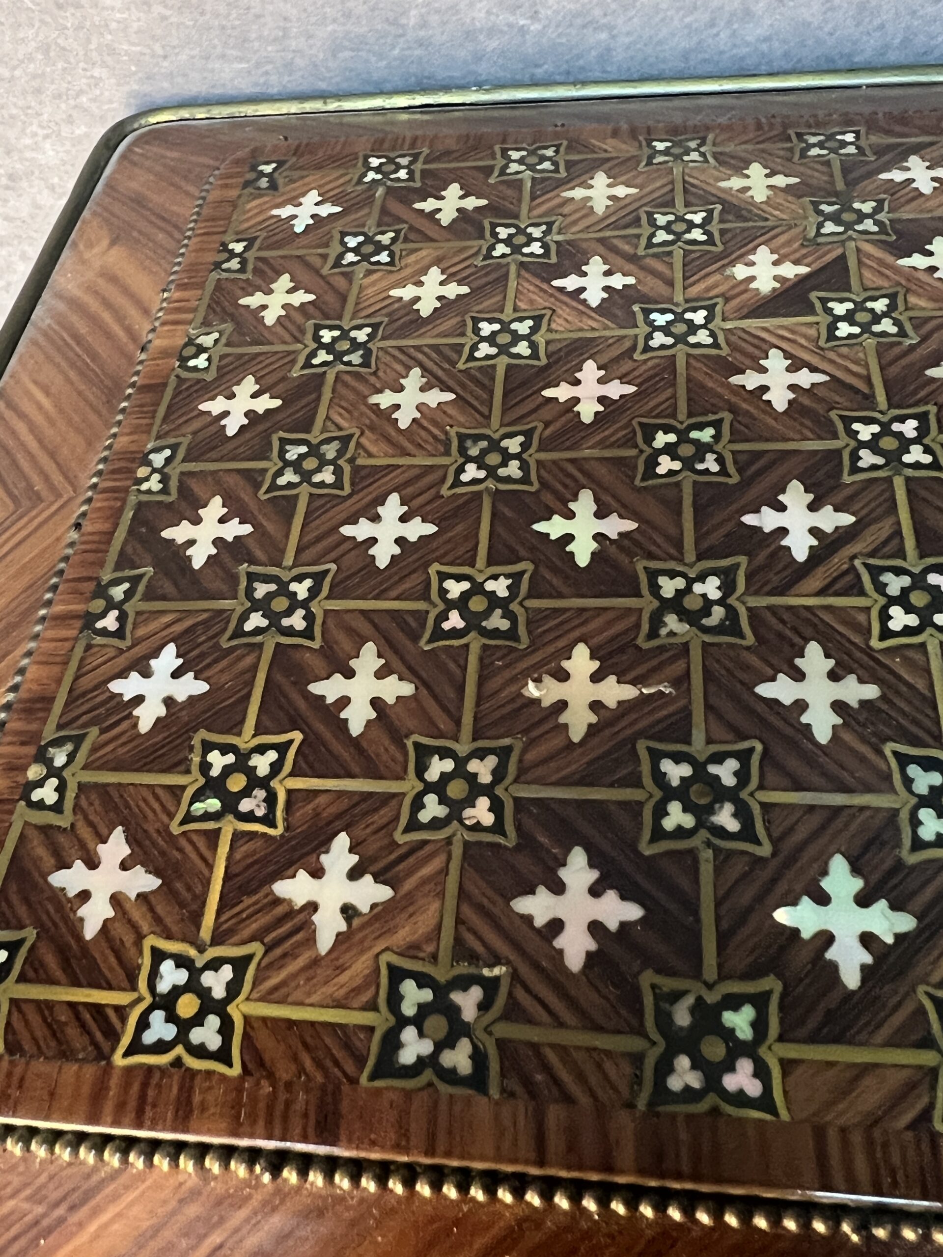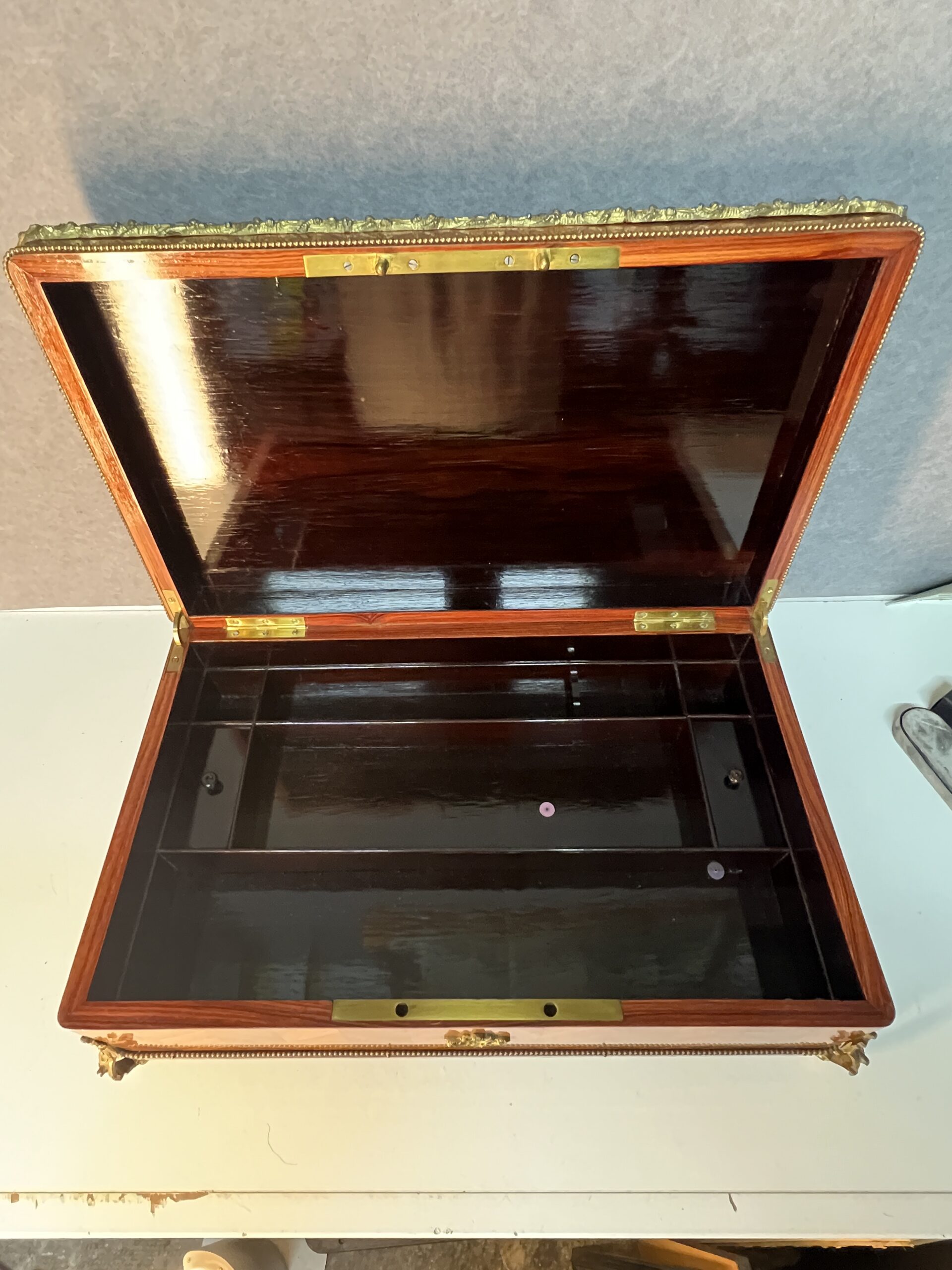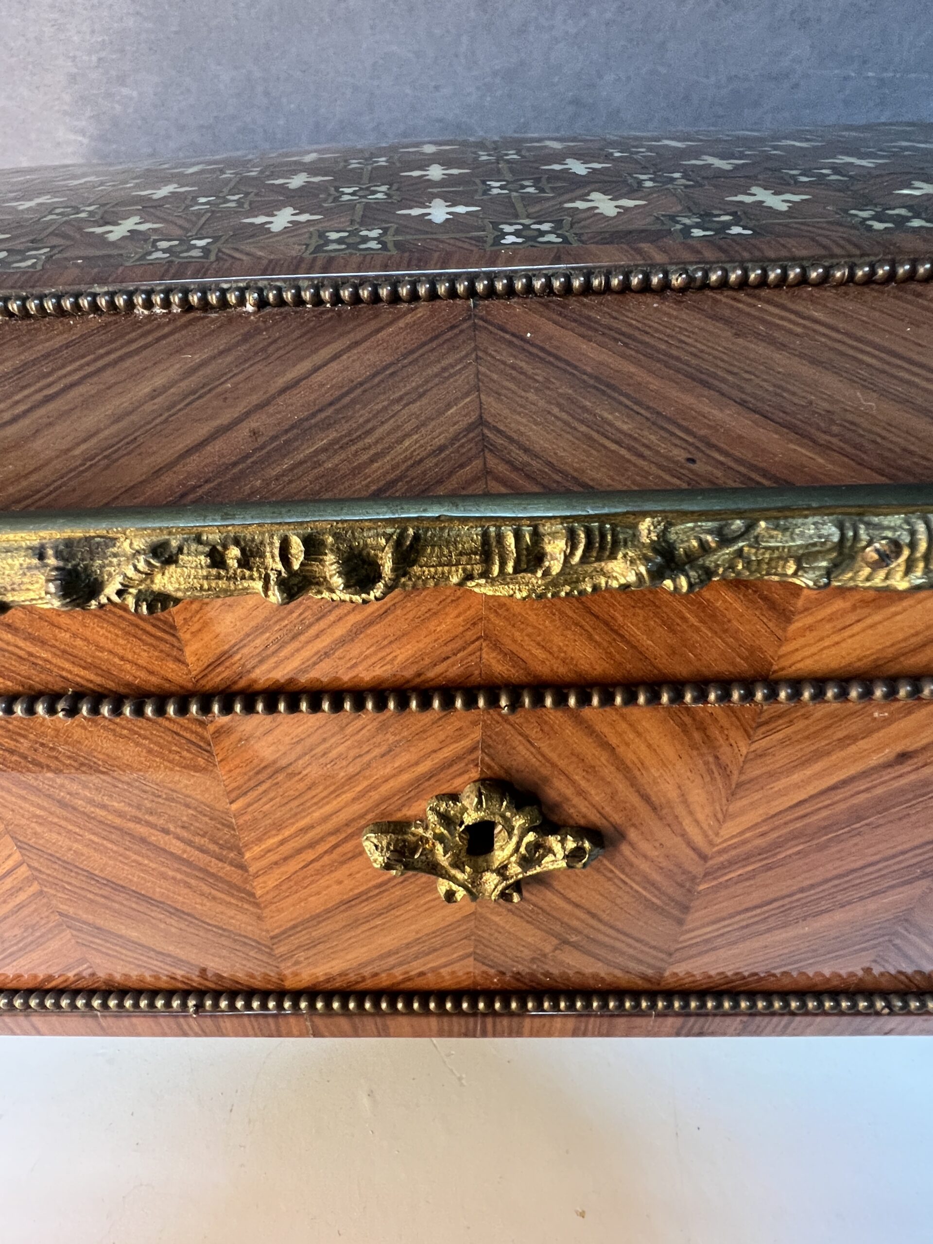 Lorsque vos yeux se posent sur cette merveille, ils sont immédiatement attirés par l’éclat du bronze ornant ses contours. Chaque motif, chaque courbe semble avoir été conçu avec une précision exquise, ajoutant une touche de sophistication à l’ensemble. Le dessus de la boîte, délicieusement garni de Marie, est une ode à la délicatesse, chaque détail en filet doré et incrustation de nacre témoignant du talent de l’artisan qui l’a créée.